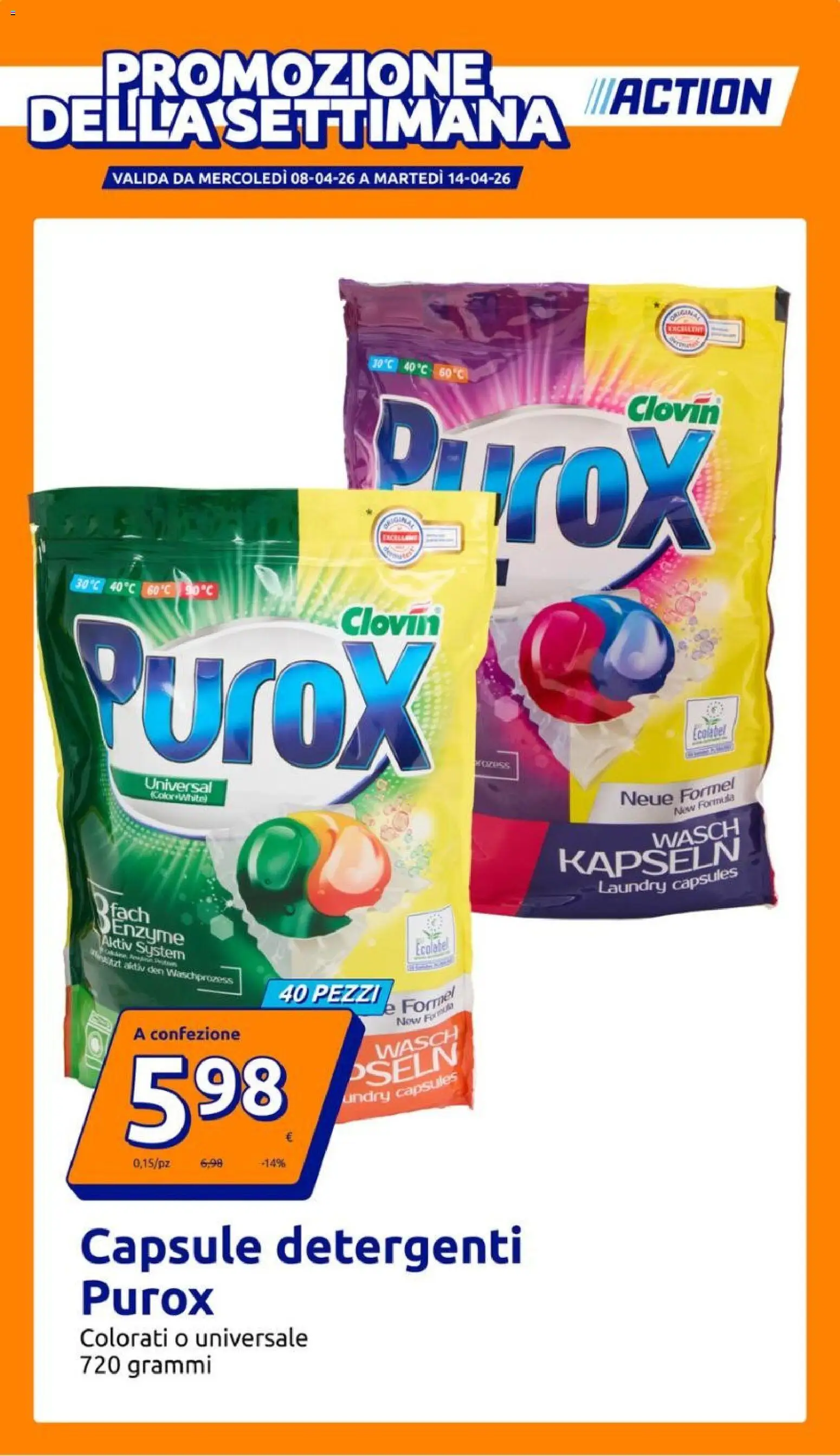 {"149647":[{"boxes":[{"content":"PROMOZIONE","coord":[[94,44],[453,43],[453,91],[94,91]]},{"content":"DELLA SETTIMANA","coord":[[23,87],[524,90],[523,136],[23,134]]},{"content":"\/IACTION","coord":[[538,69],[715,69],[715,109],[538,110]]},{"content":"DiTroX","coord":[[338,359],[663,394],[661,520],[326,478]]},{"content":"Clovin\u00ae","coord":[[578,362],[665,368],[664,393],[577,387]]},{"content":"Clovin","coord":[[314,557],[407,559],[406,588],[313,586]]},{"content":"PuroX","coord":[[71,567],[408,593],[404,714],[62,704]]},{"content":"Ecolabel","coord":[[638,671],[670,667],[672,680],[639,684]]},{"content":"KOPUSS","coord":[[439,699],[472,703],[471,712],[438,708]]},{"content":"Universal","coord":[[131,715],[196,719],[195,733],[130,729]]},{"content":"ColorWhite","coord":[[137,729],[193,733],[192,741],[137,737]]},{"content":"Neue Formel","coord":[[569,729],[679,714],[682,734],[570,747]]},{"content":"New Formula","coord":[[617,744],[678,729],[680,739],[619,754]]},{"content":"WASCH","coord":[[599,765],[682,752],[684,771],[601,785]]},{"content":"KAPSELN","coord":[[512,780],[685,769],[686,802],[513,811]]},{"content":"Rfach","coord":[[85,822],[142,838],[141,855],[82,855]]},{"content":"Laundry capsules","coord":[[548,809],[680,796],[682,818],[549,828]]},{"content":"Enzyme","coord":[[86,837],[172,856],[168,875],[85,862]]},{"content":"Aktiv System","coord":[[91,861],[172,874],[170,887],[89,873]]},{"content":"Ecolabel","coord":[[381,869],[415,865],[415,878],[383,883]]},{"content":"fat aktiv den Waschprozess","coord":[[100,883],[216,900],[215,910],[99,893]]},{"content":"40 PEZZI","coord":[[256,906],[353,907],[353,928],[256,927]]},{"content":"e Formel","coord":[[352,924],[421,907],[425,924],[354,937]]},{"content":"A confezione","coord":[[120,945],[222,946],[222,962],[120,962]]},{"content":"Now Formus","coord":[[360,938],[419,923],[420,934],[362,948]]},{"content":"WASCH","coord":[[338,962],[422,942],[426,961],[341,981]]},{"content":"DSELN","coord":[[320,982],[427,954],[432,983],[323,1007]]},{"content":"undry capsules","coord":[[302,1008],[422,986],[425,1003],[303,1023]]},{"content":"Capsule detergenti","coord":[[72,1129],[485,1128],[486,1175],[72,1177]]},{"content":"Purox","coord":[[72,1179],[201,1179],[201,1217],[72,1217]]},{"content":"Colorati o universale","coord":[[71,1222],[286,1222],[286,1247],[71,1247]]}]}]}Le promozioni sono valide dal 08/04/2026 - 14/04/2026, ma fai attenzione: gli sconti sono limitati nel tempo e i prodotti più richiesti potrebbero terminare presto. Non perdere l’occasione di scoprire cosa Action ha preparato per te questa settimana: prezzi imbattibili e qualità garantita!
