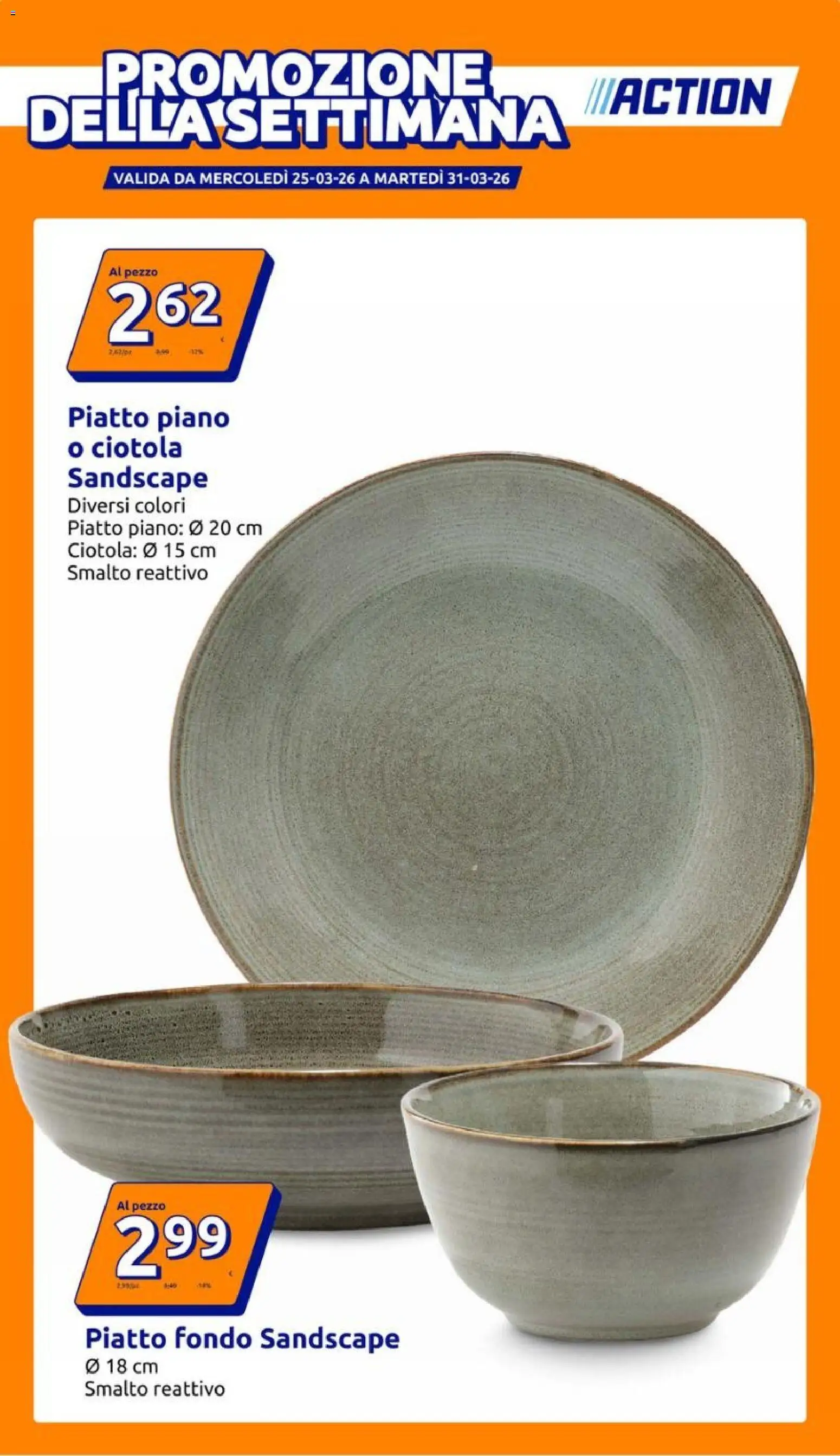 {"147736":[{"boxes":[{"content":"PROMOZIONE","coord":[[96,44],[452,43],[452,91],[96,92]]},{"content":"DELLA SETTIMANA","coord":[[24,84],[525,84],[524,141],[24,138]]},{"content":"IIIACTION","coord":[[538,69],[715,69],[715,109],[538,109]]},{"content":"Al pezzo","coord":[[98,245],[144,245],[145,255],[98,256]]},{"content":"Piatto piano","coord":[[61,372],[211,373],[211,398],[61,397]]},{"content":"o ciotola","coord":[[59,403],[169,400],[169,423],[60,426]]},{"content":"Sandscape","coord":[[60,429],[194,429],[194,454],[60,453]]},{"content":"Diversi colori","coord":[[60,456],[172,456],[172,476],[60,476]]},{"content":"Piatto piano \u00d8 20 cm","coord":[[60,477],[242,477],[242,497],[60,496]]},{"content":"Ciotola \u00d8 15 cm","coord":[[60,497],[199,498],[199,517],[60,517]]},{"content":"Smalto reattivo","coord":[[60,520],[192,519],[192,537],[60,537]]},{"content":"Al pezzo","coord":[[107,1107],[153,1107],[153,1117],[107,1118]]},{"content":"Piatto fondo Sandscape","coord":[[75,1222],[372,1223],[371,1251],[75,1248]]},{"content":"\u00d8 18 cm","coord":[[76,1251],[148,1253],[147,1270],[75,1267]]},{"content":"Smalto reattivo","coord":[[76,1272],[207,1272],[207,1291],[76,1291]]}]}]}Le promozioni sono valide dal 25/03/2026 - 31/03/2026, ma fai attenzione: gli sconti sono limitati nel tempo e i prodotti più richiesti potrebbero terminare presto. Non perdere l’occasione di scoprire cosa Action ha preparato per te questa settimana: prezzi imbattibili e qualità garantita!