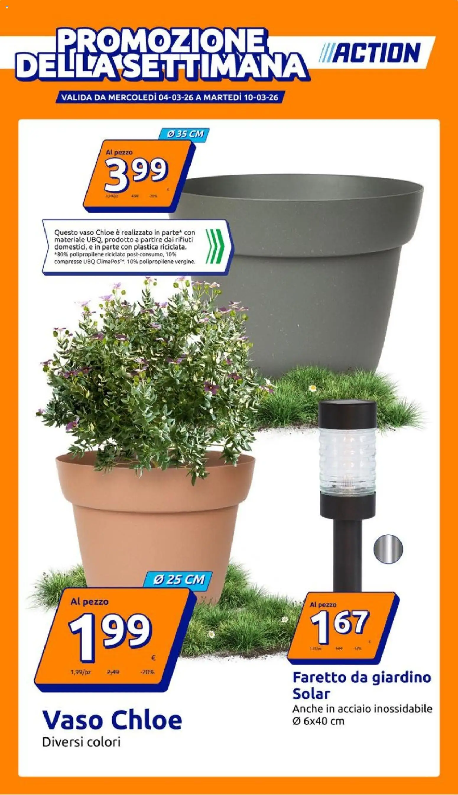 {"144731":[{"boxes":[{"content":"PROMOZIONE","coord":[[94,44],[452,44],[452,90],[94,91]]},{"content":"DELLA SETTIMANA","coord":[[27,84],[525,84],[525,141],[27,138]]},{"content":"ACTION","coord":[[546,70],[713,69],[713,106],[546,107]]},{"content":"\u00d8 35 CM","coord":[[280,217],[353,217],[353,234],[280,234]]},{"content":"Al pezzo","coord":[[178,252],[224,251],[224,261],[178,262]]},{"content":"Questo vaso Chloe \u00e8 realizzato in parte* con","coord":[[91,386],[330,386],[330,399],[91,399]]},{"content":"materiale UBQ, prodotto a partire dai rifiuti","coord":[[91,399],[327,399],[327,411],[91,411]]},{"content":"domestici, e in parte con plastica riciclata.","coord":[[92,411],[314,411],[314,423],[92,423]]},{"content":"\u00d8 25 CM","coord":[[255,969],[348,969],[348,990],[255,990]]},{"content":"Al pezzo","coord":[[116,1007],[184,1009],[184,1026],[116,1025]]},{"content":"Al pezzo","coord":[[523,1017],[568,1017],[568,1026],[523,1026]]},{"content":"Faretto da giardino","coord":[[494,1131],[730,1131],[730,1158],[494,1158]]},{"content":"Solar","coord":[[494,1162],[560,1160],[560,1184],[494,1183]]},{"content":"Vaso Chloe","coord":[[71,1196],[310,1196],[310,1236],[71,1237]]},{"content":"Anche in acciaio inossidabile","coord":[[493,1188],[732,1187],[732,1207],[493,1208]]},{"content":"Diversi colori","coord":[[69,1242],[204,1242],[204,1265],[69,1265]]}]}]}Le promozioni sono valide dal 04/03/2026 - 10/03/2026, ma fai attenzione: gli sconti sono limitati nel tempo e i prodotti più richiesti potrebbero terminare presto. Non perdere l’occasione di scoprire cosa Action ha preparato per te questa settimana: prezzi imbattibili e qualità garantita!