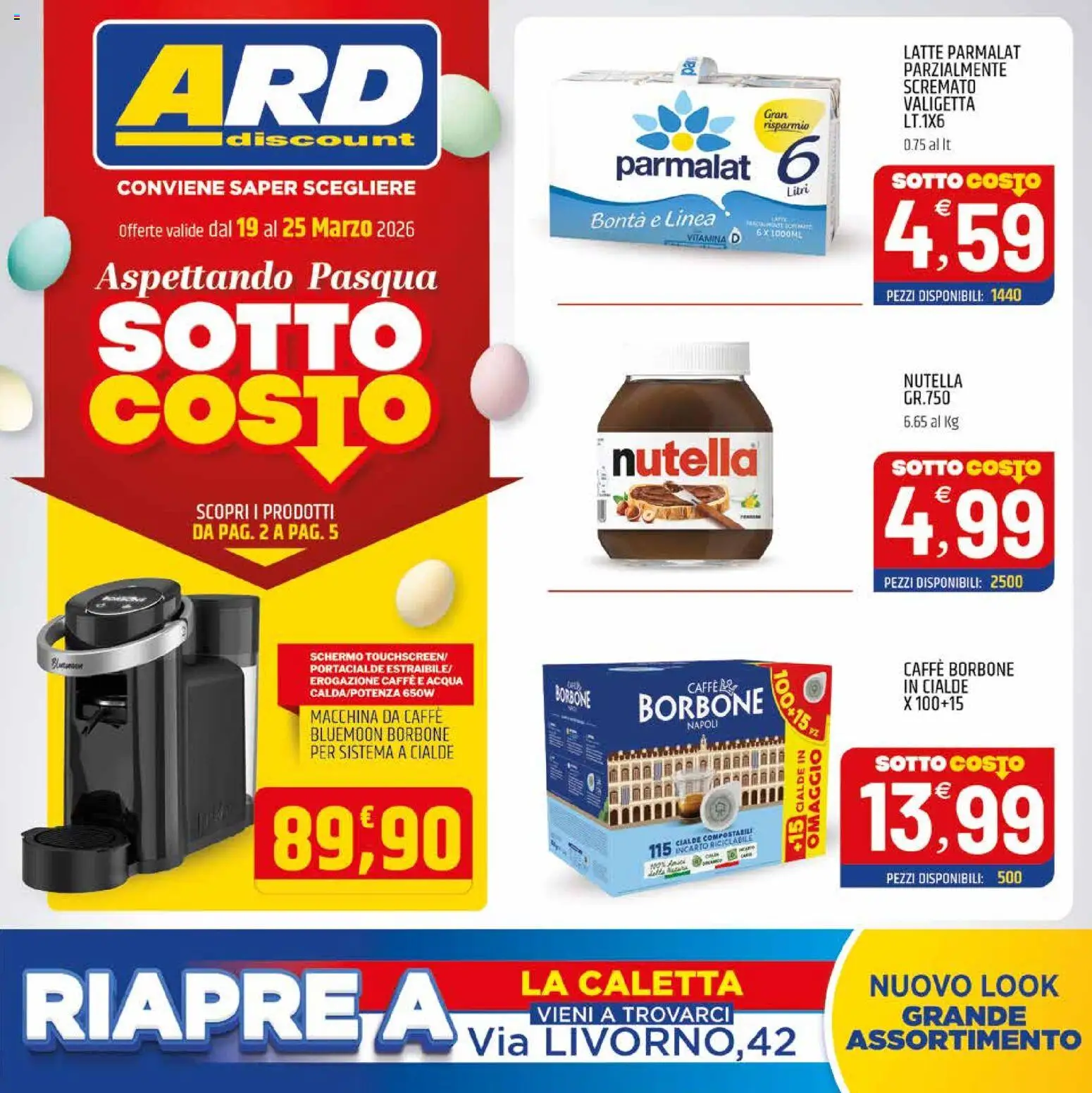 {"146195":[{"boxes":[{"content":"LATTE PARMALAT","coord":[[639,30],[725,29],[725,42],[639,42]]},{"content":"PARZIALMENTE","coord":[[639,43],[716,43],[716,55],[639,55]]},{"content":"SCREMATO","coord":[[640,55],[692,56],[692,66],[640,66]]},{"content":"VALIGETTA","coord":[[639,67],[693,68],[693,79],[639,78]]},{"content":"Gran","coord":[[542,76],[560,77],[559,84],[541,84]]},{"content":"risparmio","coord":[[541,85],[575,86],[575,93],[541,92]]},{"content":"discount","coord":[[156,92],[294,92],[294,105],[156,105]]},{"content":"parmalat","coord":[[435,107],[534,107],[534,128],[435,129]]},{"content":"CONVIENE SAPER SCEGLIERE","coord":[[82,125],[295,125],[295,140],[82,140]]},{"content":"SOTTO COSTO","coord":[[633,120],[737,120],[737,136],[633,136]]},{"content":"Litri","coord":[[558,132],[576,130],[576,139],[558,141]]},{"content":"Bont\u00e0 e Linea","coord":[[419,148],[508,148],[509,162],[419,163]]},{"content":"VITAMINA","coord":[[487,165],[516,166],[515,172],[487,171]]},{"content":"Aspettando Pasqua","coord":[[67,181],[315,182],[315,212],[67,211]]},{"content":"SOTTO","coord":[[67,210],[302,209],[302,263],[67,265]]},{"content":"COSTO","coord":[[58,261],[308,261],[308,329],[58,328]]},{"content":"NUTELLA","coord":[[639,263],[684,264],[684,276],[639,275]]},{"content":"nutella\u00ae","coord":[[431,310],[540,306],[540,340],[432,343]]},{"content":"SOTTO COSTO","coord":[[633,323],[739,323],[739,340],[633,340]]},{"content":"SCOPRI I PRODOTTI","coord":[[136,355],[238,355],[238,370],[136,370]]},{"content":"DA PAG. 2 A PAG. 5","coord":[[134,370],[240,369],[240,383],[134,384]]},{"content":"SCHERMO TOUCHSCREEN\/","coord":[[218,461],[317,461],[317,469],[218,469]]},{"content":"PORTACIALDE ESTRAIBILE\/","coord":[[219,470],[322,470],[322,478],[219,478]]},{"content":"CAFF\u00c8 BORBONE","coord":[[640,467],[721,468],[721,481],[640,481]]},{"content":"EROGAZIONE CAFF\u00c8 E ACQUA","coord":[[219,478],[329,478],[329,486],[219,486]]},{"content":"BORBONE","coord":[[394,484],[421,488],[420,502],[393,498]]},{"content":"CAFFE L&","coord":[[486,483],[523,481],[523,489],[487,492]]},{"content":"IN CIALDE","coord":[[639,481],[689,481],[688,493],[639,492]]},{"content":"MACCHINA DA CAFF\u00c8","coord":[[218,500],[315,500],[315,513],[218,513]]},{"content":"BORBONE","coord":[[452,492],[541,486],[543,507],[452,513]]},{"content":"BLUEMOON BORBONE","coord":[[217,514],[321,515],[321,526],[217,526]]},{"content":"NAPOLI","coord":[[487,511],[509,509],[510,516],[487,518]]},{"content":"PER SISTEMA A CIALDE","coord":[[217,527],[324,528],[324,539],[217,538]]},{"content":"SOTTO COSTO","coord":[[619,533],[726,534],[726,550],[619,548]]},{"content":"CIALDE COMPOSTABILI","coord":[[478,595],[534,585],[535,591],[479,601]]},{"content":"INCARTO RICICLABILE","coord":[[478,601],[534,590],[535,596],[479,606]]},{"content":"OMAGGIO","coord":[[572,602],[573,531],[583,531],[582,602]]},{"content":"15 CIALDE IN","coord":[[559,606],[562,530],[573,531],[571,606]]},{"content":"RIAPRE A","coord":[[12,685],[323,684],[323,745],[12,745]]},{"content":"LA CALETTA","coord":[[365,685],[528,686],[528,708],[365,708]]},{"content":"NUOVO LOOK","coord":[[614,688],[753,688],[753,708],[614,709]]},{"content":"VIENI A TROVARCI","coord":[[376,710],[520,710],[520,727],[376,727]]},{"content":"Via LIVORNO,42","coord":[[330,726],[567,726],[567,751],[330,751]]},{"content":"GRANDE","coord":[[640,711],[731,711],[731,728],[640,729]]},{"content":"ASSORTIMENTO","coord":[[598,729],[767,729],[767,746],[598,747]]}]}]}Le offerte sono valide dal 19/03/2026 - 25/03/2026, ma attenzione: gli sconti sono disponibili solo per un periodo limitato! Sfoglia subito il volantino e scopri prezzi straordinari su frutta e verdura, carne e pesce, latticini e prodotti da forno. Ogni settimana, ARD Discount ti garantisce la massima qualità a prezzi imbattibili.