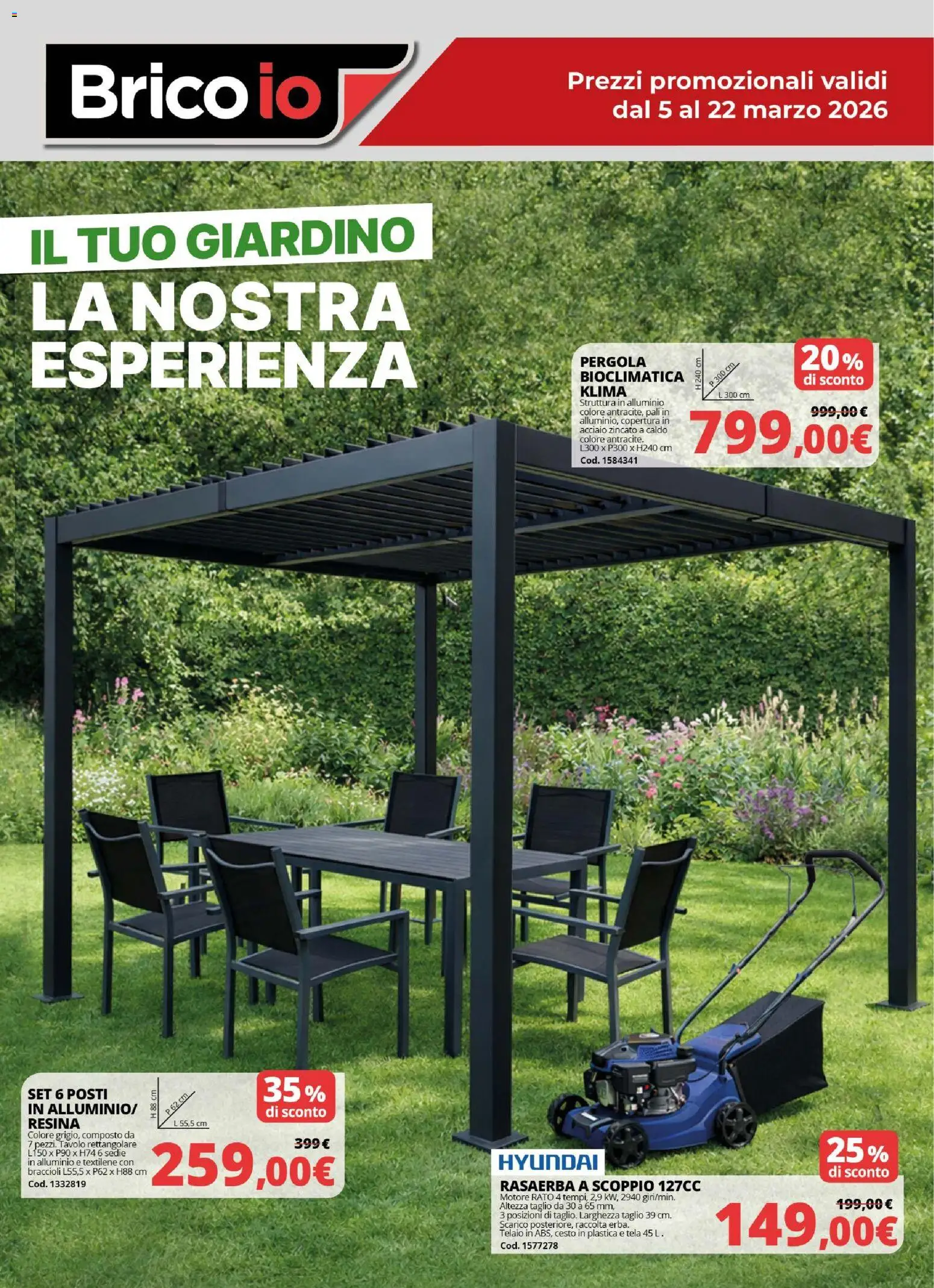 {"144932":[{"boxes":[{"content":"Brico io","coord":[[56,49],[264,49],[264,103],[56,103]]},{"content":"Prezzi promozionali validi","coord":[[469,56],[737,55],[737,77],[469,78]]},{"content":"IL TUO GIARDINO","coord":[[20,186],[346,177],[347,213],[21,224]]},{"content":"LA NOSTRA","coord":[[23,230],[340,230],[340,278],[23,278]]},{"content":"ESPERIENZA","coord":[[24,279],[347,279],[347,325],[24,325]]},{"content":"PERGOLA","coord":[[479,294],[537,293],[537,304],[480,305]]},{"content":"BIOCLIMATICA","coord":[[479,305],[568,305],[568,318],[479,318]]},{"content":"KLIMA","coord":[[480,319],[520,319],[520,329],[480,329]]},{"content":"di sconto","coord":[[664,309],[716,310],[716,321],[664,320]]},{"content":"Struttura in alluminio","coord":[[480,330],[551,329],[551,337],[480,337]]},{"content":"colore antracite, pali in","coord":[[480,338],[555,338],[555,345],[480,345]]},{"content":"alluminio, copertura in","coord":[[480,345],[555,345],[555,353],[480,353]]},{"content":"acciaio zincato a caldo","coord":[[480,353],[553,353],[553,360],[480,360]]},{"content":"colore antracite.","coord":[[480,360],[533,360],[533,367],[480,368]]},{"content":"SET 6 POSTI","coord":[[23,901],[88,901],[88,912],[23,912]]},{"content":"IN ALLUMINIO\/","coord":[[23,913],[117,914],[117,926],[23,924]]},{"content":"RESINA","coord":[[21,926],[66,925],[66,936],[22,937]]},{"content":"P62cm","coord":[[127,922],[154,898],[163,910],[138,934]]},{"content":"di sconto","coord":[[221,916],[269,916],[269,928],[221,927]]},{"content":"Colore grigio, composto da","coord":[[22,937],[111,937],[111,945],[22,945]]},{"content":"7 pezzi. Tavolo rettangolare","coord":[[22,945],[113,945],[113,953],[22,953]]},{"content":"in alluminio e textilene con","coord":[[22,960],[111,960],[111,968],[22,967]]},{"content":"HYUNDAI","coord":[[411,955],[495,955],[495,972],[411,972]]},{"content":"di sconto","coord":[[687,966],[739,966],[739,978],[687,978]]},{"content":"Altezza taglio da 30 \u00e0 65 mm,","coord":[[414,996],[510,996],[510,1004],[414,1004]]},{"content":"3 posizioni di taglio. Larghezza taglio 39 cm.","coord":[[413,1004],[557,1004],[557,1012],[413,1012]]},{"content":"Scarico posteriore, raccolta erba.","coord":[[414,1012],[523,1012],[523,1019],[414,1020]]}]}]}Le promozioni sono valide dal 05/03/2026 - 22/03/2026, ma fai attenzione: gli sconti sono limitati nel tempo e i prodotti più richiesti potrebbero terminare presto. Non perdere l’occasione di scoprire cosa Brico io ha preparato per te questa settimana: prezzi imbattibili e qualità garantita!