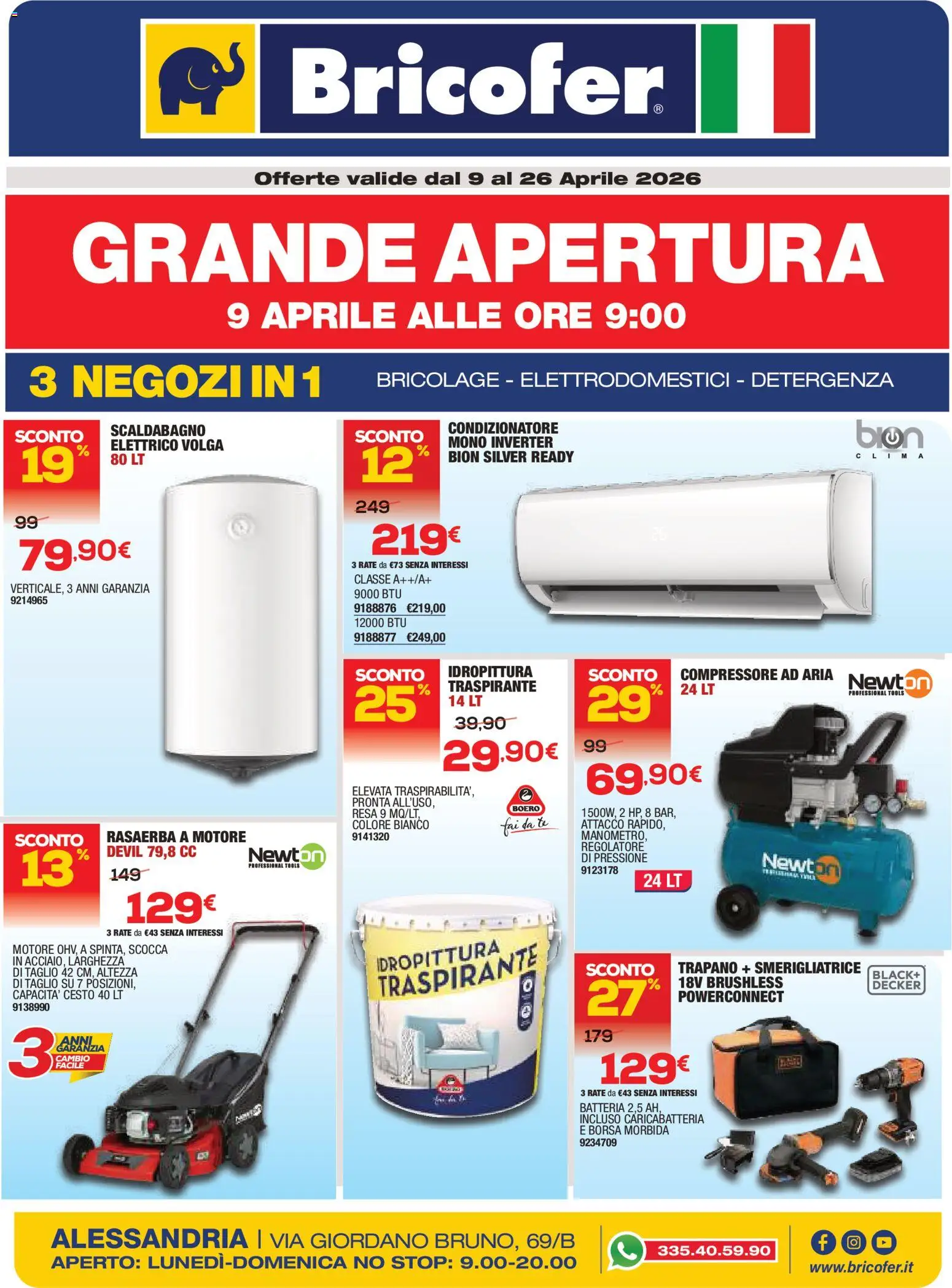 {"150226":[{"boxes":[{"content":"Bricofer\u00ae","coord":[[233,32],[547,30],[547,97],[233,98]]},{"content":"GRANDE APERTURA","coord":[[58,176],[720,176],[720,234],[58,234]]},{"content":"3 NEGOZI IN 1","coord":[[22,294],[265,294],[265,325],[22,326]]},{"content":"BRICOLAGE ELETTRODOMESTICI DETERGENZA","coord":[[304,300],[729,300],[729,317],[304,317]]},{"content":"SCONTO","coord":[[11,348],[69,348],[69,362],[11,361]]},{"content":"SCALDABAGNO","coord":[[88,344],[167,344],[167,355],[89,355]]},{"content":"bion","coord":[[695,340],[754,342],[754,369],[694,368]]},{"content":"ELETTRICO VOLGA","coord":[[87,355],[181,355],[181,368],[87,368]]},{"content":"SCONTO","coord":[[289,348],[347,348],[347,361],[289,361]]},{"content":"CONDIZIONATORE","coord":[[363,342],[454,341],[454,354],[363,355]]},{"content":"MONO INVERTER","coord":[[362,354],[452,354],[452,365],[362,366]]},{"content":"BION SILVER READY","coord":[[362,365],[468,365],[468,377],[362,378]]},{"content":"3 RATE da \u20ac73 SENZA INTERESSI","coord":[[285,455],[381,455],[381,463],[285,463]]},{"content":"VERTICALE, 3 ANNI GARANZIA","coord":[[8,471],[122,471],[122,483],[8,484]]},{"content":"CLASSE A\/A","coord":[[287,466],[351,466],[351,475],[287,475]]},{"content":"SCONTO","coord":[[288,542],[346,542],[346,555],[288,555]]},{"content":"IDROPITTURA","coord":[[365,540],[434,540],[434,553],[364,552]]},{"content":"COMPRESSORE AD ARIA","coord":[[553,542],[678,543],[678,555],[553,554]]},{"content":"TRASPIRANTE","coord":[[360,552],[437,552],[437,564],[360,564]]},{"content":"SCONTO","coord":[[478,543],[536,543],[536,556],[478,556]]},{"content":"Newton","coord":[[689,547],[758,549],[757,562],[689,560]]},{"content":"PROFESSIONAL TOOLS","coord":[[690,559],[744,558],[744,566],[690,567]]},{"content":"ELEVATA TRASPIRABILITA',","coord":[[286,637],[387,638],[387,649],[286,647]]},{"content":"PRONTA ALL'USO","coord":[[286,648],[352,648],[352,657],[286,656]]},{"content":"RESA 9 MQ\/LT","coord":[[286,657],[340,657],[340,666],[286,667]]},{"content":"BOERO","coord":[[416,655],[439,655],[439,660],[416,660]]},{"content":"COLORE BIANCO","coord":[[286,666],[350,666],[350,675],[286,675]]},{"content":"ATTACCO RAPIDO,","coord":[[472,665],[541,665],[541,675],[472,675]]},{"content":"SCONTO","coord":[[12,677],[69,676],[69,689],[12,689]]},{"content":"RASAERBA A MOTORE","coord":[[85,674],[202,674],[202,687],[85,687]]},{"content":"fai da te","coord":[[407,666],[446,663],[447,674],[408,679]]},{"content":"MANOMETRO,","coord":[[472,675],[526,675],[526,684],[472,684]]},{"content":"Newton","coord":[[201,689],[264,689],[264,702],[201,702]]},{"content":"REGOLATORE","coord":[[472,684],[525,684],[525,693],[472,693]]},{"content":"DI PRESSIONE","coord":[[472,693],[527,693],[527,702],[472,702]]},{"content":"Newtor","coord":[[620,692],[681,702],[679,714],[618,705]]},{"content":"PROFESSIONAL TOOLS","coord":[[201,702],[244,702],[244,707],[201,707]]},{"content":"3 RATE da \u20ac43 SENZA INTERESSI","coord":[[85,755],[182,755],[182,762],[85,762]]},{"content":"MOTORE OHV, A SPINTA, SCOCCA","coord":[[9,767],[137,767],[137,777],[9,777]]},{"content":"IN ACCIAIO, LARGHEZZA","coord":[[9,777],[102,777],[102,786],[9,786]]},{"content":"DI TAGLIO 42 CM, ALTEZZA","coord":[[9,786],[112,786],[112,795],[9,795]]},{"content":"IDROPITTURA","coord":[[304,777],[407,761],[409,778],[307,794]]},{"content":"TRASPIRANTE","coord":[[307,793],[438,766],[442,789],[310,814]]},{"content":"SCONTO","coord":[[475,784],[533,783],[533,796],[475,796]]},{"content":"TRAPANO SMERIGLIATRICE","coord":[[549,781],[701,781],[701,793],[549,792]]},{"content":"DI TAGLIO SU 7 POSIZIONI,","coord":[[10,795],[110,795],[110,804],[10,804]]},{"content":"18V BRUSHLESS","coord":[[549,793],[636,794],[636,805],[549,805]]},{"content":"BLACK","coord":[[709,788],[750,789],[750,801],[709,800]]},{"content":"POWERCONNECT","coord":[[550,805],[638,805],[638,816],[550,817]]},{"content":"DECKER","coord":[[710,795],[750,795],[750,806],[710,806]]},{"content":"ANNL","coord":[[47,843],[79,842],[80,852],[46,856]]},{"content":"GARANZIA","coord":[[46,849],[87,849],[87,859],[47,859]]},{"content":"CAMBIO","coord":[[47,853],[74,854],[75,864],[48,863]]},{"content":"3 RATE da \u20ac43 SENZA INTERESSI","coord":[[471,885],[568,885],[568,892],[471,893]]},{"content":"INCLUSO CARICABATTERIA","coord":[[471,905],[573,905],[573,915],[471,915]]},{"content":"E BORSA MORBIDA","coord":[[471,915],[544,915],[544,924],[471,924]]},{"content":"ALESSANDRIA VIA GIORDANO BRUNO, 69\/B","coord":[[39,999],[469,999],[469,1018],[39,1016]]},{"content":"www.bricofer.it","coord":[[656,1025],[746,1025],[746,1037],[656,1036]]}]}]}Le promozioni sono valide dal 09/04/2026 - 26/04/2026, ma fai attenzione: gli sconti sono limitati nel tempo e i prodotti più richiesti potrebbero terminare presto. Non perdere l’occasione di scoprire cosa Bricofer ha preparato per te questa settimana: prezzi imbattibili e qualità garantita!