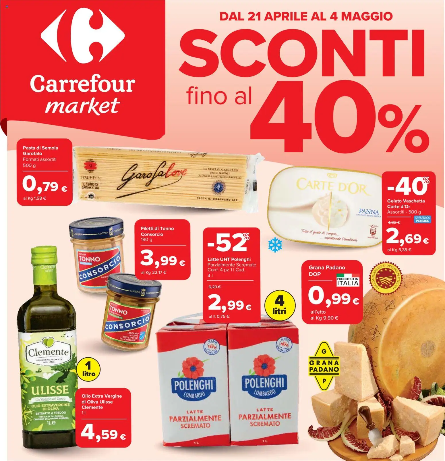 Le offerte sono valide dal 21/04/2026 - 04/05/2026, ma attenzione: gli sconti sono disponibili solo per un periodo limitato! Sfoglia subito il volantino e scopri prezzi straordinari su frutta e verdura, carne e pesce, latticini e prodotti da forno. Ogni settimana, Carrefour ti garantisce la massima qualità a prezzi imbattibili.