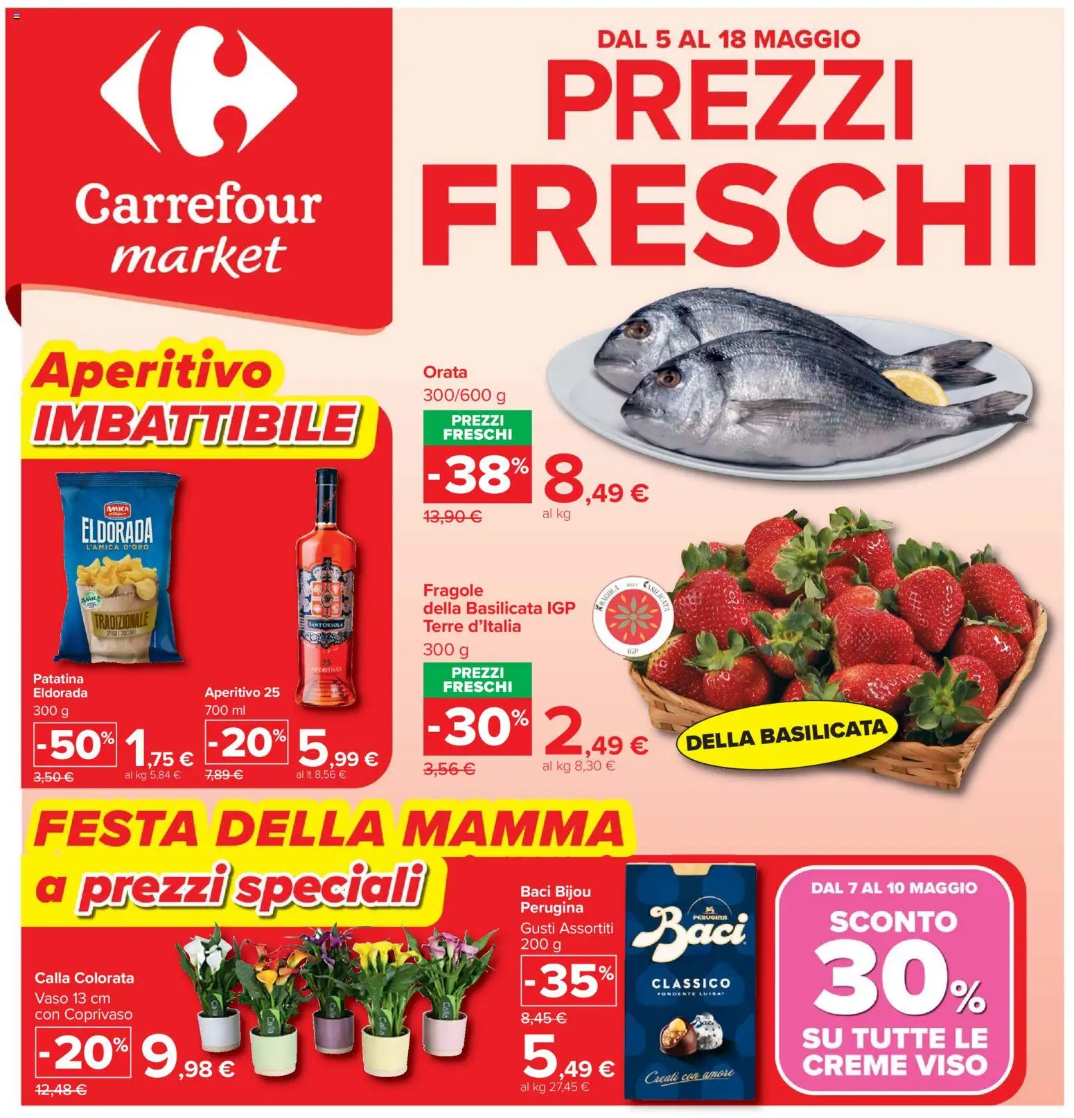 Il nuovo volantino Carrefour è sfogliabile online comodamente da casa o dal tuo smartphone, così puoi scoprire in pochi secondi tutte le offerte attive. All’interno troverai informazioni chiare su quali prodotti sono in sconto e fino a quando sono validi (05/05/2026 - 18/05/2026), per aiutarti a cogliere al volo le promozioni prima che finiscano. Ogni settimana sono disponibili sconti su alimentari freschi, prodotti per la casa e articoli stagionali, perfetti per pianificare la spesa senza stress e con il massimo risparmio!