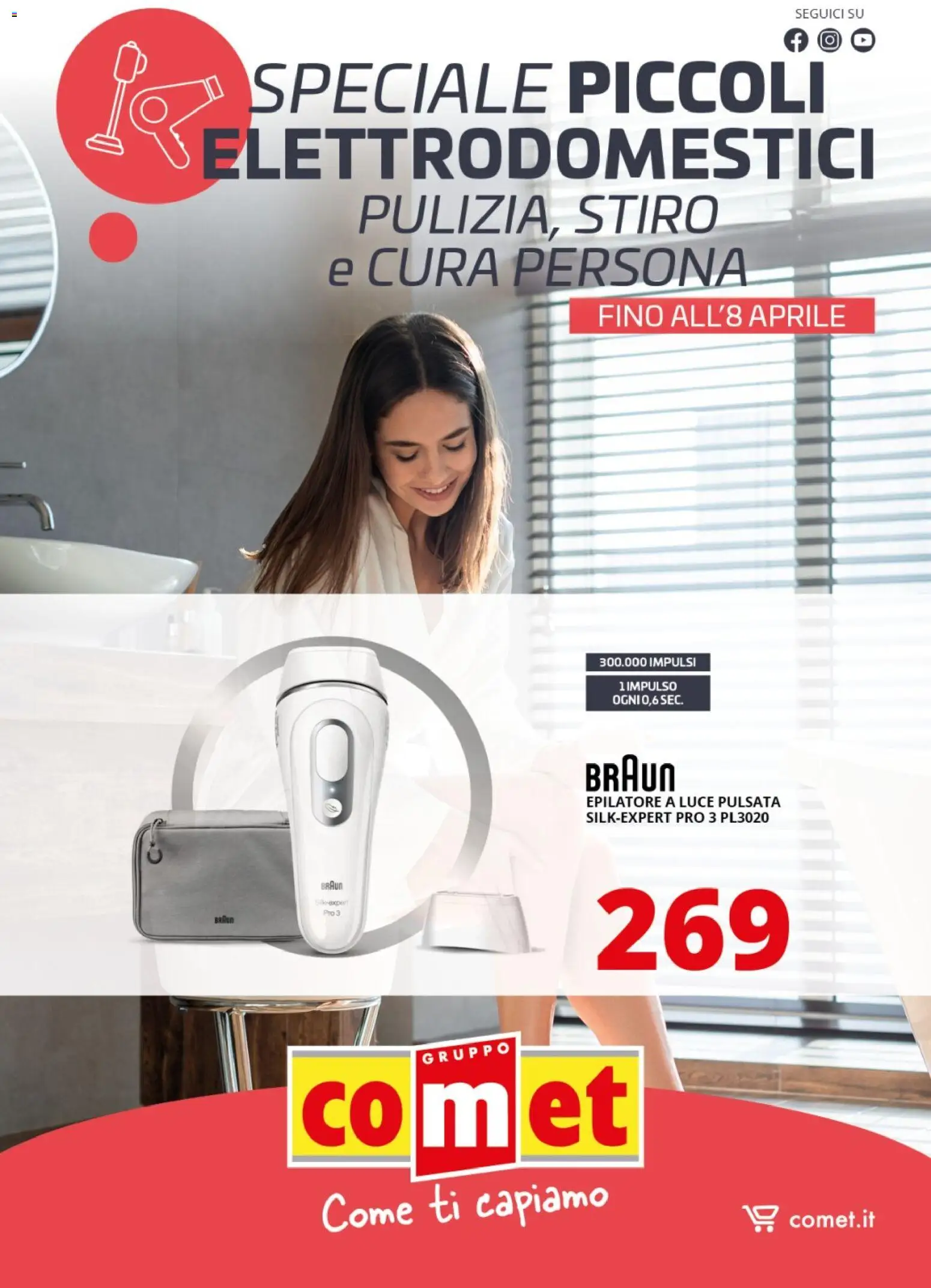 {"147350":[{"boxes":[{"content":"SEGUICI SU","coord":[[661,5],[720,5],[720,17],[661,16]]},{"content":"SPECIALE PICCOLI","coord":[[205,50],[686,48],[687,95],[205,97]]},{"content":"ELETTRODOMESTICI","coord":[[165,103],[728,103],[728,151],[165,151]]},{"content":"PULIZIA, STIRO","coord":[[296,157],[596,157],[596,198],[296,198]]},{"content":"e CURA PERSONA","coord":[[270,202],[625,202],[625,240],[270,241]]},{"content":"FINO ALL'8 APRILE","coord":[[494,250],[706,250],[706,274],[494,274]]},{"content":"1 IMPULSO","coord":[[514,566],[564,566],[564,575],[514,575]]},{"content":"BRAUN","coord":[[484,629],[560,626],[562,659],[484,661]]},{"content":"EPILATORE A LUCE PULSATA","coord":[[485,661],[649,660],[649,673],[485,673]]},{"content":"BRAun","coord":[[266,733],[285,733],[286,741],[266,741]]},{"content":"ikexpert","coord":[[266,748],[291,748],[291,755],[266,755]]},{"content":"BARUn","coord":[[178,762],[195,762],[195,769],[178,769]]},{"content":"Pro 3","coord":[[268,757],[283,757],[283,763],[268,763]]},{"content":"GRUPPO","coord":[[352,875],[423,867],[424,879],[352,886]]},{"content":"comet","coord":[[247,892],[528,884],[530,956],[249,959]]},{"content":"Come ti capiamo","coord":[[263,990],[506,974],[508,1016],[264,1029]]},{"content":"comet.it","coord":[[653,1006],[729,1004],[729,1025],[653,1026]]}]}]}Le promozioni sono valide dal 20/03/2026 - 08/04/2026, ma fai attenzione: gli sconti sono limitati nel tempo e i prodotti più richiesti potrebbero terminare presto. Non perdere l’occasione di scoprire cosa Comet ha preparato per te questa settimana: prezzi imbattibili e qualità garantita!