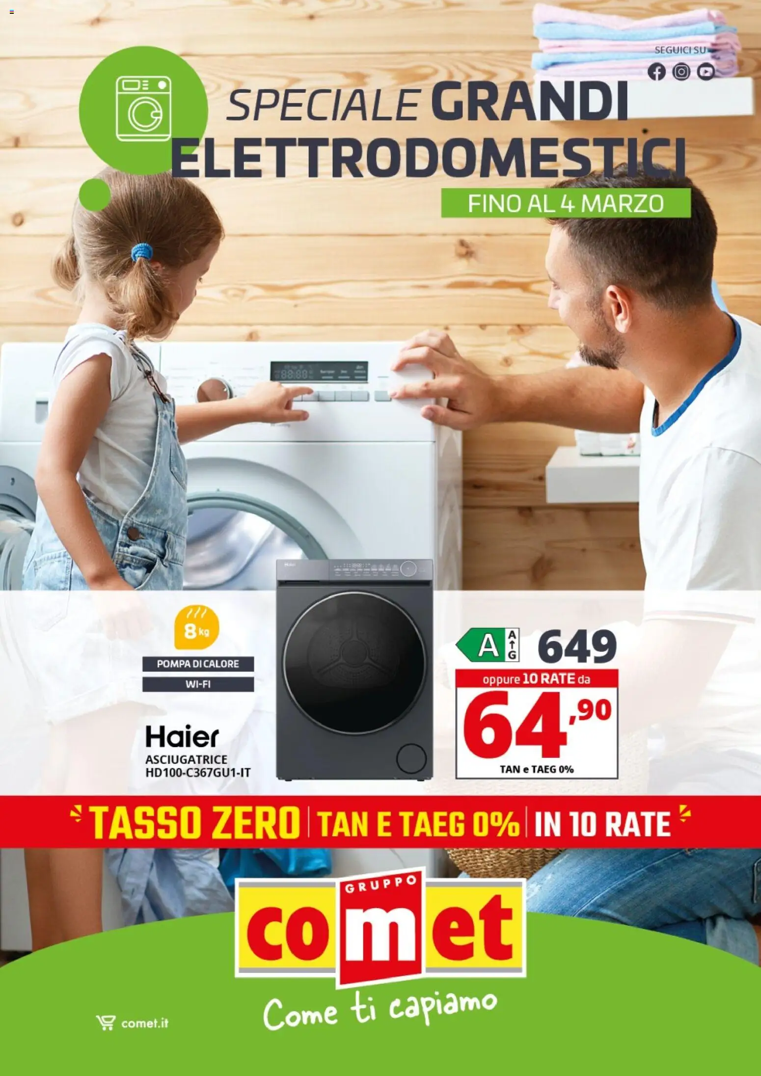 {"143411":[{"boxes":[{"content":"SEGUICI SU","coord":[[665,45],[721,45],[721,56],[665,56]]},{"content":"SPECIALE GRANDI","coord":[[228,83],[645,78],[645,124],[228,127]]},{"content":"ELETTRODOMESTICI","coord":[[177,134],[698,130],[698,182],[177,184]]},{"content":"FINO AL 4 MARZO","coord":[[474,195],[678,195],[678,217],[474,217]]},{"content":"Holet","coord":[[289,573],[304,572],[304,577],[289,578]]},{"content":"POMPA DI CALORE","coord":[[157,670],[244,670],[244,681],[157,681]]},{"content":"WIFI","coord":[[191,690],[214,691],[214,701],[191,700]]},{"content":"oppure 10 RATE da","coord":[[491,684],[601,683],[601,697],[491,698]]},{"content":"Haier","coord":[[145,736],[223,737],[224,762],[145,762]]},{"content":"ASCIUGATRICE","coord":[[145,767],[232,767],[232,778],[145,778]]},{"content":"GRUPPO","coord":[[351,899],[423,890],[424,902],[352,911]]},{"content":"comet","coord":[[251,915],[528,906],[530,981],[251,982]]},{"content":"19 comet.it","coord":[[97,1032],[173,1033],[173,1051],[97,1050]]},{"content":"Come ti capiamo","coord":[[263,1015],[506,999],[509,1039],[264,1055]]}]}]}Le promozioni sono valide dal 24/02/2026 - 04/03/2026, ma fai attenzione: gli sconti sono limitati nel tempo e i prodotti più richiesti potrebbero terminare presto. Non perdere l’occasione di scoprire cosa Comet ha preparato per te questa settimana: prezzi imbattibili e qualità garantita!