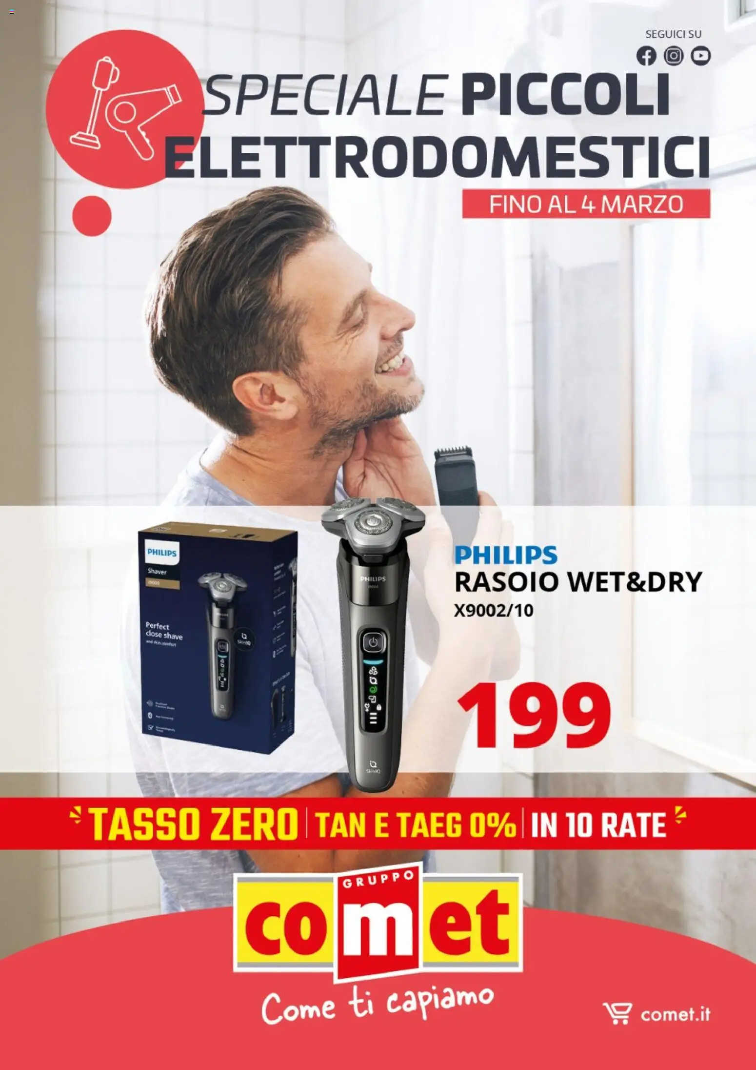 {"142946":[{"boxes":[{"content":"SEGUICI SU","coord":[[661,29],[719,29],[719,40],[661,40]]},{"content":"SPECIALE PICCOLI","coord":[[206,72],[689,67],[690,121],[206,121]]},{"content":"ELETTRODOMESTICI","coord":[[167,135],[726,135],[726,186],[167,187]]},{"content":"FINO AL 4 MARZO","coord":[[499,196],[701,196],[701,220],[499,220]]},{"content":"PHILIPS","coord":[[148,561],[180,563],[179,571],[148,569]]},{"content":"PHILIPS","coord":[[464,556],[574,556],[574,579],[464,579]]},{"content":"Shaver","coord":[[151,581],[171,583],[170,589],[150,587]]},{"content":"RASOIO WET&DRY","coord":[[465,581],[723,581],[723,608],[465,608]]},{"content":"PHILIPS","coord":[[368,589],[395,589],[395,595],[368,596]]},{"content":"Perfect","coord":[[149,636],[175,638],[174,645],[148,643]]},{"content":"close shave","coord":[[149,644],[188,649],[187,656],[148,651]]},{"content":"Skinto","coord":[[374,787],[390,787],[390,792],[374,792]]},{"content":"GRUPPO","coord":[[351,898],[422,890],[423,902],[352,910]]},{"content":"comet","coord":[[252,914],[527,907],[529,981],[253,982]]},{"content":"Come ti capiamo","coord":[[264,1014],[507,998],[510,1039],[264,1054]]},{"content":"19 comet.it","coord":[[618,1025],[729,1026],[729,1050],[618,1049]]}]}]}Le promozioni sono valide dal 20/02/2026 - 04/03/2026, ma fai attenzione: gli sconti sono limitati nel tempo e i prodotti più richiesti potrebbero terminare presto. Non perdere l’occasione di scoprire cosa Comet ha preparato per te questa settimana: prezzi imbattibili e qualità garantita!