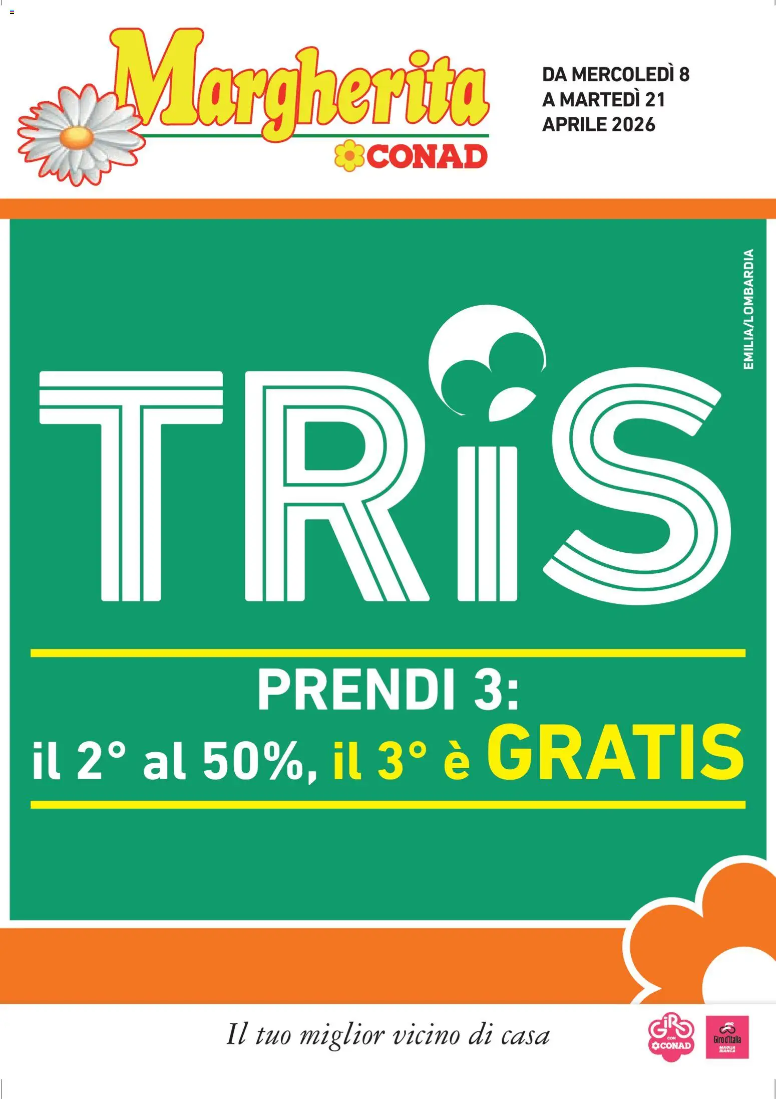 {"149434":[{"boxes":[{"content":"Margherita","coord":[[109,26],[486,30],[485,151],[109,150]]},{"content":"DA MERCOLED\u00cc 8","coord":[[541,61],[690,61],[690,84],[541,84]]},{"content":"A MARTED\u00cc 21","coord":[[540,88],[666,87],[666,107],[540,108]]},{"content":"CONAD","coord":[[365,142],[487,141],[487,168],[366,169]]},{"content":"TRIS","coord":[[39,333],[738,377],[706,611],[35,615]]},{"content":"EMILIA\/LOMBARDIA","coord":[[740,368],[740,246],[753,246],[753,368]]},{"content":"PRENDI 3","coord":[[257,663],[519,663],[519,712],[258,712]]},{"content":"Il tuo miglior vicino di casa","coord":[[225,1013],[553,1014],[553,1051],[225,1050]]},{"content":"G\u0130RS","coord":[[649,1014],[689,1014],[689,1035],[649,1035]]},{"content":"\u00bfCONAD","coord":[[649,1037],[689,1038],[689,1048],[649,1048]]},{"content":"Giro d'italia","coord":[[711,1032],[740,1032],[740,1041],[711,1040]]},{"content":"MAGLIA","coord":[[717,1043],[734,1043],[735,1046],[717,1046]]},{"content":"BIANCA","coord":[[717,1046],[734,1046],[734,1050],[717,1049]]}]}]}Le offerte sono valide dal 08/04/2026 - 21/04/2026, ma attenzione: gli sconti sono disponibili solo per un periodo limitato! Sfoglia subito il volantino e scopri prezzi straordinari su frutta e verdura, carne e pesce, latticini e prodotti da forno. Ogni settimana, Conad ti garantisce la massima qualità a prezzi imbattibili.