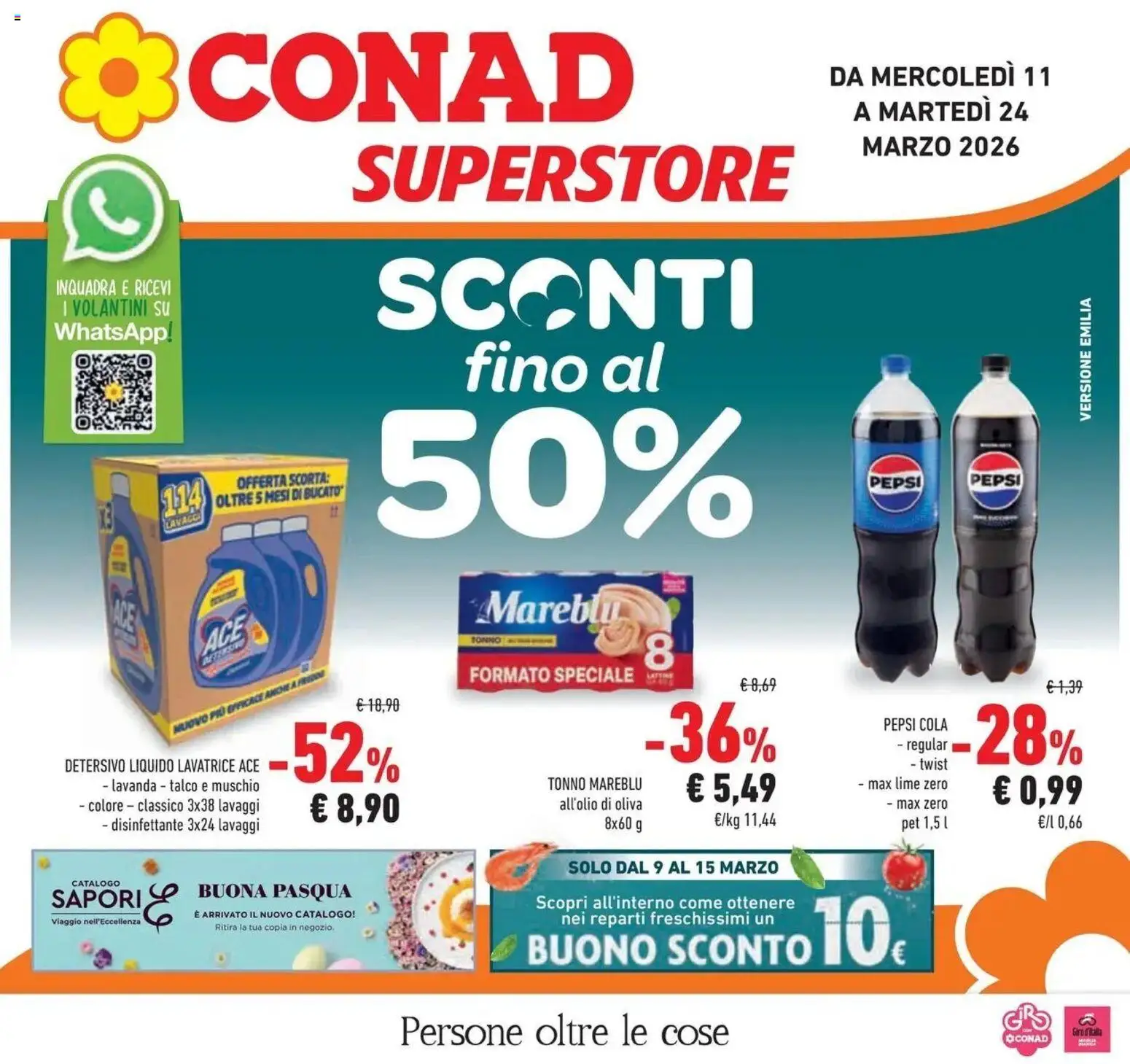 {"146444":[{"boxes":[{"content":"CONAD","coord":[[125,17],[437,16],[437,85],[125,86]]},{"content":"DA MERCOLED\u00cc 11","coord":[[568,42],[722,41],[722,61],[568,62]]},{"content":"A MARTED\u00cc 24","coord":[[585,65],[706,65],[706,84],[585,85]]},{"content":"SUPERSTORE","coord":[[239,97],[547,97],[547,141],[238,140]]},{"content":"SCONTI","coord":[[256,173],[519,173],[520,229],[256,231]]},{"content":"INQUADRA E RICEVI","coord":[[36,190],[119,190],[119,204],[36,203]]},{"content":"I VOLANTINI SU","coord":[[37,203],[117,204],[117,218],[37,218]]},{"content":"WhatsApp.","coord":[[35,219],[120,220],[120,236],[35,234]]},{"content":"fino al","coord":[[318,232],[459,232],[459,271],[318,272]]},{"content":"VERSIONE EMILIA","coord":[[739,290],[739,201],[749,201],[749,290]]},{"content":"OFFERTA SCORTA","coord":[[156,325],[226,322],[227,333],[156,337]]},{"content":"PEPSI","coord":[[596,326],[632,325],[633,336],[597,337]]},{"content":"PEPSI","coord":[[662,323],[701,323],[701,334],[662,334]]},{"content":"OLTRE 5 MESI DI BUCATO","coord":[[145,338],[235,331],[236,342],[146,349]]},{"content":"LAVACCI","coord":[[111,357],[137,349],[138,356],[113,363]]},{"content":"Mareblu","coord":[[327,402],[437,402],[437,430],[327,429]]},{"content":"TONNO","coord":[[321,436],[380,437],[380,444],[321,442]]},{"content":"FORMATO SPECIALE","coord":[[321,454],[437,455],[437,469],[321,469]]},{"content":"LATTINE","coord":[[443,460],[462,460],[462,465],[443,466]]},{"content":"NUOVO PI\u00d9 EFFICACE ANCHE A FRIDAY","coord":[[116,496],[221,458],[223,464],[119,503]]},{"content":"PEPSI COLA","coord":[[604,490],[651,491],[651,503],[604,502]]},{"content":"regular","coord":[[615,505],[650,505],[650,516],[615,517]]},{"content":"DETERSIVO LIQUIDO LAVATRICE ACE","coord":[[43,518],[180,518],[180,530],[43,530]]},{"content":"lavanda talco e muschio","coord":[[71,532],[178,533],[178,545],[71,544]]},{"content":"TONNO MAREBLU","coord":[[375,531],[441,531],[441,543],[375,543]]},{"content":"twist","coord":[[621,518],[651,518],[651,528],[621,529]]},{"content":"max lime zero","coord":[[588,532],[650,532],[650,543],[588,543]]},{"content":"all'olio di oliva","coord":[[383,546],[440,546],[440,557],[383,556]]},{"content":"max zero","coord":[[607,546],[650,546],[650,555],[607,555]]},{"content":"SOLO DAL 9 AL 15 MARZO","coord":[[389,588],[534,588],[534,600],[389,600]]},{"content":"CATALOGO","coord":[[47,601],[84,602],[83,612],[47,610]]},{"content":"SAPORI","coord":[[34,606],[116,606],[116,627],[33,626]]},{"content":"BUONA PASQUA","coord":[[131,603],[242,603],[243,617],[131,617]]},{"content":"Scopri all'interno come ottenere","coord":[[366,613],[545,613],[545,625],[366,625]]},{"content":"Viaggio nell'Eccellenza","coord":[[33,628],[95,628],[95,635],[33,635]]},{"content":"\u00c8 ARRIVATO IL NUOVO CATALOGO","coord":[[132,623],[243,623],[243,629],[132,629]]},{"content":"nei reparti freschissimi un","coord":[[383,624],[531,624],[531,635],[383,636]]},{"content":"Ritira la tua copia in negozio.","coord":[[147,633],[228,633],[228,638],[147,638]]},{"content":"BUONO SCONTO","coord":[[359,637],[561,634],[561,661],[359,662]]},{"content":"Persone oltre le cose","coord":[[271,693],[502,693],[502,721],[271,721]]},{"content":"DICONAD","coord":[[689,708],[718,708],[718,715],[689,715]]},{"content":"Siro d Bcalla","coord":[[734,704],[756,704],[756,710],[734,710]]}]}]}Le offerte sono valide dal 11/03/2026 - 24/03/2026, ma attenzione: gli sconti sono disponibili solo per un periodo limitato! Sfoglia subito il volantino e scopri prezzi straordinari su frutta e verdura, carne e pesce, latticini e prodotti da forno. Ogni settimana, Conad ti garantisce la massima qualità a prezzi imbattibili.