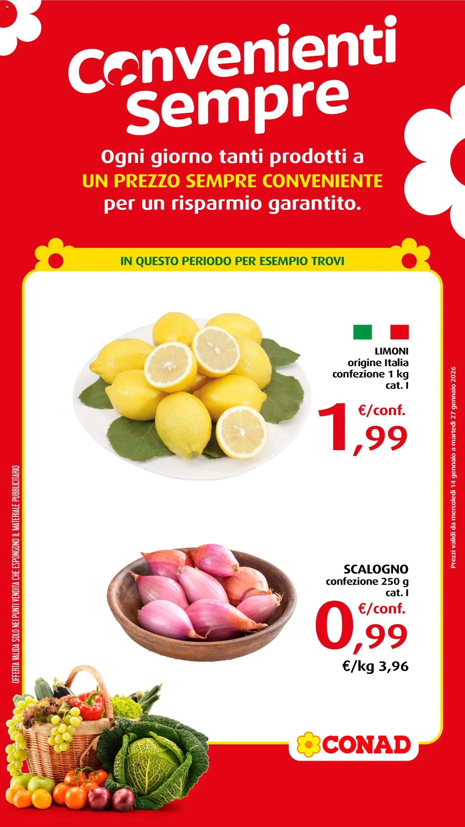 Le offerte sono valide dal 14/01/2026 - 27/01/2026, ma attenzione: gli sconti sono disponibili solo per un periodo limitato! Sfoglia subito il volantino e scopri prezzi straordinari su frutta e verdura, carne e pesce, latticini e prodotti da forno. Ogni settimana, Conad ti garantisce la massima qualità a prezzi imbattibili.
