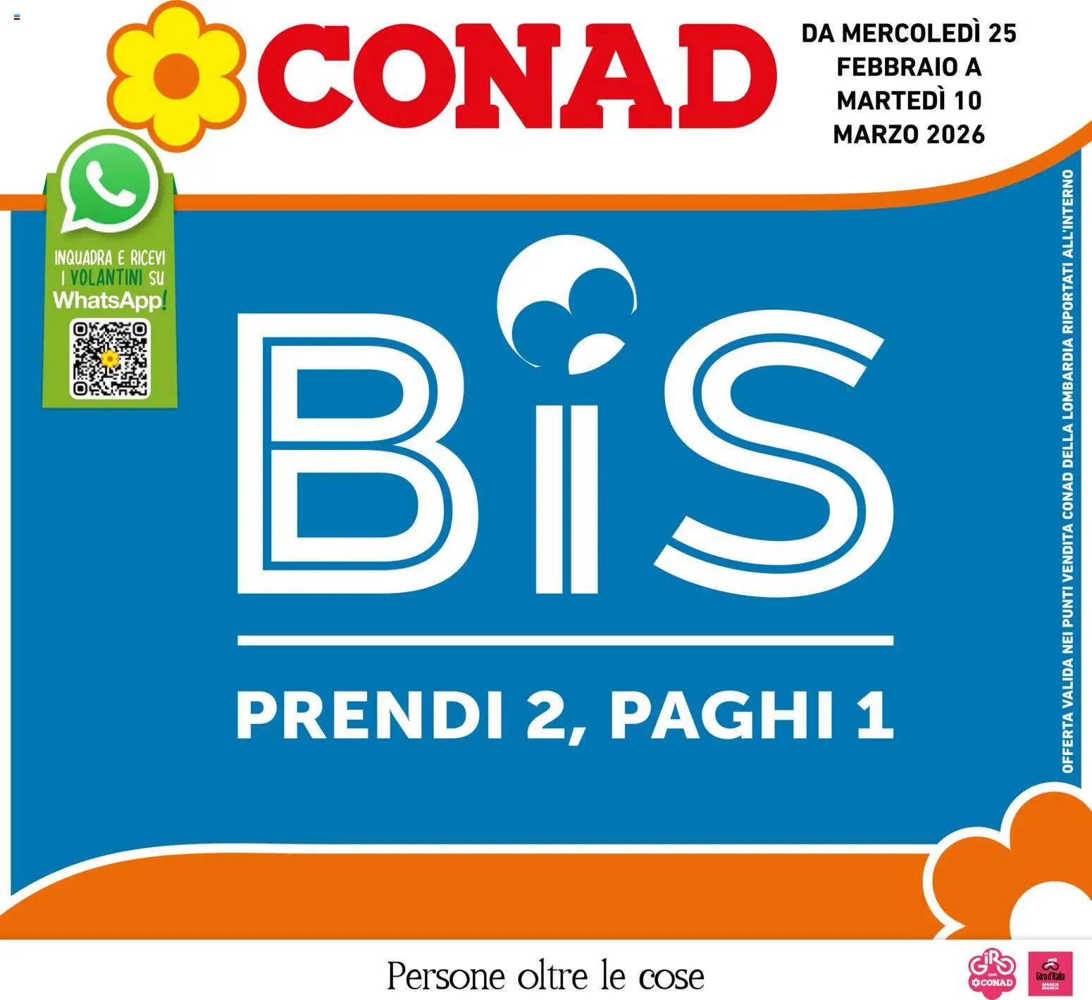 {"142967":[{"boxes":[{"content":"CONAD","coord":[[184,18],[553,15],[553,87],[184,90]]},{"content":"DA MERCOLED\u00cc 25","coord":[[568,12],[722,12],[722,31],[568,32]]},{"content":"FEBBRAIO A","coord":[[593,38],[697,38],[697,56],[593,55]]},{"content":"MARTED\u00cc 10","coord":[[591,61],[697,60],[697,78],[591,79]]},{"content":"INQUADRA E RICEVI","coord":[[37,175],[119,175],[119,189],[37,189]]},{"content":"I VOLANTINI SU","coord":[[37,189],[116,189],[116,204],[37,203]]},{"content":"WhatsApp.","coord":[[36,204],[119,207],[119,222],[35,220]]},{"content":"PRENDI 2, PAGHI 1","coord":[[163,486],[635,485],[635,528],[163,529]]},{"content":"OFFERTA VALIDA NEI PUNTI VENDITA CONAD DELLA LOMBARDIA RIPORTATI ALL'INTERNO","coord":[[750,550],[750,119],[764,119],[764,550]]},{"content":"Persone oltre le cose","coord":[[272,679],[500,680],[500,706],[272,705]]},{"content":"CONAD","coord":[[690,693],[719,693],[719,701],[690,701]]},{"content":"Giro d'italia","coord":[[734,690],[756,690],[756,695],[734,696]]},{"content":"BLANCA","coord":[[738,699],[752,699],[752,702],[738,702]]}]}]}Le offerte sono valide dal 25/02/2026 - 10/03/2026, ma attenzione: gli sconti sono disponibili solo per un periodo limitato! Sfoglia subito il volantino e scopri prezzi straordinari su frutta e verdura, carne e pesce, latticini e prodotti da forno. Ogni settimana, Conad ti garantisce la massima qualità a prezzi imbattibili.