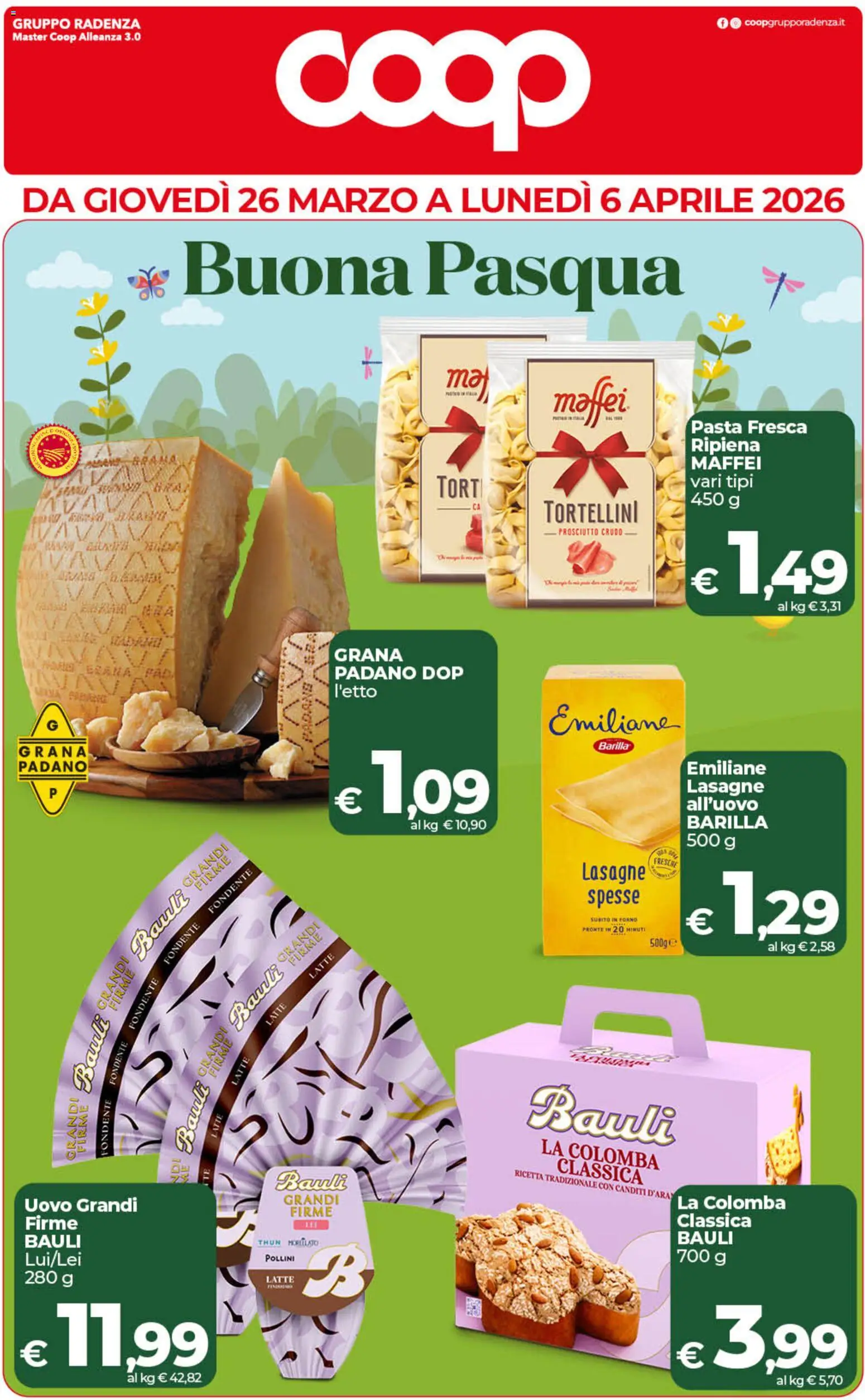 {"147838":[{"boxes":[{"content":"GRUPPO RADENZA","coord":[[9,13],[127,13],[127,27],[9,27]]},{"content":"coop","coord":[[245,17],[531,20],[529,138],[247,135]]},{"content":"@ coopgrupporadenza.it","coord":[[646,15],[759,15],[759,24],[646,25]]},{"content":"Buona Pasqua","coord":[[161,212],[617,214],[615,283],[160,273]]},{"content":"maffei\u00ae","coord":[[494,343],[563,336],[563,377],[493,376]]},{"content":"Pasta Fresca","coord":[[617,374],[723,375],[723,390],[617,389]]},{"content":"Ripiena","coord":[[616,390],[681,391],[681,407],[615,406]]},{"content":"MAFFEI","coord":[[617,407],[682,407],[682,421],[617,421]]},{"content":"TORT","coord":[[391,425],[432,425],[432,446],[391,447]]},{"content":"vari tipi","coord":[[616,424],[676,425],[676,439],[616,439]]},{"content":"TORTELLINI","coord":[[488,447],[573,446],[573,469],[488,470]]},{"content":"PROSCIUTTO CRUDO","coord":[[485,471],[571,471],[571,482],[485,482]]},{"content":"GRANA","coord":[[298,578],[362,579],[362,593],[298,593]]},{"content":"I BRANA FAD.","coord":[[60,593],[157,595],[157,609],[59,606]]},{"content":"PADANO DOP","coord":[[297,594],[415,595],[415,611],[297,610]]},{"content":"l'etto","coord":[[298,611],[336,613],[336,626],[297,624]]},{"content":"Emiliane","coord":[[488,629],[605,626],[606,660],[489,664]]},{"content":"GRANA","coord":[[16,667],[79,667],[79,679],[16,678]]},{"content":"Barilla","coord":[[537,663],[566,661],[566,672],[537,673]]},{"content":"PADANO","coord":[[17,680],[76,680],[76,693],[16,692]]},{"content":"Emiliane","coord":[[615,679],[687,680],[687,697],[614,695]]},{"content":"Lasagne","coord":[[613,697],[685,698],[684,712],[613,711]]},{"content":"all'uovo","coord":[[613,712],[681,713],[680,727],[613,726]]},{"content":"BARILLA","coord":[[613,728],[688,728],[688,744],[613,743]]},{"content":"Lasagne","coord":[[521,772],[579,772],[579,792],[521,791]]},{"content":"FRESCHE","coord":[[585,767],[608,770],[606,777],[583,773]]},{"content":"GRANDI","coord":[[159,790],[197,752],[206,760],[168,799]]},{"content":"FIRME","coord":[[170,793],[202,764],[209,770],[177,801]]},{"content":"spesse","coord":[[525,793],[574,793],[574,811],[525,813]]},{"content":"FONDENTE","coord":[[184,814],[222,776],[227,781],[189,819]]},{"content":"SUBITO IN FORNO","coord":[[528,821],[571,821],[571,826],[528,826]]},{"content":"PRONTE IN 20 MINUTI","coord":[[520,829],[579,829],[579,835],[520,835]]},{"content":"Bauli","coord":[[112,848],[160,786],[178,799],[130,863]]},{"content":"FONDENTE","coord":[[145,859],[175,823],[181,828],[150,864]]},{"content":"FIRME","coord":[[251,860],[282,830],[292,840],[263,869]]},{"content":"LATTE","coord":[[273,870],[295,852],[302,857],[280,878]]},{"content":"Bauli","coord":[[190,911],[235,858],[259,880],[215,931]]},{"content":"LATTE","coord":[[234,914],[250,894],[259,899],[242,921]]},{"content":"FONDENTE","coord":[[112,918],[133,873],[143,878],[122,923]]},{"content":"Bauli","coord":[[474,966],[612,985],[607,1030],[470,1012]]},{"content":"LATTE","coord":[[203,970],[216,941],[226,947],[212,974]]},{"content":"LATTE","coord":[[184,1014],[191,995],[201,998],[194,1018]]},{"content":"LA COLOMBA","coord":[[483,1017],[592,1032],[591,1050],[481,1036]]},{"content":"FONDENTE FONDENTE","coord":[[87,1034],[101,928],[116,930],[97,1036]]},{"content":"Fame Bauli FIRME","coord":[[55,1036],[94,860],[124,866],[75,1042]]},{"content":"Bauli FIRME Bauli GRANDI","coord":[[151,1046],[255,823],[290,831],[165,1061]]},{"content":"Bauli","coord":[[247,1048],[311,1047],[311,1066],[247,1067]]},{"content":"CLASSICA","coord":[[495,1035],[576,1045],[574,1061],[493,1050]]},{"content":"RICETTA TRADIZIONALE CON CANDITI D'ARA","coord":[[459,1045],[601,1065],[600,1075],[459,1055]]},{"content":"Uovo Grandi","coord":[[20,1071],[124,1071],[124,1088],[20,1087]]},{"content":"GRANDI","coord":[[253,1068],[306,1068],[306,1080],[253,1081]]},{"content":"FIRME","coord":[[257,1077],[301,1077],[301,1091],[256,1090]]},{"content":"La Colomba","coord":[[604,1068],[704,1068],[704,1086],[604,1085]]},{"content":"Firme","coord":[[20,1088],[70,1089],[70,1103],[20,1103]]},{"content":"Classica","coord":[[605,1086],[674,1087],[674,1101],[605,1099]]},{"content":"BAULI","coord":[[19,1104],[72,1103],[72,1118],[19,1119]]},{"content":"BAULI","coord":[[604,1101],[659,1101],[659,1116],[604,1115]]},{"content":"THUN MORLTLATO","coord":[[229,1108],[286,1108],[286,1117],[229,1117]]},{"content":"Lui\/Lei","coord":[[19,1120],[75,1120],[75,1136],[19,1135]]},{"content":"POLLINI","coord":[[236,1123],[264,1123],[264,1130],[236,1130]]},{"content":"LATTE","coord":[[238,1140],[265,1140],[265,1150],[238,1150]]}]}]}Le offerte sono valide dal 26/03/2026 - 06/04/2026, ma attenzione: gli sconti sono disponibili solo per un periodo limitato! Sfoglia subito il volantino e scopri prezzi straordinari su frutta e verdura, carne e pesce, latticini e prodotti da forno. Ogni settimana, COOP ti garantisce la massima qualità a prezzi imbattibili.