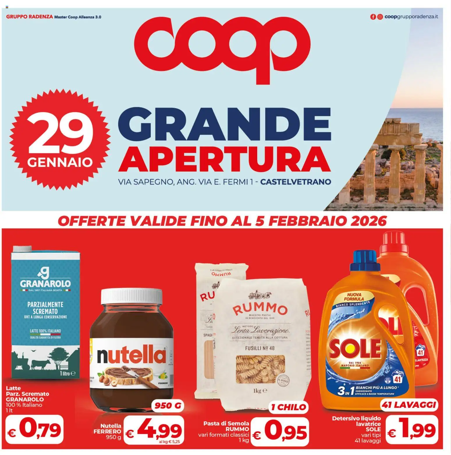 {"139865":[{"boxes":[{"content":"coop","coord":[[229,17],[537,27],[531,149],[232,142]]},{"content":"f @ coopgrupporadenza.it","coord":[[637,23],[755,23],[755,33],[637,33]]},{"content":"GRANDE","coord":[[200,182],[573,181],[573,246],[201,248]]},{"content":"GENNAIO","coord":[[46,268],[160,268],[160,288],[46,289]]},{"content":"APERTURA","coord":[[201,249],[569,249],[569,296],[201,296]]},{"content":"VIA SAPEGNO, ANG. VIA E. FERMI 1 CASTELVETRANO","coord":[[199,303],[570,303],[570,319],[199,320]]},{"content":"GRANAROLO","coord":[[33,480],[122,480],[122,495],[33,494]]},{"content":"RUMMO","coord":[[397,474],[363,474],[363,467],[397,467]]},{"content":"NUOVA","coord":[[595,502],[621,502],[621,509],[595,509]]},{"content":"PARZIALMENTE","coord":[[46,516],[110,516],[110,528],[46,528]]},{"content":"FORMULA","coord":[[590,510],[625,509],[626,517],[590,517]]},{"content":"RUMMO","coord":[[401,519],[494,519],[494,542],[401,542]]},{"content":"BIANCO SPLENDENTE","coord":[[576,522],[635,516],[636,522],[576,528]]},{"content":"SCREMATO","coord":[[55,530],[99,530],[99,540],[55,540]]},{"content":"UHT A LUNGA CONSERVAZIONE","coord":[[40,541],[115,540],[115,547],[40,548]]},{"content":"MAESTRI PASTAI","coord":[[426,539],[466,539],[466,543],[426,543]]},{"content":"METODO C","coord":[[413,558],[440,559],[439,565],[413,564]]},{"content":"Lenta Lavorazione.","coord":[[399,560],[497,561],[497,574],[399,573]]},{"content":"QUALITA GARANTITA DI FILIERA","coord":[[50,576],[105,576],[105,583],[50,583]]},{"content":"SPAGH","coord":[[348,573],[367,572],[367,579],[348,579]]},{"content":"ECCEZIONALE TENUTA ALLA COTTURA","coord":[[398,577],[495,577],[495,582],[398,583]]},{"content":"nutella\u00ae","coord":[[164,592],[285,592],[285,626],[164,628]]},{"content":"SOLE","coord":[[563,582],[658,581],[657,617],[563,618]]},{"content":"FUSILLI N\u00ba 48","coord":[[419,593],[470,593],[470,603],[419,603]]},{"content":"LLANTEZZA","coord":[[712,616],[735,615],[736,620],[712,621]]},{"content":"MARCHIO ITALIANO","coord":[[583,624],[636,624],[636,631],[583,631]]},{"content":"litro \u212e","coord":[[105,638],[129,638],[129,645],[105,645]]},{"content":"YERRENO","coord":[[271,656],[288,656],[289,660],[271,660]]},{"content":"Latte","coord":[[9,663],[36,663],[36,671],[9,671]]},{"content":"Ikg \u212e","coord":[[437,666],[459,666],[459,675],[438,675]]},{"content":"3INPOLENIZZANTE","coord":[[580,661],[640,663],[639,680],[579,679]]},{"content":"BIANCHI PI\u00d9 A LUNGO *","coord":[[610,662],[685,662],[685,669],[610,669]]},{"content":"Parz. Scremato","coord":[[9,672],[85,672],[85,681],[9,681]]},{"content":"EFFICACE A BASSE TEMPERATURE","coord":[[609,674],[677,674],[677,679],[609,679]]},{"content":"GRANAROLO","coord":[[9,681],[75,682],[75,690],[9,690]]},{"content":"1 CHILO","coord":[[464,692],[526,692],[526,707],[464,706]]},{"content":"Detersivo liquido","coord":[[571,713],[654,713],[654,724],[571,724]]},{"content":"Nutella","coord":[[171,727],[209,727],[209,736],[172,736]]},{"content":"Pasta di Semola","coord":[[348,722],[428,722],[428,732],[348,732]]},{"content":"lavatrice","coord":[[610,723],[654,723],[655,733],[610,733]]},{"content":"FERRERO","coord":[[160,737],[208,737],[208,745],[160,745]]},{"content":"RUMMO","coord":[[387,733],[427,732],[427,741],[387,741]]},{"content":"SOLE","coord":[[628,734],[655,733],[655,741],[628,741]]},{"content":"vari formati classici","coord":[[339,742],[428,742],[428,751],[339,752]]},{"content":"vari tipi","coord":[[620,743],[655,743],[655,752],[620,752]]}]}]}Le offerte sono valide dal 29/01/2026 - 05/02/2026, ma attenzione: gli sconti sono disponibili solo per un periodo limitato! Sfoglia subito il volantino e scopri prezzi straordinari su frutta e verdura, carne e pesce, latticini e prodotti da forno. Ogni settimana, COOP ti garantisce la massima qualità a prezzi imbattibili.