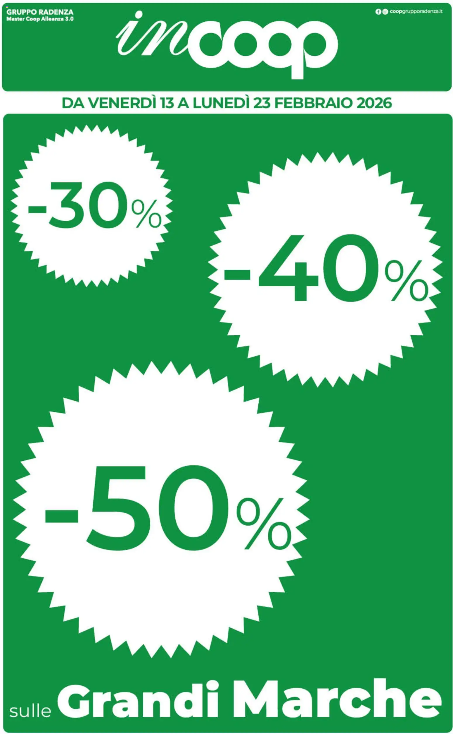 {"141977":[{"boxes":[{"content":"GRUPPO RADENZA","coord":[[9,12],[126,12],[126,26],[9,26]]},{"content":"incoop","coord":[[194,10],[582,30],[575,140],[189,115]]},{"content":"f @ coopgrupporadenza.it","coord":[[641,13],[761,13],[761,25],[641,25]]},{"content":"Grandi Marche","coord":[[90,1160],[757,1156],[758,1229],[90,1232]]},{"content":"sulle","coord":[[14,1200],[88,1201],[89,1226],[13,1228]]}]}]}Le offerte sono valide dal 13/02/2026 - 23/02/2026, ma attenzione: gli sconti sono disponibili solo per un periodo limitato! Sfoglia subito il volantino e scopri prezzi straordinari su frutta e verdura, carne e pesce, latticini e prodotti da forno. Ogni settimana, COOP ti garantisce la massima qualità a prezzi imbattibili.