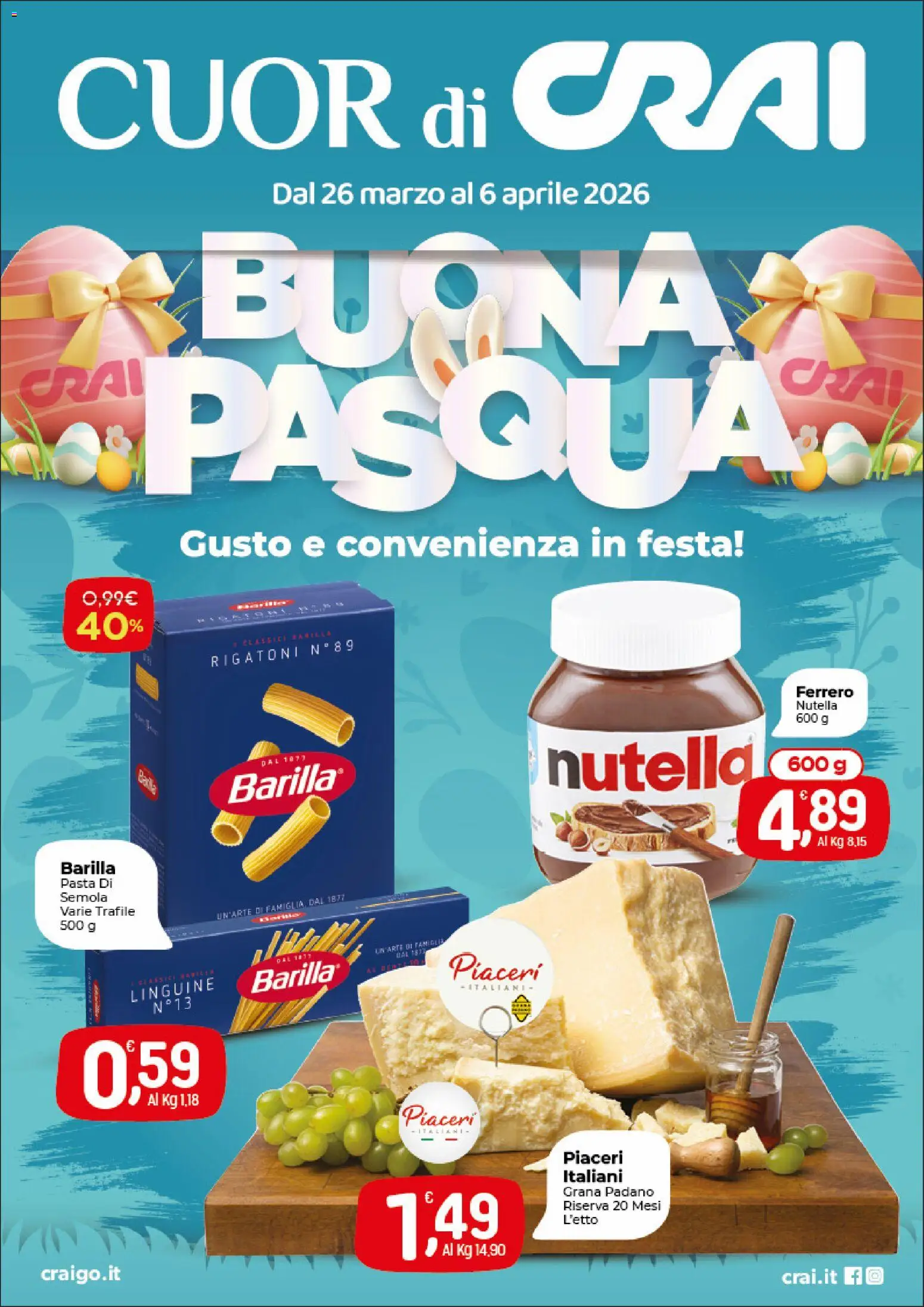 {"148240":[{"boxes":[{"content":"CUOR di CRAI","coord":[[47,31],[732,22],[733,134],[48,135]]},{"content":"BUONA","coord":[[157,186],[677,186],[675,327],[157,316]]},{"content":"CRAI","coord":[[11,307],[119,300],[120,336],[14,347]]},{"content":"PASQUA\u00ae","coord":[[117,293],[688,288],[689,420],[118,422]]},{"content":"Gusto e convenienza in festa","coord":[[150,440],[626,439],[626,470],[150,471]]},{"content":"CLASSICA BARILLA","coord":[[190,535],[280,527],[280,534],[190,543]]},{"content":"RIGATONI N\u00ba89","coord":[[175,548],[296,535],[296,546],[176,560]]},{"content":"Ferrero","coord":[[665,574],[717,575],[716,586],[665,585]]},{"content":"Nutella","coord":[[666,586],[702,586],[702,596],[666,596]]},{"content":"nutella","coord":[[455,620],[637,615],[639,661],[455,668]]},{"content":"Barilla\u00ae","coord":[[190,649],[284,637],[287,662],[192,675]]},{"content":"Barilla","coord":[[50,721],[95,721],[95,735],[50,735]]},{"content":"Pasta Di","coord":[[50,735],[94,735],[94,746],[50,746]]},{"content":"Semola","coord":[[50,747],[89,747],[89,758],[50,757]]},{"content":"Varie Trafile","coord":[[49,758],[114,758],[114,769],[49,768]]},{"content":"UN'ARTE DI FAMIGLIE","coord":[[314,794],[375,784],[376,791],[314,800]]},{"content":"LASSI\u010cE BARILLA","coord":[[119,817],[178,809],[179,818],[120,827]]},{"content":"Barilla\u00ae","coord":[[210,812],[282,802],[285,824],[212,833]]},{"content":"Piaceri","coord":[[376,799],[455,801],[454,825],[375,823]]},{"content":"LINGUINE","coord":[[108,828],[180,817],[182,830],[109,841]]},{"content":"ITALIANI","coord":[[383,821],[448,820],[448,832],[383,832]]},{"content":"N \u00ba13","coord":[[127,839],[161,835],[162,846],[128,851]]},{"content":"Piaceri","coord":[[338,926],[399,930],[398,947],[338,944]]},{"content":"ITALIAN","coord":[[348,944],[383,945],[382,954],[348,953]]},{"content":"Piaceri","coord":[[469,963],[525,963],[524,978],[469,977]]},{"content":"Italiani","coord":[[472,978],[521,978],[521,992],[472,992]]},{"content":"Grana Padano","coord":[[471,993],[549,993],[549,1004],[471,1004]]},{"content":"Riserva 20 Mesi","coord":[[471,1005],[557,1005],[557,1016],[471,1016]]},{"content":"L'etto","coord":[[471,1016],[503,1016],[503,1027],[471,1027]]},{"content":"craigo.it","coord":[[31,1060],[102,1059],[103,1077],[31,1078]]},{"content":"crai.it f @","coord":[[654,1064],[741,1062],[741,1077],[655,1079]]}]}]}Le offerte sono valide dal 26/03/2026 - 06/04/2026, ma attenzione: gli sconti sono disponibili solo per un periodo limitato! Sfoglia subito il volantino e scopri prezzi straordinari su frutta e verdura, carne e pesce, latticini e prodotti da forno. Ogni settimana, CRAI ti garantisce la massima qualità a prezzi imbattibili.