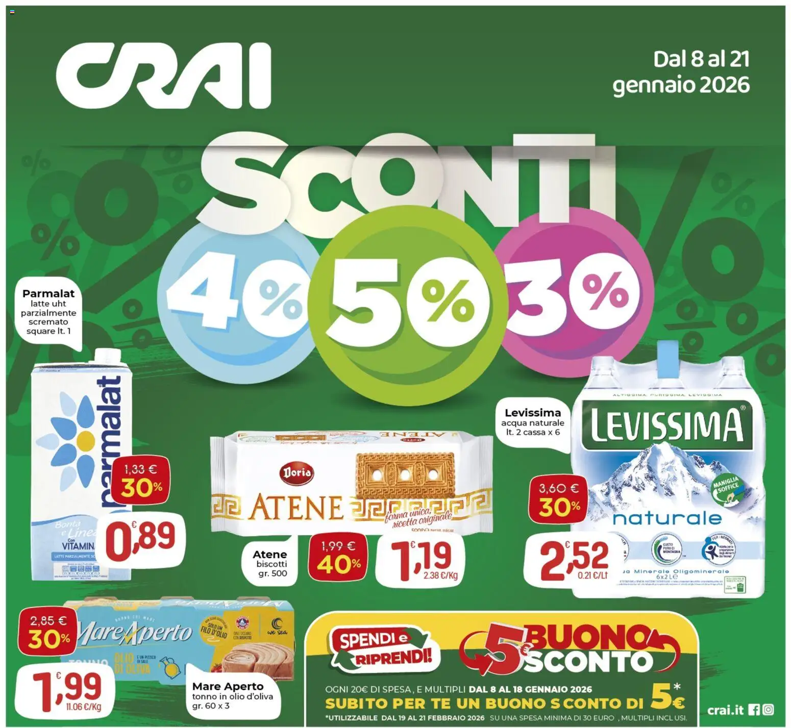 Le offerte sono valide dal 08/01/2026 - 21/01/2026, ma attenzione: gli sconti sono disponibili solo per un periodo limitato! Sfoglia subito il volantino e scopri prezzi straordinari su frutta e verdura, carne e pesce, latticini e prodotti da forno. Ogni settimana, CRAI ti garantisce la massima qualità a prezzi imbattibili.