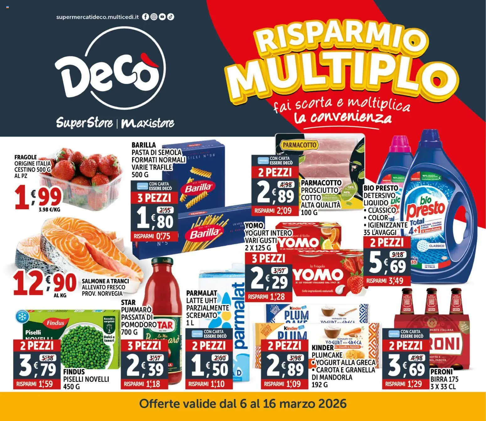 Le offerte sono valide dal 06/03/2026 - 16/03/2026, ma attenzione: gli sconti sono disponibili solo per un periodo limitato! Sfoglia subito il volantino e scopri prezzi straordinari su frutta e verdura, carne e pesce, latticini e prodotti da forno. Ogni settimana, Decò ti garantisce la massima qualità a prezzi imbattibili.
