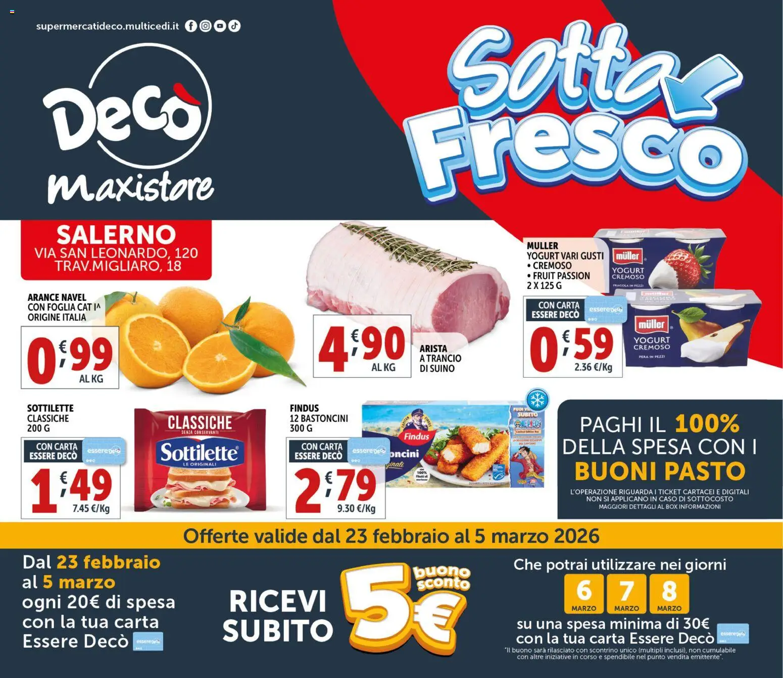 {"143063":[{"boxes":[{"content":"supermercatideco.multicedi.it f @J","coord":[[33,21],[237,19],[237,31],[33,32]]},{"content":"Deco","coord":[[45,84],[198,72],[203,137],[50,150]]},{"content":"Sotto","coord":[[446,35],[639,38],[635,103],[453,101]]},{"content":"Fresco","coord":[[396,107],[740,113],[738,197],[396,196]]},{"content":"maxistore","coord":[[46,170],[213,166],[214,200],[46,205]]},{"content":"SALERNO","coord":[[54,221],[173,221],[173,242],[54,243]]},{"content":"MULLER","coord":[[520,238],[553,238],[553,246],[520,246]]},{"content":"TRAV.MIGLIARO, 18","coord":[[51,256],[180,256],[180,269],[51,269]]},{"content":"YOGURT VARI GUSTI","coord":[[521,249],[598,248],[598,257],[521,257]]},{"content":"m\u00fcller","coord":[[609,249],[632,248],[632,257],[609,257]]},{"content":"\u00b7 CREMOSO","coord":[[521,258],[566,258],[566,266],[521,266]]},{"content":"FRUIT PASSION","coord":[[524,267],[584,267],[584,277],[524,277]]},{"content":"YOGURT","coord":[[605,264],[638,264],[637,270],[605,270]]},{"content":"CREMOSO","coord":[[604,271],[637,271],[637,276],[604,276]]},{"content":"FRAGOLA IN PEZZI","coord":[[605,280],[637,280],[637,284],[605,284]]},{"content":"ARANCE NAVEL","coord":[[27,290],[85,290],[85,298],[27,298]]},{"content":"CON FOGLIA CAT IA","coord":[[27,299],[99,299],[99,307],[27,308]]},{"content":"CON CARTA","coord":[[531,297],[574,297],[574,306],[531,306]]},{"content":"essere pecs","coord":[[581,303],[616,303],[616,309],[581,309]]},{"content":"ORIGINE ITALIA","coord":[[26,309],[85,309],[85,318],[26,318]]},{"content":"ESSERE DECO","coord":[[525,306],[573,306],[573,315],[525,316]]},{"content":"m\u00fcller","coord":[[631,316],[657,316],[658,325],[631,326]]},{"content":"0'99","coord":[[24,332],[112,328],[113,371],[23,380]]},{"content":"YOGURT","coord":[[626,333],[663,333],[663,340],[626,340]]},{"content":"ARISTA","coord":[[414,341],[443,341],[443,348],[414,348]]},{"content":"CREMOSO","coord":[[626,340],[663,340],[663,346],[626,346]]},{"content":"A TRANCIO","coord":[[414,350],[456,350],[456,359],[414,359]]},{"content":"PERA IN PEZZI","coord":[[632,351],[659,351],[659,355],[632,355]]},{"content":"AL KG","coord":[[366,358],[393,358],[393,368],[366,368]]},{"content":"DI SUINO","coord":[[415,360],[450,360],[450,369],[415,368]]},{"content":"AL KG","coord":[[78,371],[104,370],[104,380],[77,380]]},{"content":"SOTTILETTE","coord":[[26,399],[73,399],[73,407],[26,408]]},{"content":"FINDUS","coord":[[286,399],[316,399],[316,407],[286,408]]},{"content":"PUOI VIA","coord":[[507,403],[525,403],[525,407],[507,407]]},{"content":"CLASSICHE","coord":[[26,410],[69,410],[69,418],[26,418]]},{"content":"CLASSICHE","coord":[[165,409],[230,409],[230,425],[165,425]]},{"content":"12 BASTONCINI","coord":[[286,409],[344,409],[344,418],[286,418]]},{"content":"SUBITO","coord":[[510,408],[533,407],[533,413],[510,413]]},{"content":"SENZA CONSERVANTI","coord":[[178,424],[222,425],[221,432],[178,431]]},{"content":"Findus","coord":[[399,427],[425,428],[425,437],[399,436]]},{"content":"CON CARTA","coord":[[34,437],[77,437],[77,446],[34,446]]},{"content":"essere Dets","coord":[[85,443],[119,443],[119,449],[85,449]]},{"content":"Sottilette\u00ae","coord":[[155,438],[236,438],[236,457],[155,457]]},{"content":"CON CARTA","coord":[[297,437],[339,437],[339,446],[297,446]]},{"content":"DELLA SPESA CON I","coord":[[555,431],[752,431],[752,452],[555,452]]},{"content":"OGL CAMINHE","coord":[[511,437],[530,437],[530,441],[511,441]]},{"content":"ESSERE DECO","coord":[[28,447],[76,446],[76,455],[28,455]]},{"content":"ESSERE DECO","coord":[[291,446],[338,446],[338,455],[291,455]]},{"content":"essere DeCo","coord":[[347,443],[382,443],[382,450],[347,449]]},{"content":"oncini","coord":[[384,444],[414,444],[414,453],[384,453]]},{"content":"LE ORIGINALI","coord":[[177,455],[217,456],[216,463],[177,462]]},{"content":"vinali","coord":[[379,456],[400,456],[400,463],[379,464]]},{"content":"BUONI PASTO","coord":[[567,455],[739,454],[739,477],[567,477]]},{"content":"L'OPERAZIONE RIGUARDA I TICKET CARTACEI E DIGITALI","coord":[[563,483],[742,483],[742,490],[563,490]]},{"content":"NON SI APPLICANO IN CASO DI SOTTOCOSTO","coord":[[579,490],[725,490],[725,497],[579,497]]},{"content":"MAGGIORI DETTAGLI AL BOX INFORMAZIONI","coord":[[591,498],[713,498],[713,504],[591,504]]},{"content":"Dal 23 febbraio","coord":[[20,547],[159,548],[159,565],[20,564]]},{"content":"buono","coord":[[409,559],[465,559],[465,573],[409,573]]},{"content":"Che potrai utilizzare nei giorni","coord":[[506,551],[720,551],[720,567],[506,567]]},{"content":"al 5 marzo","coord":[[21,568],[113,569],[113,585],[20,583]]},{"content":"sconto","coord":[[412,572],[466,571],[466,583],[412,584]]},{"content":"ogni 20\u20ac di spesa","coord":[[20,586],[174,586],[174,606],[20,607]]},{"content":"RICEVI","coord":[[223,580],[324,580],[324,608],[223,608]]},{"content":"MARZO","coord":[[564,598],[590,599],[590,606],[564,605]]},{"content":"MARZO","coord":[[608,599],[633,599],[633,605],[608,605]]},{"content":"MARZO","coord":[[649,598],[675,598],[675,605],[649,605]]},{"content":"con la tua carta","coord":[[20,608],[158,607],[158,624],[20,624]]},{"content":"su una spesa minima di 30\u20ac","coord":[[509,611],[705,609],[705,624],[509,625]]},{"content":"Essere Dec\u00f2","coord":[[21,625],[125,626],[125,644],[21,643]]},{"content":"SUBITO","coord":[[219,611],[329,610],[329,636],[219,637]]},{"content":"con la tua carta Essere Dec\u00f2","coord":[[508,625],[709,625],[709,639],[508,639]]},{"content":"esserepets","coord":[[710,624],[738,624],[738,631],[710,631]]},{"content":"essere pech","coord":[[134,633],[159,633],[159,637],[134,637]]},{"content":"Il buono sar\u00e0 rilasciato con scontrino unico multipli inclusi, non cumulabile","coord":[[498,640],[728,640],[728,647],[498,647]]},{"content":"con altre iniziative in corso e spendibile nel punto vendita emittente'","coord":[[511,647],[714,647],[714,653],[511,653]]}]}]}Le offerte sono valide dal 23/02/2026 - 05/03/2026, ma attenzione: gli sconti sono disponibili solo per un