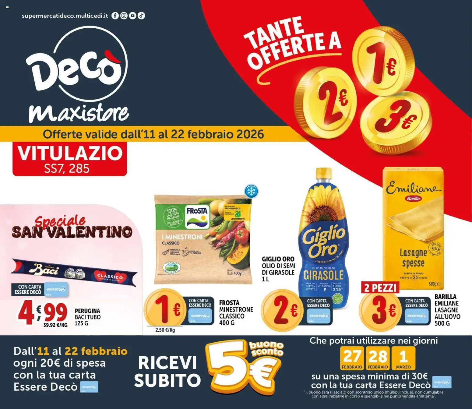 Il nuovo volantino Decò è sfogliabile online comodamente da casa o dal tuo smartphone, così puoi scoprire in pochi secondi tutte le offerte attive. All’interno troverai informazioni chiare su quali prodotti sono in sconto e fino a quando sono validi (11/02/2026 - 22/02/2026), per aiutarti a cogliere al volo le promozioni prima che finiscano. Ogni settimana sono disponibili sconti su alimentari freschi, prodotti per la casa e articoli stagionali, perfetti per pianificare la spesa senza stress e con il massimo risparmio!