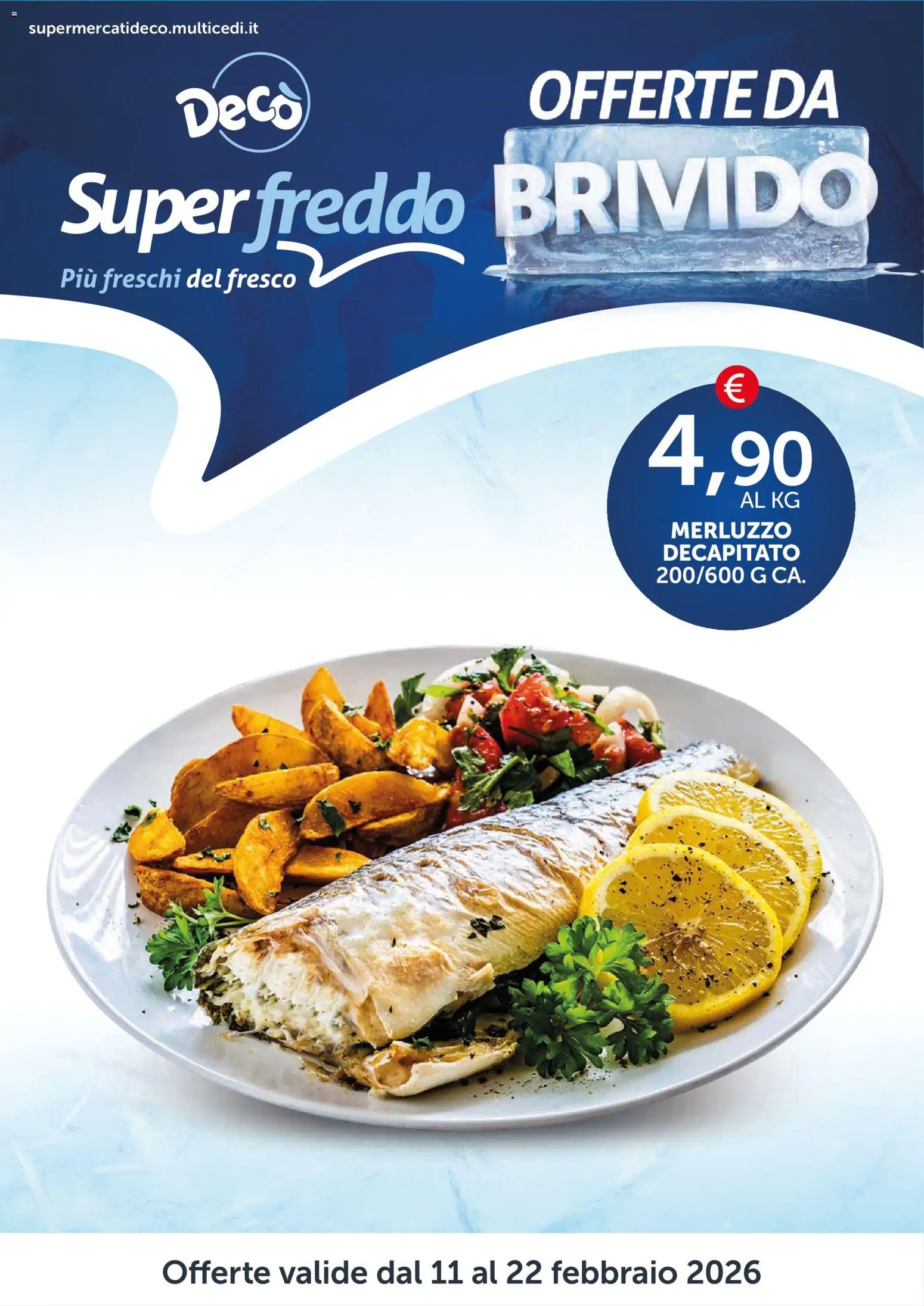 {"141599":[{"boxes":[{"content":"supermercatideco.multicedi.it","coord":[[21,17],[217,17],[217,31],[21,31]]},{"content":"Deco","coord":[[146,74],[252,67],[253,111],[150,117]]},{"content":"OFFERTE DA","coord":[[440,56],[706,56],[706,102],[440,102]]},{"content":"Super freddo BRIVIDO","coord":[[48,140],[731,119],[733,193],[48,217]]},{"content":"Pi\u00f9 freschi del fresco","coord":[[49,219],[250,221],[250,248],[49,247]]},{"content":"AL KG","coord":[[620,411],[672,411],[672,428],[620,427]]},{"content":"MERLUZZO","coord":[[561,434],[664,436],[664,453],[561,452]]},{"content":"DECAPITATO","coord":[[554,453],[670,454],[670,472],[554,471]]}]}]}Le offerte sono valide dal 11/02/2026 - 22/02/2026, ma attenzione: gli sconti sono disponibili solo per un periodo limitato! Sfoglia subito il volantino e scopri prezzi straordinari su frutta e verdura, carne e pesce, latticini e prodotti da forno. Ogni settimana, Decò ti garantisce la massima qualità a prezzi imbattibili.