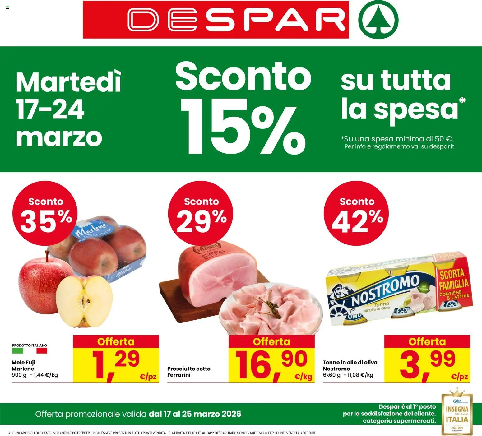 {"146588":[{"boxes":[{"content":"DESPARD","coord":[[202,4],[639,4],[639,57],[202,57]]},{"content":"Marted\u00ec","coord":[[24,113],[196,111],[197,148],[24,151]]},{"content":"Sconto","coord":[[279,95],[505,96],[505,148],[279,147]]},{"content":"su tutta","coord":[[541,108],[727,108],[727,148],[541,148]]},{"content":"la spesa\u00ae","coord":[[546,153],[742,155],[741,205],[546,203]]},{"content":"marzo","coord":[[25,207],[165,207],[165,237],[25,236]]},{"content":"*Su una spesa minima di 50 \u20ac.","coord":[[549,216],[730,215],[730,229],[549,230]]},{"content":"Per info e regolamento vai su despar.it","coord":[[553,230],[732,230],[732,242],[553,241]]},{"content":"Sconto","coord":[[44,316],[102,316],[102,331],[44,331]]},{"content":"Sconto","coord":[[293,316],[352,316],[352,332],[293,332]]},{"content":"Sconto","coord":[[544,316],[602,316],[602,331],[544,332]]},{"content":"Marlene","coord":[[120,368],[169,353],[173,367],[122,382]]},{"content":"FERRARINI","coord":[[316,399],[353,389],[355,396],[318,406]]},{"content":"Effe","coord":[[325,408],[361,398],[364,407],[328,418]]},{"content":"SCORTA","coord":[[704,437],[746,428],[749,444],[707,451]]},{"content":"FAMIGLIA","coord":[[705,453],[750,446],[753,461],[707,468]]},{"content":"NOSTROMO","coord":[[559,475],[670,437],[675,456],[565,497]]},{"content":"CONTIENE","coord":[[705,471],[741,465],[742,472],[706,477]]},{"content":"Tonno","coord":[[599,487],[625,484],[626,490],[600,493]]},{"content":"all'Olio di Oliva","coord":[[583,497],[626,491],[627,497],[584,503]]},{"content":"Offerta","coord":[[155,541],[216,540],[217,555],[155,556]]},{"content":"Offerta","coord":[[407,541],[467,541],[467,555],[407,555]]},{"content":"Offerta","coord":[[655,541],[717,541],[717,555],[655,556]]},{"content":"PRODOTTO ITALIANO","coord":[[19,551],[76,551],[76,559],[19,559]]},{"content":"Mele Fuji","coord":[[18,577],[57,577],[57,587],[18,588]]},{"content":"Tonno in olio di oliva","coord":[[518,578],[607,577],[607,586],[518,586]]},{"content":"Marlene","coord":[[18,588],[55,588],[55,597],[18,596]]},{"content":"Prosciutto cotto","coord":[[269,588],[338,588],[338,596],[269,596]]},{"content":"Nostromo","coord":[[519,589],[563,589],[563,596],[519,596]]},{"content":"\u20ac\/pz","coord":[[225,599],[253,599],[253,612],[226,612]]},{"content":"Ferrarini","coord":[[268,598],[306,598],[306,606],[268,606]]},{"content":"\u20ac\/kg","coord":[[471,599],[503,599],[503,613],[471,612]]},{"content":"\u20ac\/pz","coord":[[725,599],[753,599],[754,613],[724,613]]},{"content":"Despar \u00e8 al 1\u00ba posto","coord":[[608,648],[700,648],[700,659],[608,659]]},{"content":"per la soddisfazione del cliente,","coord":[[551,660],[701,659],[701,670],[551,671]]},{"content":"INSEGNA","coord":[[716,652],[752,652],[752,663],[716,663]]},{"content":"ELLANNO","coord":[[733,660],[753,660],[754,669],[734,668]]},{"content":"categoria supermercati.","coord":[[582,671],[700,671],[700,681],[582,682]]},{"content":"ITALIA","coord":[[715,668],[753,668],[753,681],[715,680]]},{"content":"ALCUNI ARTICOLI DI QUESTO VOLANTINO POTREBBERO NON ESSERE PRESENTI IN TUTTI I PUNTI VENDITA. LE ATTIVIT\u00c0 DEDICATE ALL'APP DESPAR TRIB\u00d9 SONO VALIDE SOLO PER I PUNTI VENDITA ADERENTI.","coord":[[13,690],[508,690],[508,698],[13,699]]}]}]}Le offerte sono valide dal 17/03/2026 - 25/03/2026, ma attenzione: gli sconti sono disponibili solo per un periodo limitato! Sfoglia subito il volantino e scopri prezzi straordinari su frutta e verdura, carne e pesce, latticini e prodotti da forno. Ogni settimana, Despar ti garantisce la massima qualità a prezzi imbattibili.