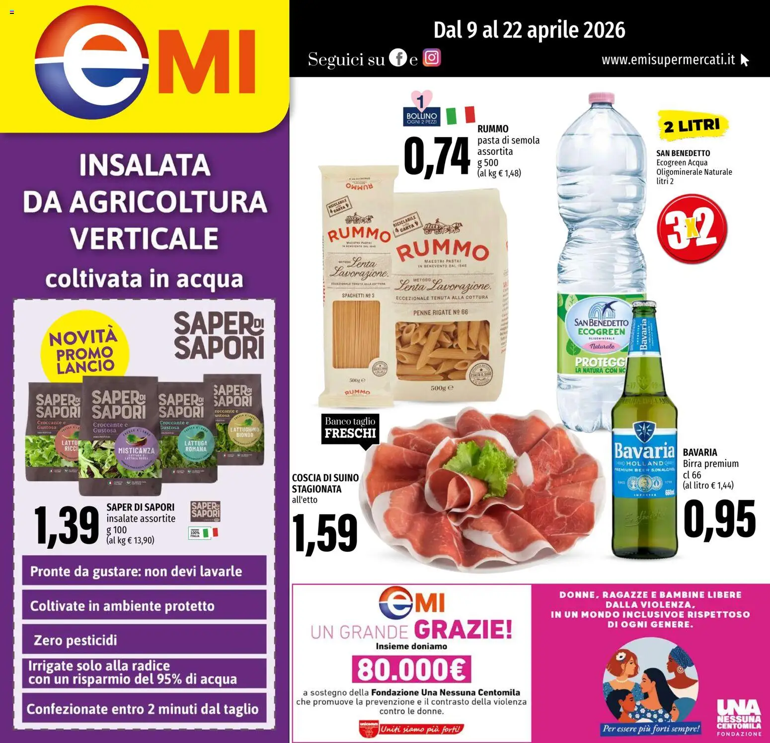Le offerte sono valide dal 09/04/2026 - 22/04/2026, ma attenzione: gli sconti sono disponibili solo per un periodo limitato! Sfoglia subito il volantino e scopri prezzi straordinari su frutta e verdura, carne e pesce, latticini e prodotti da forno. Ogni settimana, EMI ti garantisce la massima qualità a prezzi imbattibili.