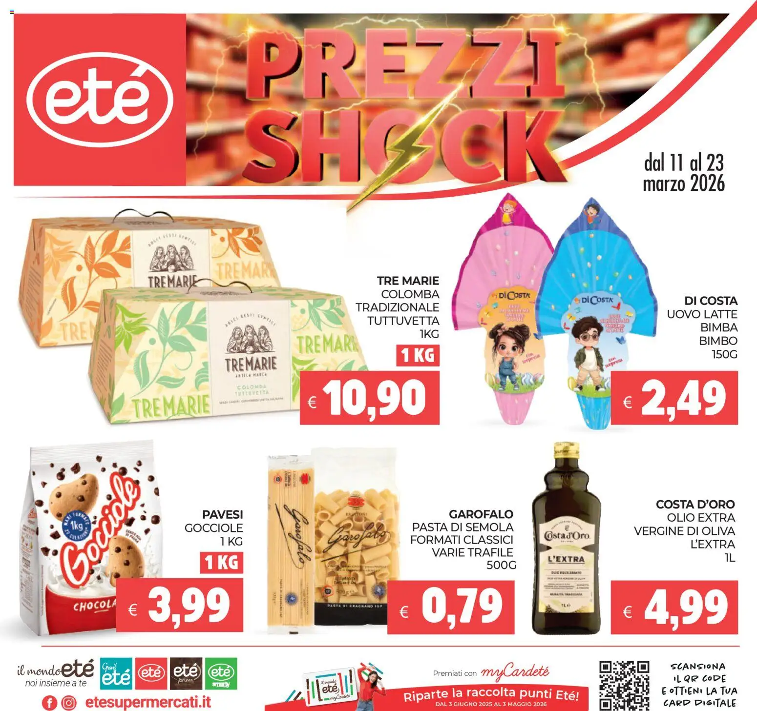 {"145622":[{"boxes":[{"content":"PREZZI","coord":[[249,25],[580,24],[581,104],[249,106]]},{"content":"SHOCK","coord":[[248,106],[583,107],[583,192],[248,189]]},{"content":"dal 11 al 23","coord":[[658,154],[743,154],[743,176],[658,176]]},{"content":"TREMARIE","coord":[[151,279],[204,278],[205,296],[151,297]]},{"content":"ITRE MARK","coord":[[210,270],[280,264],[280,284],[211,290]]},{"content":"TRE MARIE","coord":[[385,281],[451,281],[451,294],[385,293]]},{"content":"COLOMBA","coord":[[386,295],[450,295],[450,307],[386,307]]},{"content":"TRADIZIONALE","coord":[[361,307],[450,307],[450,320],[361,320]]},{"content":"DI COSTA","coord":[[509,298],[543,298],[543,306],[509,307]]},{"content":"Di COSTA","coord":[[591,301],[630,301],[630,312],[591,313]]},{"content":"DI COSTA","coord":[[700,301],[755,301],[755,313],[700,313]]},{"content":"TREN","coord":[[59,330],[98,327],[98,348],[60,350]]},{"content":"TUTTUVETTA","coord":[[374,322],[450,322],[450,335],[374,335]]},{"content":"UOVO LATTE","coord":[[681,315],[757,316],[756,329],[681,327]]},{"content":"TREMARIE","coord":[[301,343],[367,341],[368,360],[301,363]]},{"content":"BIMBA","coord":[[715,330],[756,330],[756,340],[715,340]]},{"content":"BIMBO","coord":[[714,342],[755,342],[755,354],[714,353]]},{"content":"TREMARIE","coord":[[230,365],[284,363],[284,379],[231,382]]},{"content":"ANTICH MARCA","coord":[[239,382],[273,380],[274,385],[239,387]]},{"content":"COLOMDA","coord":[[239,394],[272,393],[273,398],[239,400]]},{"content":"TREMARIE","coord":[[134,406],[215,402],[216,425],[135,429]]},{"content":"TUTTOVETEA","coord":[[238,400],[275,399],[275,404],[239,406]]},{"content":"LINGLINE","coord":[[303,481],[303,500],[299,500],[299,481]]},{"content":"Garofalo","coord":[[316,510],[323,581],[289,582],[285,511]]},{"content":"PAVESI","coord":[[205,521],[249,520],[250,532],[205,532]]},{"content":"GAROFALO","coord":[[457,520],[526,520],[526,533],[457,533]]},{"content":"COSTA D'ORO","coord":[[670,509],[753,509],[753,522],[670,522]]},{"content":"GOCCIOLE","coord":[[188,534],[249,534],[249,546],[188,547]]},{"content":"PASTA DI SEMOLA","coord":[[419,533],[526,533],[526,546],[419,546]]},{"content":"OLIO EXTRA","coord":[[681,523],[753,524],[753,537],[681,536]]},{"content":"FORMATI CLASSICI","coord":[[417,546],[529,545],[529,558],[417,559]]},{"content":"@stad'Oro","coord":[[557,542],[603,541],[604,554],[557,554]]},{"content":"VERGINE DI OLIVA","coord":[[649,536],[753,537],[753,550],[649,549]]},{"content":"L'EXTRA","coord":[[704,551],[752,551],[752,564],[704,563]]},{"content":"L'EXTRA","coord":[[559,568],[598,568],[598,576],[559,576]]},{"content":"Gocci","coord":[[53,579],[94,510],[132,535],[86,605]]},{"content":"VARIE TRAFILE","coord":[[441,559],[527,559],[527,571],[441,571]]},{"content":"CHOCOLA","coord":[[75,614],[120,613],[121,625],[75,626]]},{"content":"PASTA DI ARAGRAMO IGP","coord":[[334,617],[395,617],[395,623],[334,623]]},{"content":"il mondoet\u00e9","coord":[[18,677],[96,675],[96,694],[18,694]]},{"content":"Grand","coord":[[103,678],[121,677],[121,687],[103,689]]},{"content":"Premiati con myCardet\u00e9","coord":[[442,680],[562,677],[563,696],[442,697]]},{"content":"SCANSIONA","coord":[[685,678],[742,678],[742,686],[685,687]]},{"content":"noi insieme a te","coord":[[25,695],[89,695],[89,705],[25,705]]},{"content":"prime","coord":[[177,692],[202,692],[202,700],[177,700]]},{"content":"smarty","coord":[[218,697],[235,698],[235,704],[218,704]]},{"content":"il mondo","coord":[[328,696],[344,695],[344,699],[328,701]]},{"content":"IL QR CODE","coord":[[689,690],[744,690],[744,699],[689,699]]},{"content":"etesupermercati.it","coord":[[85,713],[217,712],[217,725],[85,725]]},{"content":"Riparte la raccolta punti Et\u00e9","coord":[[412,704],[594,703],[594,720],[412,720]]},{"content":"E OTTIENI LA TUA","coord":[[676,702],[754,702],[754,712],[676,713]]},{"content":"myCardet","coord":[[331,713],[355,710],[356,715],[331,719]]},{"content":"CARD DIGITALE","coord":[[678,715],[754,714],[754,724],[678,725]]}]}]}Le offerte sono valide dal 11/03/2026 - 23/03/2026, ma attenzione: gli sconti sono disponibili solo per un periodo limitato! Sfoglia subito il volantino e scopri prezzi straordinari su frutta e verdura, carne e pesce, latticini e prodotti da forno. Ogni settimana, Eté ti garantisce la massima qualità a prezzi imbattibili.