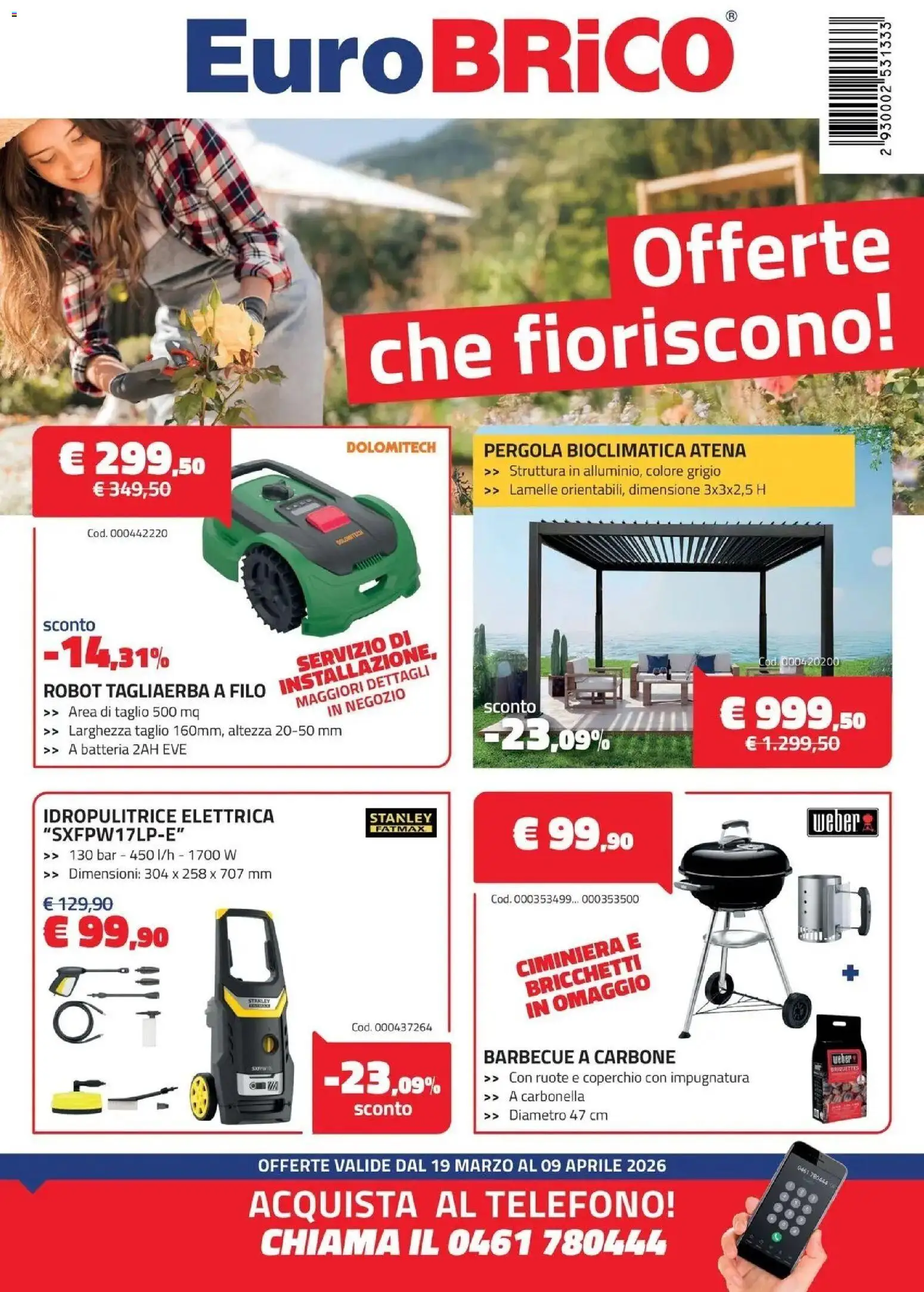 {"147665":[{"boxes":[{"content":"EuroBRICO","coord":[[154,12],[616,11],[617,81],[154,83]]},{"content":"Offerte","coord":[[526,185],[748,174],[749,232],[529,244]]},{"content":"che fioriscono","coord":[[303,267],[749,242],[752,299],[307,327]]},{"content":"DOLOMITECH","coord":[[289,368],[367,368],[367,381],[289,381]]},{"content":"PERGOLA BIOCLIMATICA ATENA","coord":[[403,370],[626,370],[626,385],[403,385]]},{"content":"Struttura in alluminio, colore grigio","coord":[[422,388],[606,389],[606,402],[422,400]]},{"content":"sconto","coord":[[33,518],[81,518],[81,530],[33,530]]},{"content":"SERVIZIO DI","coord":[[247,549],[344,527],[347,541],[250,564]]},{"content":"ROBOT TAGLIAERBA A FILO INSTALLAZIONE,","coord":[[35,567],[366,536],[368,568],[36,589]]},{"content":"MAGGIORI DETTAGLI","coord":[[244,583],[360,555],[363,567],[245,595]]},{"content":"IN NEGOZIO","coord":[[274,590],[338,575],[340,586],[276,601]]},{"content":"sconto","coord":[[404,585],[450,585],[450,598],[404,599]]},{"content":"A batteria 2AH EVE","coord":[[32,622],[157,621],[157,635],[32,635]]},{"content":"IDROPULITRICE ELETTRICA","coord":[[32,676],[230,675],[230,692],[32,692]]},{"content":"STANLEY","coord":[[309,681],[362,681],[363,690],[309,690]]},{"content":"weber","coord":[[679,679],[734,679],[732,696],[678,698]]},{"content":"FATMAX","coord":[[312,692],[356,692],[356,697],[312,697]]},{"content":"CIMINIERA E","coord":[[432,804],[535,780],[538,794],[435,820]]},{"content":"BRICCHETTI","coord":[[437,822],[538,798],[541,813],[441,837]]},{"content":"IN OMAGGIO","coord":[[437,839],[543,814],[546,829],[440,855]]},{"content":"BARBECUE A CARBONE","coord":[[403,878],[568,878],[568,894],[403,894]]},{"content":"weber","coord":[[697,884],[717,883],[718,891],[697,892]]},{"content":"Con ruote e coperchio con impugnatura","coord":[[421,897],[629,898],[629,910],[421,909]]},{"content":"BRIQUETTES","coord":[[695,894],[720,893],[720,897],[695,899]]},{"content":"sconto","coord":[[296,924],[345,923],[345,936],[296,937]]},{"content":"A carbonella","coord":[[424,913],[491,914],[490,925],[424,925]]},{"content":"Diametro 47 cm","coord":[[405,930],[510,929],[510,940],[405,940]]},{"content":"ACQUISTA AL TELEFONO","coord":[[208,996],[568,996],[568,1023],[208,1024]]}]}]}Le promozioni sono valide dal 18/03/2026 - 09/04/2026, ma fai attenzione: gli sconti sono limitati nel tempo e i prodotti più richiesti potrebbero terminare presto. Non perdere l’occasione di scoprire cosa Eurobrico ha preparato per te questa settimana: prezzi imbattibili e qualità garantita!