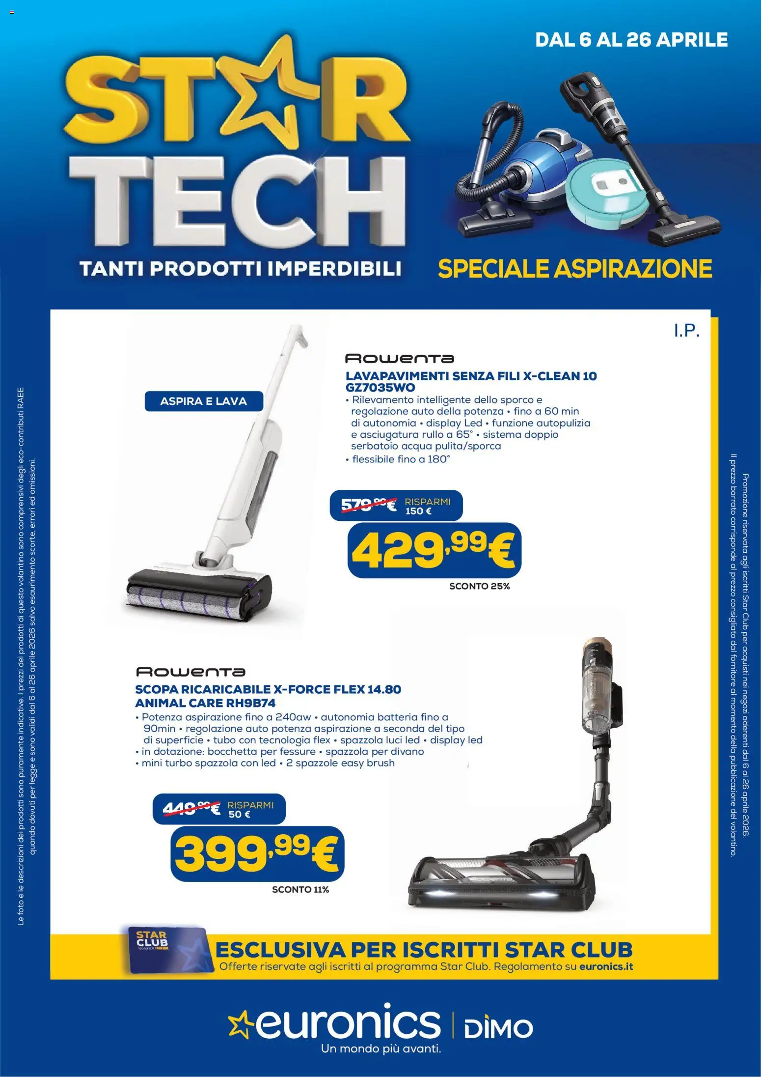{"149686":[{"boxes":[{"content":"STYR","coord":[[62,46],[426,44],[426,152],[63,153]]},{"content":"DAL 6 AL 26 APRILE","coord":[[543,30],[743,30],[743,48],[543,49]]},{"content":"TECH","coord":[[69,153],[427,152],[428,254],[69,255]]},{"content":"TANTI PRODOTTI IMPERDIBILI","coord":[[78,262],[411,262],[411,284],[78,283]]},{"content":"SPECIALE ASPIRAZIONE","coord":[[443,259],[725,259],[725,285],[443,284]]},{"content":"I.P.","coord":[[687,328],[711,330],[711,344],[687,343]]},{"content":"Rowenta","coord":[[349,356],[463,358],[463,372],[349,371]]},{"content":"LAVAPAVIMENTI SENZA FILI XCLEAN 10","coord":[[350,375],[610,375],[610,388],[350,388]]},{"content":"ASPIRA E LAVA","coord":[[163,402],[253,402],[253,414],[163,414]]},{"content":"\u00b7 Rilevamento intelligente dello sporco e","coord":[[350,400],[555,400],[555,412],[350,412]]},{"content":"regolazione auto della potenza \u00b7 fino a 60 min","coord":[[354,412],[593,412],[593,425],[354,424]]},{"content":"di autonomia \u00b7 display Led \u00b7 funzione autopulizia","coord":[[357,424],[603,424],[603,436],[357,436]]},{"content":"e asciugatura rullo a 65\u00ba \u00b7 sistema doppio","coord":[[356,436],[569,436],[569,448],[356,448]]},{"content":"serbatoio acqua pulita\/sporca","coord":[[355,448],[511,448],[511,460],[355,459]]},{"content":"Il prezzo barrato corrisponde al prezzo consigliato dal fornitore al momento della pubblicazione del volantino.","coord":[[751,460],[751,872],[742,872],[742,460]]},{"content":"Rowenta","coord":[[135,676],[250,676],[250,691],[135,692]]},{"content":"ANIMAL CARE RH9B74","coord":[[137,708],[280,708],[280,721],[137,722]]},{"content":"90min \u00b7 regolazione auto potenza aspirazione a seconda del tipo","coord":[[147,735],[476,735],[476,747],[147,747]]},{"content":"di superficie \u00b7 tubo con tecnologia flex \u00b7 spazzola luci led \u00b7 display led","coord":[[145,747],[493,746],[493,759],[145,759]]},{"content":"\u00b7 in dotazione bocchetta per fessure \u00b7 spazzola per divano","coord":[[138,759],[432,758],[432,770],[138,770]]},{"content":"\u00b7 mini turbo spazzola con led \u00b7 2 spazzole easy brush","coord":[[137,770],[403,770],[403,782],[137,782]]},{"content":"50 \u20ac","coord":[[225,820],[255,821],[254,832],[225,831]]},{"content":"Le foto e le descrizioni dei prodotti sono puramente indicative. I prezzi dei prodotti di questo volantino sono comprensivi degli ecocontributi RAEE","coord":[[16,943],[16,392],[25,392],[25,943]]},{"content":"ELOB","coord":[[135,947],[172,949],[172,965],[136,962]]},{"content":"ESCLUSIVA PER ISCRITTI STAR CLUB","coord":[[217,955],[644,955],[644,976],[217,976]]},{"content":"Offerte riservate agli iscritti al programma Star Club. Regolamento su euronics.it","coord":[[222,977],[646,977],[646,989],[222,989]]},{"content":"euronics DiMO","coord":[[226,1018],[546,1019],[545,1062],[226,1061]]},{"content":"Un mondo pi\u00f9 avanti.","coord":[[324,1060],[450,1061],[450,1074],[324,1073]]}]}]}Le promozioni sono valide dal 06/04/2026 - 26/04/2026, ma fai attenzione: gli sconti sono limitati nel tempo e i prodotti più richiesti potrebbero terminare presto. Non perdere l’occasione di scoprire cosa Euronics ha preparato per te questa settimana: prezzi imbattibili e qualità garantita!