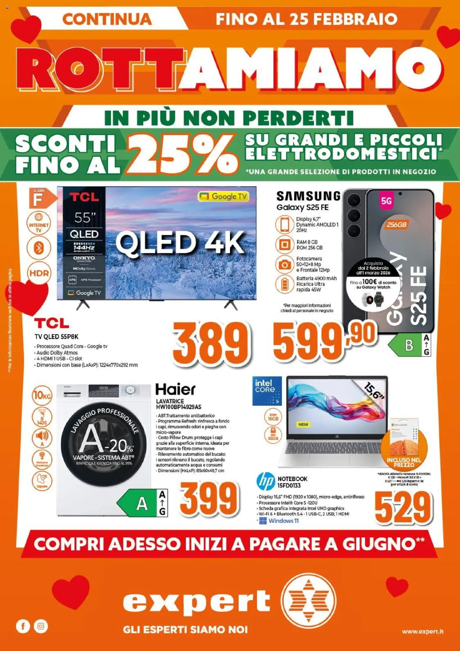 {"141860":[{"boxes":[{"content":"CONTINUA","coord":[[104,20],[258,19],[258,42],[104,43]]},{"content":"FINO AL 25 FEBBRAIO","coord":[[358,18],[670,18],[670,44],[358,44]]},{"content":"ROTTAMIAMO","coord":[[21,74],[746,72],[746,152],[21,155]]},{"content":"IN PI\u00d9 NON PERDERTI","coord":[[175,177],[599,178],[599,217],[175,216]]},{"content":"SCONTI","coord":[[22,224],[202,225],[201,259],[22,258]]},{"content":"SU GRANDI E PICCOLI","coord":[[412,222],[746,221],[746,246],[412,247]]},{"content":"ELETTRODOMESTICI*","coord":[[414,248],[746,244],[746,268],[414,270]]},{"content":"*UNA GRANDE SELEZIONE DI PRODOTTI IN NEGOZIO","coord":[[414,281],[736,281],[736,296],[414,295]]},{"content":"CLASSE","coord":[[53,318],[75,319],[74,326],[53,325]]},{"content":"Google TV","coord":[[336,321],[418,321],[418,338],[336,338]]},{"content":"SAMSUNG","coord":[[463,320],[573,320],[573,338],[463,339]]},{"content":"Galaxy S25 FE","coord":[[463,342],[553,342],[554,356],[463,357]]},{"content":"INTERNET","coord":[[48,375],[81,375],[81,382],[48,382]]},{"content":"Dynamic AMOLED 1","coord":[[498,374],[571,373],[571,382],[498,383]]},{"content":"QLED","coord":[[118,386],[167,387],[167,402],[118,402]]},{"content":"QLED 4K","coord":[[192,386],[413,383],[413,435],[192,438]]},{"content":"20Hz","coord":[[499,383],[517,384],[517,391],[499,391]]},{"content":"ONKYO","coord":[[122,431],[160,431],[160,437],[122,437]]},{"content":"Fotocamera","coord":[[499,432],[543,432],[543,439],[499,438]]},{"content":"Acquista","coord":[[612,440],[645,440],[645,447],[612,447]]},{"content":"\u00bbDolby Atmos","coord":[[122,449],[161,449],[161,455],[122,455]]},{"content":"e Frontale 12Mp","coord":[[499,450],[555,450],[555,459],[499,458]]},{"content":"dal 2 febbraio","coord":[[602,447],[655,447],[655,455],[601,454]]},{"content":"AIPO ProCOMOE","coord":[[134,468],[170,469],[170,473],[134,473]]},{"content":"Ricarica Ultra","coord":[[499,474],[547,474],[547,482],[499,482]]},{"content":"su Galaxy Watch","coord":[[599,479],[657,479],[657,487],[599,487]]},{"content":"Google TV","coord":[[115,489],[169,487],[169,498],[115,499]]},{"content":"rapida 45W","coord":[[499,484],[541,483],[541,491],[499,492]]},{"content":"'Per maggiori informazioni","coord":[[477,510],[557,510],[557,519],[477,519]]},{"content":"chiedi al personale in negozio","coord":[[471,519],[561,519],[561,527],[471,527]]},{"content":"S25 FE","coord":[[685,550],[686,443],[721,444],[720,550]]},{"content":"TV QLED 55P8K","coord":[[57,560],[133,560],[133,572],[57,572]]},{"content":"\u00b7 Processore Quad Core Google tv","coord":[[56,578],[181,578],[180,588],[56,587]]},{"content":"\u00b7 Audio Dolby Atmos","coord":[[56,589],[131,590],[131,598],[56,598]]},{"content":". 4 HDMI 1 USB CI slot","coord":[[57,599],[138,599],[138,607],[57,608]]},{"content":"** Per le Informazioni finanziarie vedi box In ultima pagina","coord":[[12,632],[12,450],[22,450],[21,632]]},{"content":"Haier","coord":[[259,643],[331,643],[331,666],[259,666]]},{"content":"intel","coord":[[428,639],[459,638],[459,651],[429,651]]},{"content":"CORE","coord":[[429,651],[463,650],[463,660],[429,661]]},{"content":"LAVATRICE","coord":[[260,670],[311,670],[311,681],[260,681]]},{"content":"FESSIONALE","coord":[[193,683],[240,722],[230,734],[183,694]]},{"content":"\u00b7 ABT.Trattamento antibatterico","coord":[[262,696],[362,696],[362,703],[262,704]]},{"content":"A20","coord":[[130,713],[226,740],[225,762],[128,763]]},{"content":"\u00b7 Programma Refresh rinfresca a fondo","coord":[[262,705],[386,705],[386,712],[262,713]]},{"content":"LAVAGGIO","coord":[[116,720],[159,686],[170,694],[124,731]]},{"content":"i capi, rimuovendo odori e pieghe con","coord":[[261,714],[381,714],[381,723],[261,723]]},{"content":"microvapore","coord":[[262,724],[305,724],[305,732],[262,732]]},{"content":"\u00b7 Cesto Pillow Drum protegge i capi","coord":[[262,732],[375,733],[375,741],[262,740]]},{"content":"grazie alla superficie interna, ideata per","coord":[[262,742],[386,742],[386,750],[262,751]]},{"content":"mantenere le fibre come nuove","coord":[[262,751],[361,751],[361,759],[262,759]]},{"content":"VAPORE SISTEMA ABT\u00ae","coord":[[120,765],[226,764],[226,776],[120,776]]},{"content":"Rilevamento automatico del bucato","coord":[[263,760],[381,760],[381,769],[263,768]]},{"content":"Motore","coord":[[59,775],[80,776],[80,785],[60,783]]},{"content":"i sensori rilevano il bucato, regolando","coord":[[261,770],[379,770],[379,778],[261,778]]},{"content":"INCLUSO NEL","coord":[[651,769],[709,769],[710,779],[651,779]]},{"content":"automaticamente acqua e consumi","coord":[[262,779],[375,779],[375,787],[262,787]]},{"content":"PREZZO","coord":[[663,778],[698,778],[698,787],[663,786]]},{"content":"VENDITA ADDINATA Notebook IDFDOITINL","coord":[[635,795],[725,795],[726,800],[635,800]]},{"content":"Vapore","coord":[[61,815],[80,816],[79,823],[61,821]]},{"content":"NOTEBOOK","coord":[[465,799],[518,799],[518,811],[465,811]]},{"content":"\u00b7 Scheda grafica integrata Intel UHD graphics","coord":[[432,851],[580,852],[580,860],[432,860]]},{"content":"Windows 11","coord":[[432,870],[504,870],[504,882],[432,883]]},{"content":"COMPRI ADESSO INIZI A PAGARE A GIUGNO **","coord":[[55,901],[715,901],[715,930],[55,931]]},{"content":"expert","coord":[[204,995],[458,992],[458,1038],[204,1041]]},{"content":"GLI ESPERTI SIAMO NOI","coord":[[206,1050],[418,1050],[418,1070],[206,1070]]},{"content":"www.expert.it","coord":[[675,1059],[751,1060],[750,1069],[675,1068]]}]}]}Le promozioni sono valide dal 12/02/2026 - 25/02/2026, ma fai attenzione: gli sconti sono limitati nel tempo e i prodotti più richiesti potrebbero terminare presto. Non perdere l’occasione di scoprire cosa Expert ha preparato per te questa settimana: prezzi imbattibili e qualità garantita!
