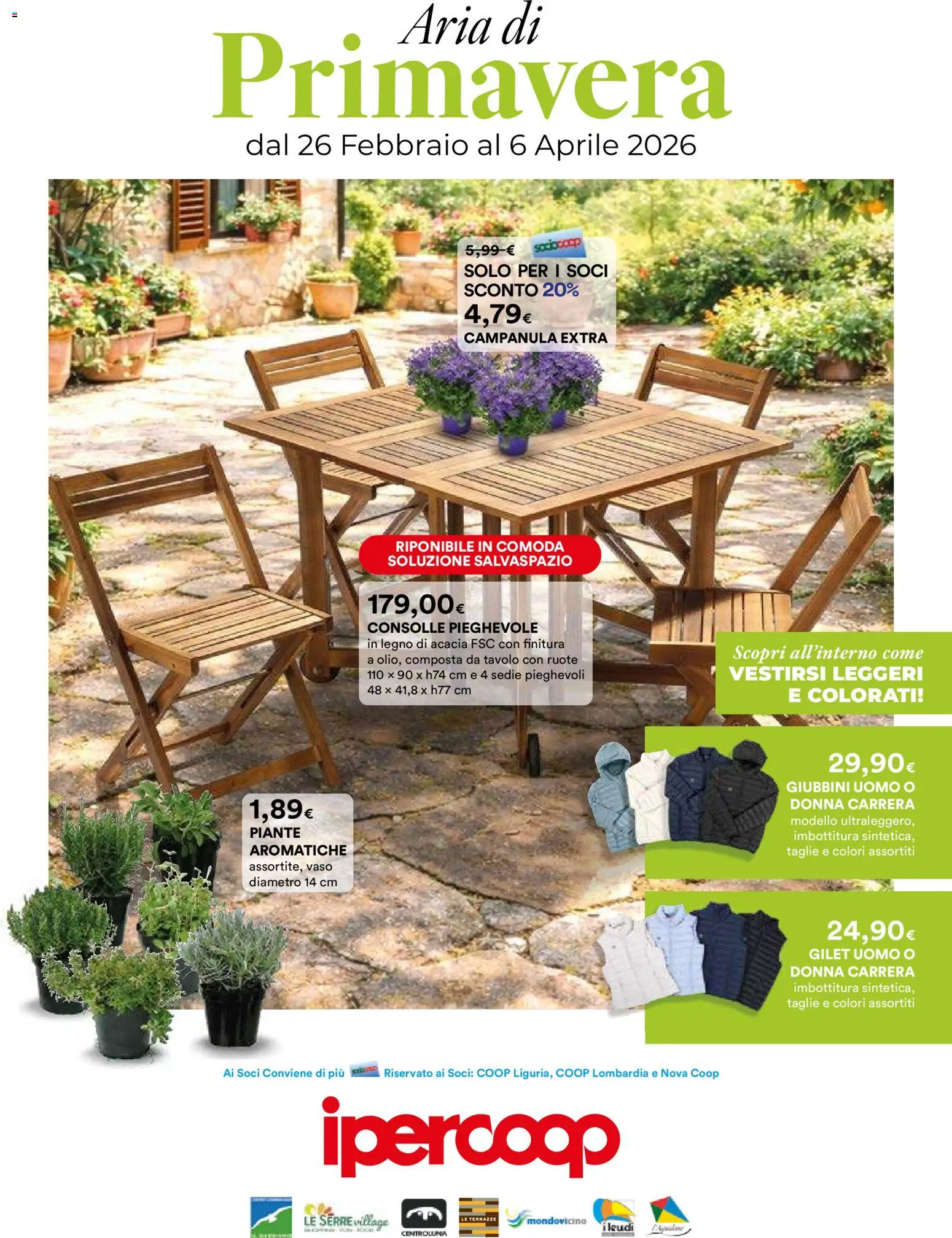 {"143912":[{"boxes":[{"content":"Aria di","coord":[[323,2],[442,2],[442,38],[323,38]]},{"content":"Primavera","coord":[[169,19],[598,35],[596,99],[169,98]]},{"content":"sociocoop","coord":[[427,196],[475,191],[476,202],[427,206]]},{"content":"SOLO PER I SOCI","coord":[[377,212],[496,212],[496,227],[377,227]]},{"content":"CAMPANULA EXTRA","coord":[[375,268],[495,267],[495,280],[375,281]]},{"content":"RIPONIBILE IN COMODA","coord":[[320,437],[459,438],[459,451],[320,450]]},{"content":"SOLUZIONE SALVASPAZIO","coord":[[315,450],[466,450],[466,462],[315,462]]},{"content":"CONSOLLE PIEGHEVOLE","coord":[[298,505],[438,504],[438,516],[298,517]]},{"content":"in legno di acacia FSC con finitura","coord":[[298,519],[459,519],[459,529],[298,530]]},{"content":"a olio, composta da tavolo con ruote","coord":[[298,532],[470,532],[470,542],[298,542]]},{"content":"Scopri all'interno come","coord":[[591,523],[754,523],[754,539],[591,539]]},{"content":"VESTIRSI LEGGERI","coord":[[592,539],[754,539],[754,556],[592,556]]},{"content":"E COLORATI","coord":[[636,558],[752,557],[752,574],[636,574]]},{"content":"GIUBBINI UOMO O","coord":[[638,633],[745,634],[745,647],[638,646]]},{"content":"DONNA CARRERA","coord":[[641,648],[745,648],[745,661],[641,660]]},{"content":"modello ultraleggero,","coord":[[642,663],[744,664],[743,675],[642,673]]},{"content":"PIANTE","coord":[[202,673],[245,673],[245,683],[202,683]]},{"content":"imbottitura sintetica,","coord":[[645,675],[745,676],[745,686],[644,685]]},{"content":"AROMATICHE","coord":[[201,686],[283,685],[283,698],[201,698]]},{"content":"taglie e colori assortiti","coord":[[640,688],[745,688],[745,698],[640,699]]},{"content":"assortite, vaso","coord":[[201,701],[271,701],[271,711],[201,711]]},{"content":"diametro 14 cm","coord":[[202,713],[274,713],[274,723],[202,723]]},{"content":"GILET UOMO O","coord":[[656,769],[745,769],[745,783],[656,782]]},{"content":"DONNA CARRERA","coord":[[645,784],[745,785],[745,797],[644,796]]},{"content":"imbottitura sintetica,","coord":[[644,799],[744,799],[744,809],[644,809]]},{"content":"taglie e colori assortiti","coord":[[641,812],[745,811],[745,822],[641,823]]},{"content":"Ai Soci Conviene di pi\u00f9 me Riservato ai Soci COOP Liguria, COOP Lombardia e Nova Coop","coord":[[180,867],[587,867],[587,880],[180,879]]},{"content":"ipercoop","coord":[[257,893],[511,897],[510,965],[257,962]]},{"content":"LE SERRE village","coord":[[246,989],[317,989],[316,1000],[246,999]]},{"content":"LE TERRAZZE","coord":[[373,989],[405,989],[405,996],[373,996]]},{"content":"mondovicino","coord":[[415,989],[478,990],[478,998],[415,997]]},{"content":"ileudi","coord":[[489,995],[515,995],[515,1003],[489,1003]]}]}]}Le offerte sono valide dal 26/02/2026 - 06/04/2026, ma attenzione: gli sconti sono disponibili solo per un periodo limitato! Sfoglia subito il volantino e scopri prezzi straordinari su frutta e verdura, carne e pesce, latticini e prodotti da forno. Ogni settimana, Ipercoop ti garantisce la massima qualità a prezzi imbattibili.