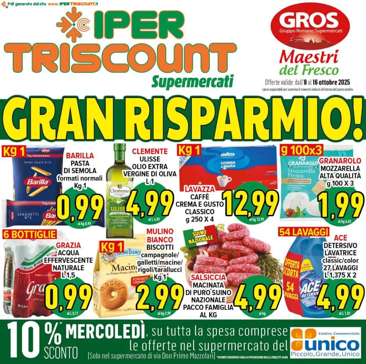 Il nuovo volantino Ipertriscount è sfogliabile online comodamente da casa o dal tuo smartphone, così puoi scoprire in pochi secondi tutte le offerte attive. All’interno troverai informazioni chiare su quali prodotti sono in sconto e fino a quando sono validi (08/10/2025 - 16/10/2025), per aiutarti a cogliere al volo le promozioni prima che finiscano. Ogni settimana sono disponibili sconti su alimentari freschi, prodotti per la casa e articoli stagionali, perfetti per pianificare la spesa senza stress e con il massimo risparmio!