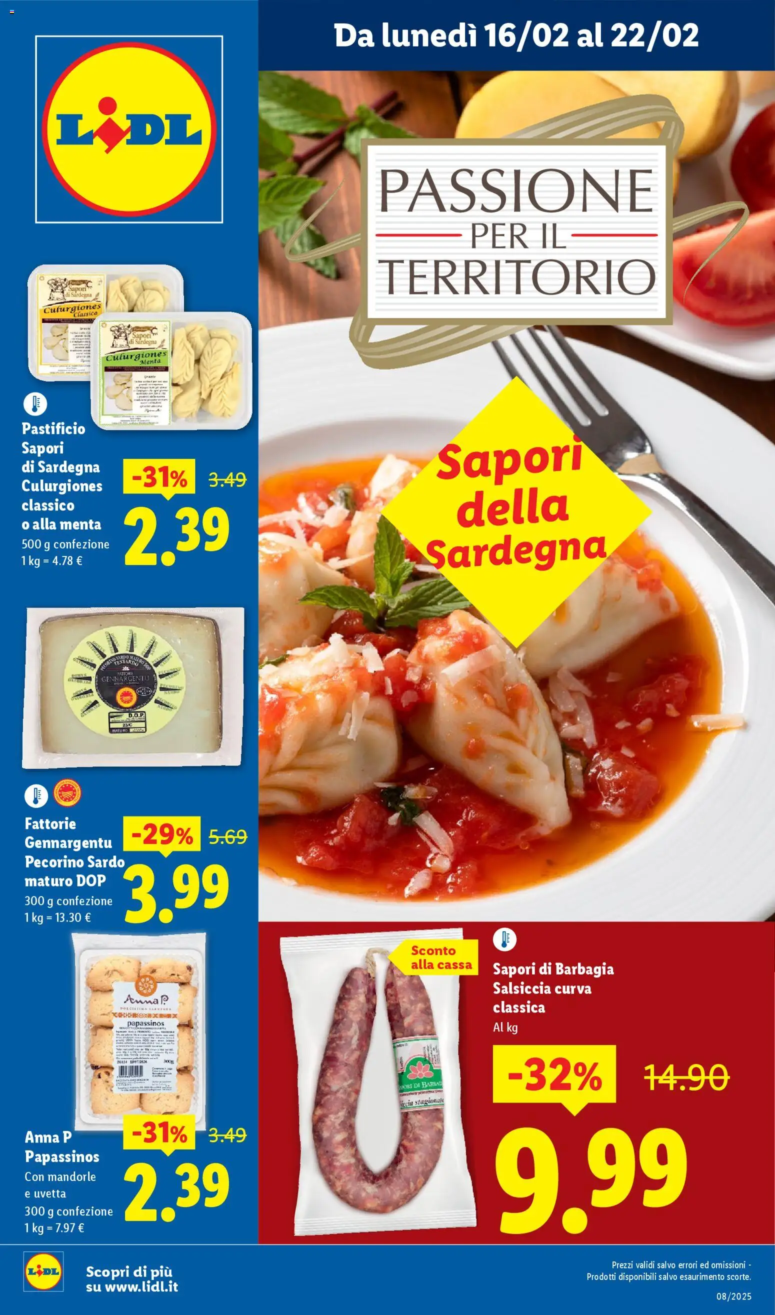 {"141884":[{"boxes":[{"content":"Da luned\u00ec 16\/02 al 22\/02","coord":[[329,17],[703,16],[703,53],[329,55]]},{"content":"L DL","coord":[[54,102],[201,96],[203,146],[55,150]]},{"content":"PASSIONE","coord":[[380,165],[656,164],[656,214],[380,215]]},{"content":"PER IL","coord":[[467,219],[569,218],[569,250],[467,251]]},{"content":"TERRITORIO","coord":[[383,257],[654,255],[654,296],[383,298]]},{"content":"Saporivo","coord":[[65,285],[93,283],[93,290],[65,292]]},{"content":"ich Sardegna","coord":[[61,291],[100,291],[100,299],[61,299]]},{"content":"Culurgiones","coord":[[42,307],[100,302],[101,310],[43,315]]},{"content":"Classico","coord":[[72,311],[98,309],[99,316],[72,318]]},{"content":"\u20b9 Sapori mo","coord":[[126,331],[158,330],[158,337],[126,339]]},{"content":"di Sardegna","coord":[[126,338],[157,339],[157,345],[126,344]]},{"content":"Culurgiones","coord":[[105,354],[167,349],[167,357],[105,362]]},{"content":"Menta","coord":[[139,359],[160,358],[161,363],[139,365]]},{"content":"Pastificio","coord":[[21,420],[85,420],[85,436],[20,436]]},{"content":"Sapori","coord":[[21,440],[64,440],[63,454],[20,455]]},{"content":"di Sardegna","coord":[[22,458],[100,459],[100,475],[22,474]]},{"content":"Sapori","coord":[[434,443],[582,436],[584,482],[435,491]]},{"content":"Culurgiones","coord":[[20,477],[102,477],[101,494],[20,493]]},{"content":"classico","coord":[[21,497],[76,496],[76,513],[21,513]]},{"content":"della","coord":[[454,488],[570,485],[571,524],[456,530]]},{"content":"o alla menta","coord":[[19,517],[102,517],[101,532],[19,531]]},{"content":"Sardegna","coord":[[412,534],[607,529],[609,568],[412,574]]},{"content":"PECORINO SARDO MATI RO DOP","coord":[[98,654],[152,654],[152,671],[98,671]]},{"content":"TESTARDO","coord":[[111,658],[139,658],[139,667],[111,666]]},{"content":"FATTONE","coord":[[116,670],[133,671],[132,675],[116,675]]},{"content":"GENNARGENTU","coord":[[101,676],[149,675],[149,681],[101,682]]},{"content":"D.O.P.","coord":[[127,712],[144,712],[144,717],[127,717]]},{"content":"Fattorie","coord":[[24,815],[75,816],[75,830],[23,830]]},{"content":"Gennargentu","coord":[[23,834],[111,835],[111,851],[23,850]]},{"content":"Pecorino Sardo","coord":[[24,854],[123,853],[124,868],[24,869]]},{"content":"maturo DOP","coord":[[23,874],[106,873],[107,887],[23,888]]},{"content":"Sconto","coord":[[411,945],[455,945],[454,956],[411,955]]},{"content":"alla cassa","coord":[[411,958],[473,959],[472,971],[411,970]]},{"content":"Sapori di Barbagia","coord":[[490,960],[616,960],[616,978],[490,977]]},{"content":"Anna","coord":[[124,992],[169,993],[169,1006],[123,1005]]},{"content":"Salsiccia curva","coord":[[491,979],[592,980],[592,996],[491,994]]},{"content":"classica","coord":[[492,1000],[546,1000],[546,1014],[492,1014]]},{"content":"papassinos","coord":[[126,1020],[164,1020],[164,1026],[126,1027]]},{"content":"Al kg","coord":[[493,1020],[519,1022],[517,1034],[492,1032]]},{"content":"VORI DI BARBA","coord":[[398,1083],[442,1080],[442,1086],[398,1090]]},{"content":"Skcia stagionale","coord":[[399,1100],[444,1096],[444,1103],[399,1108]]},{"content":"Anna P","coord":[[23,1129],[71,1129],[71,1143],[23,1144]]},{"content":"Papassinos","coord":[[22,1148],[102,1148],[102,1164],[22,1165]]},{"content":"Con mandorle","coord":[[23,1170],[97,1169],[97,1182],[23,1183]]},{"content":"e uvetta","coord":[[23,1188],[68,1188],[68,1199],[23,1199]]},{"content":"LIDL","coord":[[29,1263],[58,1264],[59,1276],[29,1276]]},{"content":"Scopri di pi\u00f9","coord":[[84,1264],[174,1263],[174,1279],[84,1279]]},{"content":"Prezzi validi salvo errori ed omissioni","coord":[[608,1259],[750,1259],[750,1269],[608,1269]]},{"content":"su www.lidl.it","coord":[[85,1280],[178,1280],[178,1293],[85,1293]]},{"content":"Prodotti disponibili salvo esaurimento scorte.","coord":[[585,1271],[751,1271],[751,1282],[585,1282]]}]}]}Le offerte sono valide dal 16/02/2026 - 22/02/2026, ma attenzione: gli sconti sono disponibili solo per un periodo limitato! Sfoglia subito il volantino e scopri prezzi straordinari su frutta e verdura, carne e pesce, latticini e prodotti da forno. Ogni settimana, Lidl ti garantisce la massima qualità a prezzi imbattibili.