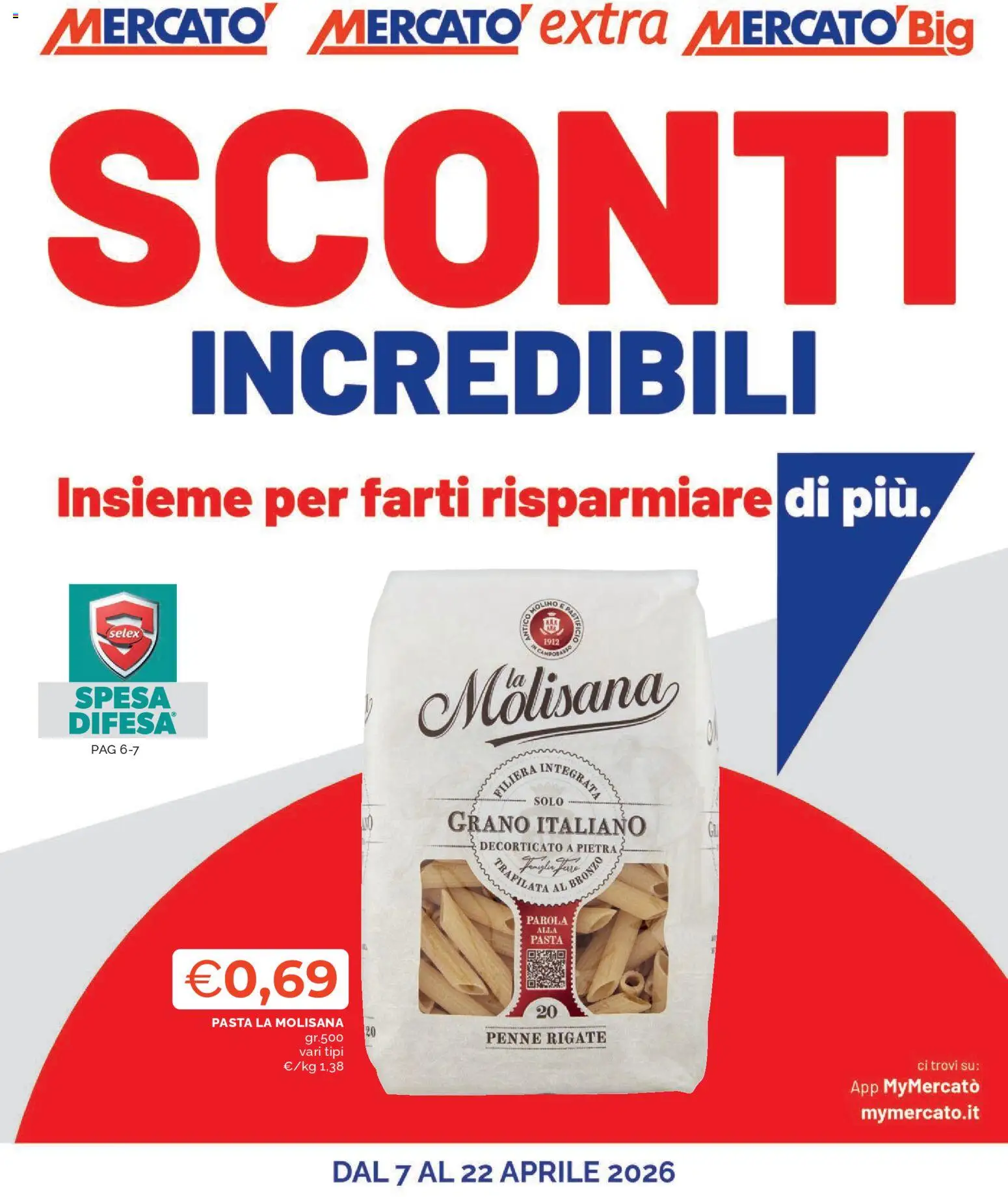 {"149407":[{"boxes":[{"content":"MERCATO","coord":[[30,6],[206,4],[207,39],[30,42]]},{"content":"MERCATO extra MERCATO Big","coord":[[227,5],[751,6],[751,41],[227,40]]},{"content":"SCONTI","coord":[[33,76],[742,76],[743,239],[33,240]]},{"content":"INCREDIBILI","coord":[[140,249],[628,250],[628,323],[140,321]]},{"content":"Insieme per farti risparmiare di pi\u00f9.","coord":[[41,361],[717,360],[717,406],[41,407]]},{"content":"PASTIFICIO","coord":[[441,464],[447,492],[439,495],[432,465]]},{"content":"selex","coord":[[83,482],[117,482],[117,493],[83,492]]},{"content":"IN CAMPOBASSO","coord":[[406,491],[442,490],[442,504],[406,505]]},{"content":"ANTICO","coord":[[402,492],[402,471],[409,471],[408,491]]},{"content":"SPESA","coord":[[54,526],[136,527],[135,547],[54,545]]},{"content":"Molisana","coord":[[317,517],[523,500],[527,549],[318,568]]},{"content":"DIFESA\u00ae","coord":[[49,545],[138,544],[138,565],[50,567]]},{"content":"PAG 67","coord":[[68,570],[108,571],[107,582],[68,581]]},{"content":"FILIERA INTEGRAT.","coord":[[376,587],[464,587],[465,613],[376,614]]},{"content":"SOLO","coord":[[408,611],[432,611],[432,621],[408,621]]},{"content":"GRANO ITALIANO","coord":[[344,623],[497,625],[496,645],[344,642]]},{"content":"DECORTICATO A PIETRA","coord":[[366,645],[475,646],[475,659],[365,656]]},{"content":"TRAFILATA AL BRONZO","coord":[[378,659],[464,658],[464,684],[378,685]]},{"content":"PAROLA","coord":[[403,703],[437,704],[437,712],[403,711]]},{"content":"ALI.A","coord":[[412,712],[429,712],[429,718],[412,718]]},{"content":"PASTA","coord":[[407,719],[433,719],[433,727],[407,726]]},{"content":"PASTA LA MOLISANA","coord":[[162,782],[265,781],[265,790],[162,791]]},{"content":"PENNE RIGATE","coord":[[373,792],[466,791],[466,803],[373,804]]},{"content":"vari tipi","coord":[[229,804],[264,804],[264,814],[229,815]]},{"content":"ci trovi su","coord":[[704,813],[755,814],[755,825],[704,824]]},{"content":"App MyMercat\u00f2","coord":[[652,828],[753,828],[753,844],[652,844]]},{"content":"mymercato.it","coord":[[661,849],[753,848],[753,863],[661,863]]}]}]}Le offerte sono valide dal 07/04/2026 - 22/04/2026, ma attenzione: gli sconti sono disponibili solo per un periodo limitato! Sfoglia subito il volantino e scopri prezzi straordinari su frutta e verdura, carne e pesce, latticini e prodotti da forno. Ogni settimana, Mercatò ti garantisce la massima qualità a prezzi imbattibili.