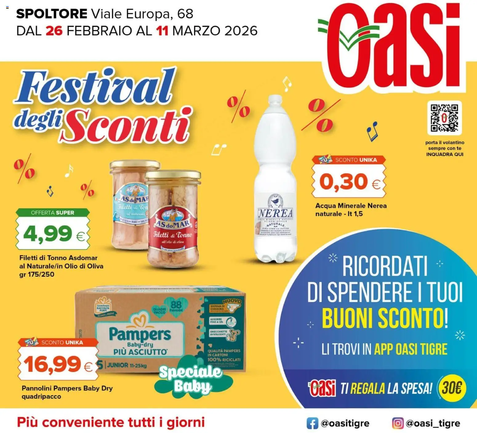 {"143867":[{"boxes":[{"content":"SPOLTORE Viale Europa, 68","coord":[[19,11],[316,11],[316,34],[19,32]]},{"content":"Gasi","coord":[[527,4],[753,2],[755,143],[528,153]]},{"content":"Festival","coord":[[22,106],[290,106],[290,173],[22,173]]},{"content":"degliSconti","coord":[[20,171],[313,171],[311,237],[20,232]]},{"content":"porta il volantino","coord":[[690,228],[754,227],[754,234],[690,235]]},{"content":"sempre con te","coord":[[694,237],[750,237],[750,244],[694,244]]},{"content":"SCONTO UNIKA","coord":[[544,253],[612,253],[612,263],[544,263]]},{"content":"INQUADRA QUI","coord":[[692,246],[753,246],[753,253],[692,254]]},{"content":"ASdoMAR","coord":[[197,317],[239,317],[239,329],[197,328]]},{"content":"Filetti di Ton","coord":[[191,330],[241,330],[241,341],[191,341]]},{"content":"Acqua Minerale Nerea","coord":[[511,328],[629,328],[629,339],[511,339]]},{"content":"OFFERTA SUPER","coord":[[49,339],[120,339],[120,348],[49,348]]},{"content":"NEREA","coord":[[419,336],[477,336],[477,353],[419,353]]},{"content":"AS do MAR","coord":[[248,356],[309,354],[309,369],[248,370]]},{"content":".NATURALE.","coord":[[430,362],[464,361],[464,368],[430,369]]},{"content":"PURA COME LA NATURA","coord":[[424,368],[470,368],[470,372],[424,372]]},{"content":"Filetti di Tonno","coord":[[248,374],[312,375],[312,386],[247,385]]},{"content":"","coord":[[423,375],[471,375],[471,379],[423,379]]},{"content":"all'olio di elina","coord":[[262,389],[299,389],[299,395],[261,395]]},{"content":"Filetti di Tonno Asdomar","coord":[[29,411],[158,412],[158,424],[29,423]]},{"content":"RICORDATI","coord":[[554,413],[699,412],[699,448],[554,449]]},{"content":"al Naturale\/in Olio di Oliva","coord":[[32,425],[168,425],[168,437],[32,437]]},{"content":"DI SPENDERE I TUOI","coord":[[496,454],[753,454],[753,493],[496,493]]},{"content":"NUOVO","coord":[[360,484],[392,483],[392,492],[360,493]]},{"content":"RACCOLTA","coord":[[157,497],[177,497],[177,501],[157,501]]},{"content":"SISTEMA DI","coord":[[342,494],[366,494],[366,498],[342,498]]},{"content":"PUNTI","coord":[[160,502],[174,501],[174,505],[160,505]]},{"content":"QUADRI","coord":[[248,499],[270,499],[270,504],[248,504]]},{"content":"Pannolini","coord":[[273,500],[297,499],[297,506],[273,506]]},{"content":"CHIUSURA","coord":[[341,499],[364,499],[364,502],[341,503]]},{"content":"BUONI SCONTO","coord":[[522,496],[727,496],[728,534],[522,535]]},{"content":"PACCO","coord":[[249,504],[268,504],[268,509],[249,508]]},{"content":"ASSORBE","coord":[[342,515],[363,515],[363,521],[342,521]]},{"content":"FINO A 12h","coord":[[342,519],[361,519],[361,525],[342,524]]},{"content":"Pampers","coord":[[176,530],[280,530],[279,554],[176,553]]},{"content":"ORECCHIETTE","coord":[[340,535],[369,535],[369,539],[340,540]]},{"content":"AVVOLGENTI","coord":[[340,540],[367,540],[367,544],[340,544]]},{"content":"U SCONTO UNIKA","coord":[[48,551],[135,549],[136,560],[48,561]]},{"content":"Babydry","coord":[[204,552],[250,553],[250,564],[204,562]]},{"content":"PI\u00d9 ASCIUTTO\u00ae","coord":[[182,563],[272,563],[272,576],[182,576]]},{"content":"QUALIT\u00c0 PAMPERS","coord":[[336,565],[391,565],[391,572],[336,572]]},{"content":"LI TROVI IN APP OASI TIGRE","coord":[[521,554],[727,553],[727,576],[521,576]]},{"content":"IN CARTONI","coord":[[336,572],[370,572],[370,578],[336,579]]},{"content":"Speciale","coord":[[256,591],[360,591],[360,615],[256,615]]},{"content":"Pannolini Pampers Baby Dry","coord":[[33,623],[184,624],[184,637],[33,636]]},{"content":"Baby","coord":[[278,614],[342,616],[342,639],[278,638]]},{"content":"Casi TI REGALA LA SPESA 30\u20ac","coord":[[501,614],[752,614],[752,643],[501,643]]},{"content":"quadripacco","coord":[[34,638],[100,638],[100,649],[34,649]]},{"content":"Pi\u00f9 conveniente tutti i giorni","coord":[[26,673],[335,673],[334,696],[26,695]]},{"content":"@oasitigre","coord":[[519,678],[600,679],[600,695],[519,695]]},{"content":"@oasitigre","coord":[[659,679],[750,679],[750,695],[659,694]]}]}]}Le offerte sono valide dal 26/02/2026 - 11/03/2026, ma attenzione: gli sconti sono disponibili solo per un periodo limitato! Sfoglia subito il volantino e scopri prezzi straordinari su frutta e verdura, carne e pesce, latticini e prodotti da forno. Ogni settimana, Oasi ti garantisce la massima qualità a prezzi imbattibili.