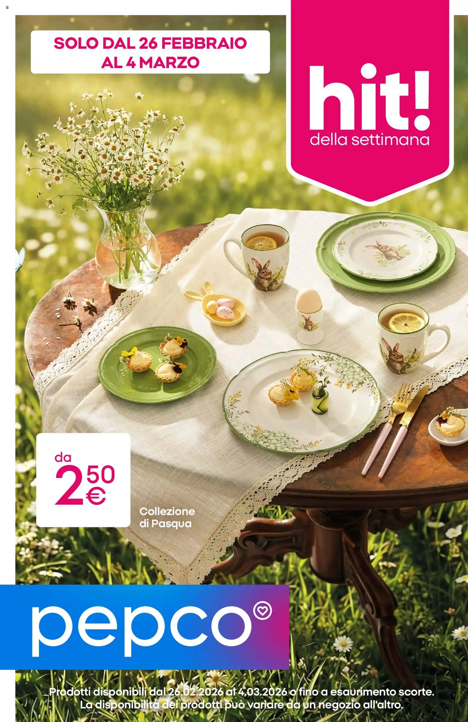 {"144200":[{"boxes":[{"content":"SOLO DAL 26 FEBBRAIO","coord":[[87,57],[412,57],[412,82],[87,82]]},{"content":"AL 4 MARZO","coord":[[166,91],[329,91],[330,114],[166,114]]},{"content":"hit","coord":[[507,101],[718,107],[712,219],[507,219]]},{"content":"della settimana","coord":[[510,218],[715,218],[715,244],[510,243]]},{"content":"Collezione","coord":[[230,837],[323,838],[323,856],[230,855]]},{"content":"di Pasqua","coord":[[229,857],[319,859],[318,878],[228,875]]},{"content":"pepco\u00ae","coord":[[53,1000],[442,995],[442,1083],[53,1091]]},{"content":"La disponibilit\u00e0 dei prodotti pu\u00f2 variare da un negozio all'altro.","coord":[[127,1157],[668,1157],[668,1177],[127,1176]]}]}]}Le promozioni sono valide dal 26/02/2026 - 04/03/2026, ma fai attenzione: gli sconti sono limitati nel tempo e i prodotti più richiesti potrebbero terminare presto. Non perdere l’occasione di scoprire cosa Pepco ha preparato per te questa settimana: prezzi imbattibili e qualità garantita!