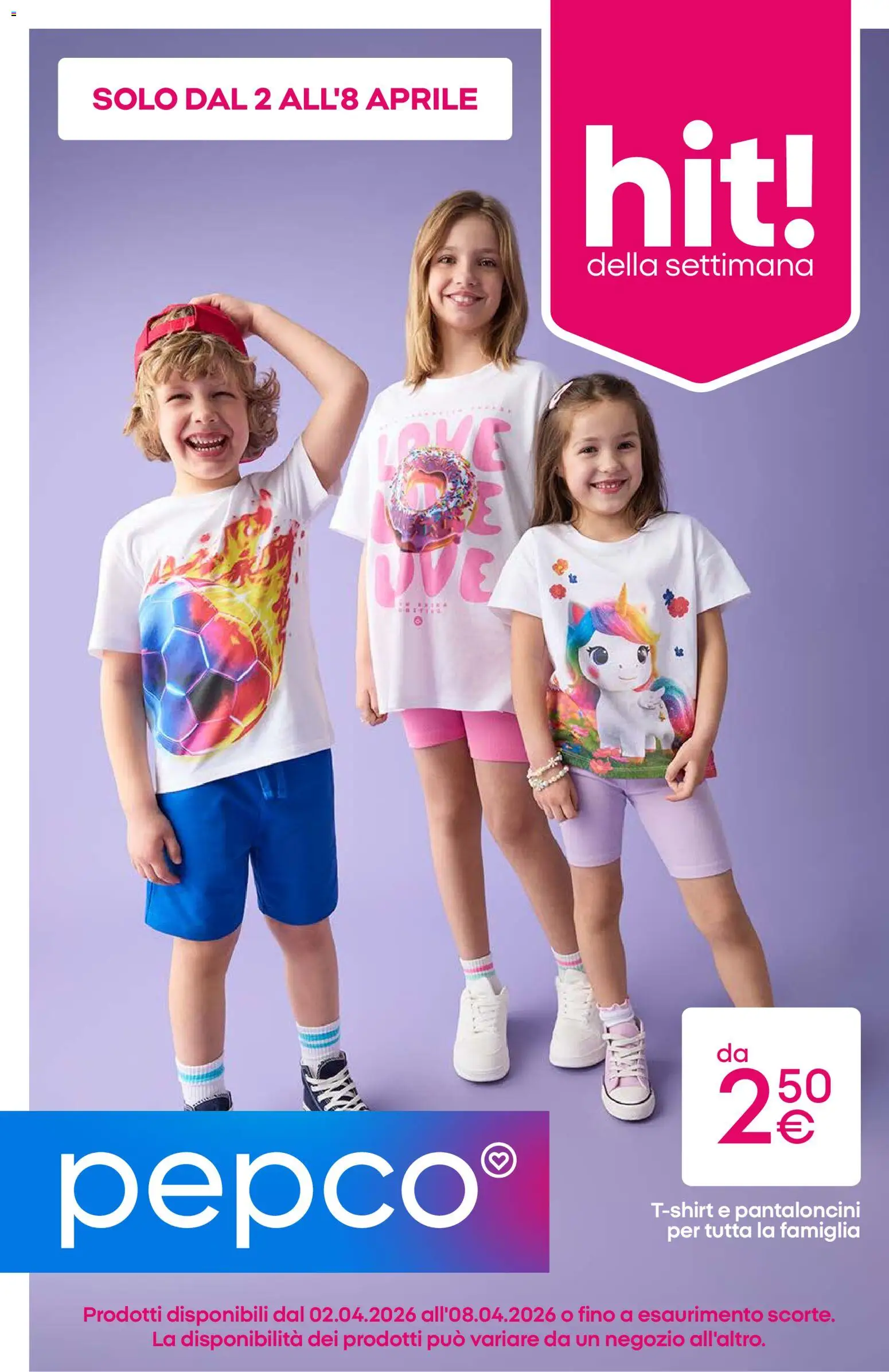 {"148855":[{"boxes":[{"content":"SOLO DAL 2 ALL'8 APRILE","coord":[[78,72],[420,71],[420,97],[78,98]]},{"content":"hit","coord":[[506,101],[715,104],[710,218],[504,218]]},{"content":"della settimana","coord":[[509,217],[711,219],[710,244],[509,242]]},{"content":"pepco\u00ae","coord":[[48,1005],[451,992],[454,1074],[51,1088]]},{"content":"Tshirt e pantaloncini","coord":[[564,1045],[750,1045],[750,1064],[564,1064]]},{"content":"per tutta la famiglia","coord":[[577,1065],[750,1064],[750,1084],[577,1084]]},{"content":"La disponibilit\u00e0 dei prodotti pu\u00f2 variare da un negozio all'altro.","coord":[[131,1157],[667,1157],[667,1177],[131,1177]]}]}]}Le promozioni sono valide dal 02/04/2026 - 08/04/2026, ma fai attenzione: gli sconti sono limitati nel tempo e i prodotti più richiesti potrebbero terminare presto. Non perdere l’occasione di scoprire cosa Pepco ha preparato per te questa settimana: prezzi imbattibili e qualità garantita!