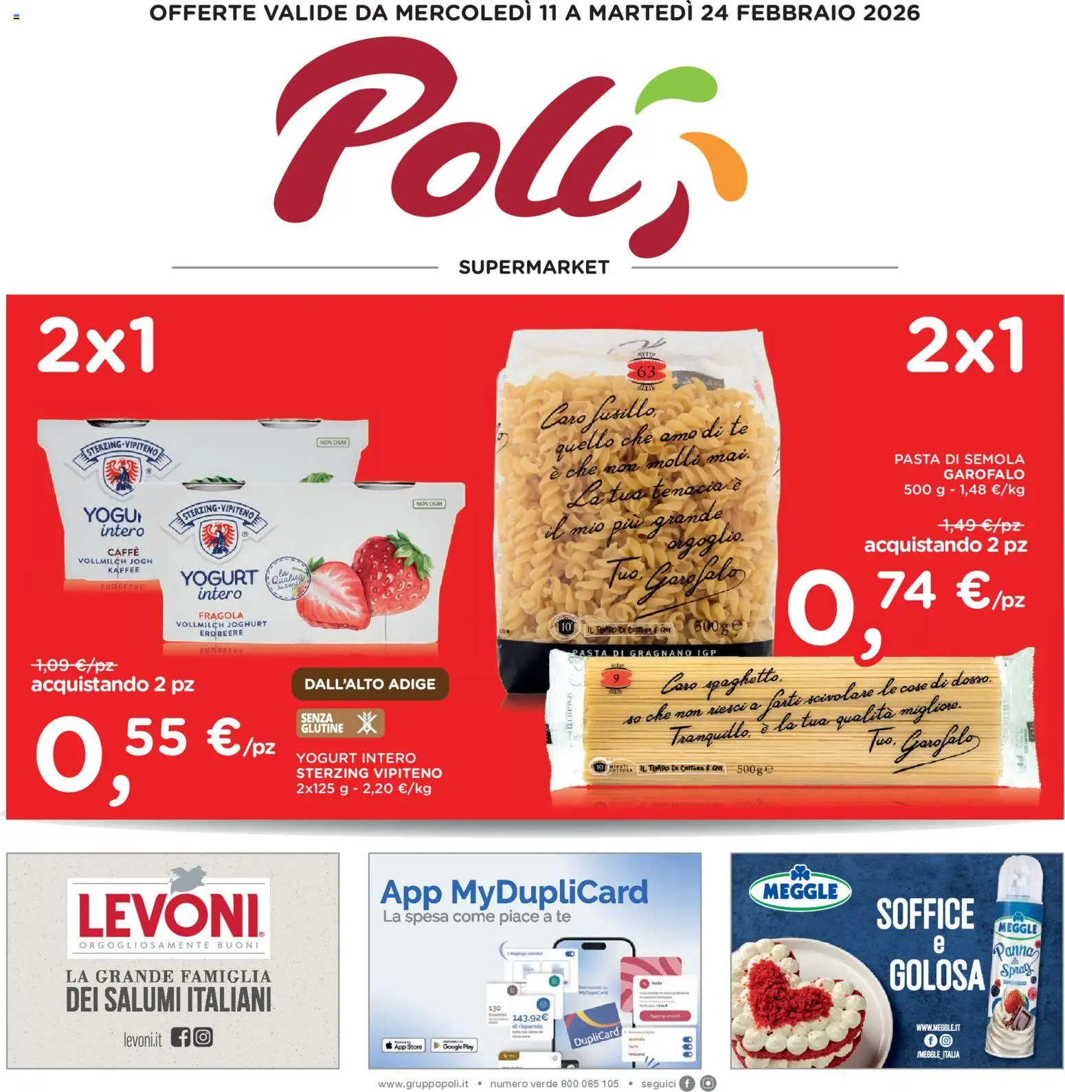{"141842":[{"boxes":[{"content":"Polis","coord":[[187,32],[544,43],[540,185],[191,169]]},{"content":"SUPERMARKET","coord":[[331,187],[444,187],[444,201],[331,201]]},{"content":"Caro fusillo","coord":[[392,294],[474,285],[477,306],[392,316]]},{"content":"STERZING. VIPITENO","coord":[[61,321],[115,320],[115,332],[61,332]]},{"content":"NON OGM","coord":[[230,317],[251,317],[251,325],[230,325]]},{"content":"quello che amo di te","coord":[[400,318],[544,300],[545,316],[400,333]]},{"content":"\u00e8 che non molli mai.","coord":[[400,336],[545,321],[546,336],[400,349]]},{"content":"PASTA DI SEMOLA","coord":[[648,327],[747,327],[747,339],[648,340]]},{"content":"GAROFALO","coord":[[682,340],[745,339],[745,350],[682,350]]},{"content":"La tua tenacia \u00e8","coord":[[409,352],[541,344],[541,361],[411,371]]},{"content":"YOGUI","coord":[[60,367],[104,367],[104,381],[60,380]]},{"content":"STERZING VIPITENO","coord":[[129,367],[184,367],[185,378],[129,378]]},{"content":"NON COM","coord":[[302,362],[324,362],[325,370],[303,370]]},{"content":"intero","coord":[[72,381],[105,382],[105,391],[72,391]]},{"content":"il mio pi\u00f9 grande","coord":[[395,380],[528,365],[529,379],[395,395]]},{"content":"orgoglio.","coord":[[461,390],[540,381],[541,396],[463,404]]},{"content":"acquistando 2 pz","coord":[[628,389],[749,389],[749,404],[628,404]]},{"content":"CAFFE","coord":[[77,398],[101,398],[101,404],[77,404]]},{"content":"VOLLMILCH JOGH","coord":[[56,405],[111,405],[111,411],[56,410]]},{"content":"KAFFEE","coord":[[77,411],[101,411],[101,417],[77,417]]},{"content":"YOGURT","coord":[[129,412],[189,411],[189,426],[129,427]]},{"content":"Two Garofalo","coord":[[443,408],[540,401],[542,426],[445,431]]},{"content":"74 \u20ac\/pz","coord":[[635,411],[749,412],[749,448],[634,448]]},{"content":"LUOBERKE","coord":[[73,423],[104,424],[104,429],[72,428]]},{"content":"intero","coord":[[143,427],[177,427],[177,437],[143,437]]},{"content":"FRAGOLA","coord":[[144,445],[177,444],[177,450],[144,450]]},{"content":"VOLLMILCH JOGHURT","coord":[[127,451],[194,451],[194,456],[127,456]]},{"content":"ERDBEERE","coord":[[144,458],[177,457],[177,463],[144,463]]},{"content":"IL TEMPO DI COTTURA \u00c8 QUI","coord":[[426,454],[488,454],[488,461],[426,461]]},{"content":"ENOREECH","coord":[[146,470],[177,471],[177,477],[146,475]]},{"content":"PASTA DI GRAGNANO IGP","coord":[[415,471],[521,471],[521,478],[415,478]]},{"content":"acquistando 2 pz","coord":[[21,492],[143,491],[144,505],[21,507]]},{"content":"DALL'ALTO ADIGE","coord":[[220,491],[317,491],[317,503],[220,503]]},{"content":"Caro spaghetto.","coord":[[477,489],[568,481],[570,499],[478,507]]},{"content":"GLUTINE X","coord":[[217,516],[277,516],[277,535],[217,533]]},{"content":"so che non riesci a farti scivolare le cose di dosso.","coord":[[453,515],[723,484],[725,499],[454,530]]},{"content":"Two. Garofalo","coord":[[629,527],[712,524],[713,548],[630,550]]},{"content":"Tranquillo, \u00e8 la tua qualit\u00e0 migliore.","coord":[[485,528],[700,504],[702,520],[487,545]]},{"content":"YOGURT INTERO","coord":[[214,545],[301,545],[301,555],[214,556]]},{"content":"STERZING VIPITENO","coord":[[216,557],[322,556],[322,568],[216,568]]},{"content":"LEVONI","coord":[[56,647],[191,648],[191,684],[56,683]]},{"content":"App MyDupliCard","coord":[[275,639],[471,637],[472,659],[275,661]]},{"content":"MEGGLE","coord":[[552,641],[610,640],[610,654],[553,655]]},{"content":"La spesa come piace a te","coord":[[277,662],[415,661],[415,672],[277,672]]},{"content":"SOFFICE","coord":[[636,653],[709,652],[709,676],[636,677]]},{"content":"MEGGLE","coord":[[725,670],[754,671],[754,679],[725,678]]},{"content":"ORGOGLIOSAMENTE BUONI","coord":[[54,682],[193,682],[193,691],[54,691]]},{"content":"Panna","coord":[[725,685],[754,686],[753,697],[724,695]]},{"content":"LA GRANDE FAMIGLIA","coord":[[47,703],[199,703],[199,717],[47,717]]},{"content":"GOLOSA","coord":[[645,695],[719,696],[719,721],[646,721]]},{"content":"Spray","coord":[[727,700],[752,698],[753,710],[727,711]]},{"content":"DEI SALUMI ITALIANI","coord":[[47,717],[199,717],[199,736],[47,736]]},{"content":"MyDupocard","coord":[[420,720],[442,720],[442,724],[420,724]]},{"content":"Sconelel","coord":[[355,736],[369,736],[369,740],[355,741]]},{"content":"di risparmio","coord":[[372,744],[395,744],[395,748],[372,748]]},{"content":"levoni.it fo","coord":[[89,751],[153,748],[153,761],[89,763]]},{"content":"WWW.MEGGLE.IT","coord":[[665,744],[699,744],[699,750],[665,750]]},{"content":"","coord":[[372,749],[396,749],[396,752],[372,752]]},{"content":"al App Store Google Play","coord":[[279,755],[345,756],[345,765],[279,764]]},{"content":"DupliCard","coord":[[415,755],[450,745],[452,753],[417,762]]},{"content":"Sourdata","coord":[[456,754],[469,753],[470,757],[456,758]]},{"content":"IMEGGLE ITALIA","coord":[[666,763],[698,763],[698,770],[666,770]]},{"content":"www.gruppopoli.it .","coord":[[276,784],[351,784],[351,792],[276,791]]}]}]}Le offerte sono valide dal 11/02/2026 - 24/02/2026, ma attenzione: gli sconti sono disponibili solo per un periodo limitato! Sfoglia subito il volantino e scopri prezzi straordinari su frutta e verdura, carne e pesce, latticini e prodotti da forno. Ogni settimana, Poli ti garantisce la massima qualità a prezzi imbattibili.
