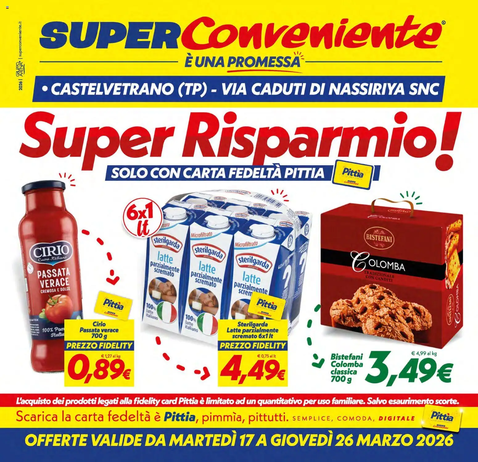 {"146336":[{"boxes":[{"content":"SUPERConveniente\u00ae","coord":[[60,26],[721,22],[722,81],[60,83]]},{"content":"\u00c8 UNA PROMESSA","coord":[[297,85],[488,86],[488,112],[297,111]]},{"content":"\u00b7 CASTELVETRANO TP VIA CADUTI DI NASSIRIYA SNC","coord":[[68,130],[713,129],[713,157],[68,158]]},{"content":"Super Risparmio","coord":[[30,180],[744,178],[745,271],[30,281]]},{"content":"SOLO CON CARTA FEDELT\u00c0 PITTIA","coord":[[177,267],[527,265],[527,291],[177,292]]},{"content":"Pittia","coord":[[554,271],[592,275],[589,290],[552,285]]},{"content":"sterilgant","coord":[[455,359],[474,363],[473,367],[454,363]]},{"content":"trato","coord":[[261,362],[274,360],[275,367],[261,369]]},{"content":"BISTEFANI","coord":[[594,378],[636,382],[635,393],[593,389]]},{"content":"sterilgarda","coord":[[250,382],[293,390],[290,403],[248,394]]},{"content":"Microfiltrato","coord":[[309,375],[345,375],[345,384],[309,384]]},{"content":"Microfiltrato","coord":[[380,390],[418,390],[418,399],[380,399]]},{"content":"CIRIO","coord":[[51,401],[110,395],[111,411],[52,417]]},{"content":"latte","coord":[[254,405],[283,413],[280,427],[252,421]]},{"content":"sterilgarda","coord":[[314,398],[363,406],[360,420],[312,410]]},{"content":"COLOMBA","coord":[[567,402],[660,420],[657,446],[565,444]]},{"content":"Cuore Italiana","coord":[[61,418],[107,413],[108,420],[61,424]]},{"content":"parzialmente","coord":[[244,420],[291,432],[289,443],[242,431]]},{"content":"latte","coord":[[322,421],[352,430],[348,445],[319,439]]},{"content":"sterilgarda","coord":[[387,415],[438,422],[435,435],[386,426]]},{"content":"scremato","coord":[[250,433],[283,441],[281,449],[248,441]]},{"content":"PASSATA","coord":[[59,437],[110,431],[112,447],[61,452]]},{"content":"parzialmente","coord":[[310,436],[361,448],[358,459],[307,448]]},{"content":"latte","coord":[[391,439],[426,448],[423,462],[388,454]]},{"content":"CON CANDITI","coord":[[591,444],[638,451],[637,458],[590,451]]},{"content":"scremato","coord":[[316,449],[351,458],[349,466],[314,457]]},{"content":"VERACE","coord":[[65,453],[111,448],[113,461],[66,467]]},{"content":"parzialmente","coord":[[379,454],[435,467],[433,478],[376,465]]},{"content":"screm","coord":[[386,467],[408,472],[407,480],[385,475]]},{"content":"CREMOSA E DOLCE","coord":[[65,469],[113,464],[114,470],[65,476]]},{"content":"Pitt\u00eca","coord":[[169,482],[201,490],[198,504],[166,495]]},{"content":"Pittia","coord":[[416,483],[451,490],[447,503],[413,495]]},{"content":"latte","coord":[[238,500],[249,504],[247,509],[235,505]]},{"content":"italiano","coord":[[237,506],[257,513],[255,519],[235,512]]},{"content":"COLOMBA","coord":[[737,521],[737,458],[746,458],[746,521]]},{"content":"latte","coord":[[301,518],[313,523],[311,529],[298,523]]},{"content":"Cirio","coord":[[150,520],[171,520],[171,529],[149,529]]},{"content":"Sterilgarda","coord":[[384,520],[434,520],[434,531],[384,531]]},{"content":"italiano","coord":[[300,525],[322,533],[320,539],[298,531]]},{"content":"Passata verace","coord":[[127,529],[192,530],[192,540],[127,539]]},{"content":"Latte parzialmente","coord":[[366,530],[451,530],[451,540],[366,540]]},{"content":"Italia","coord":[[81,539],[104,538],[104,545],[82,546]]},{"content":"PREZZO FIDELITY","coord":[[105,553],[215,553],[215,565],[105,565]]},{"content":"PREZZO FIDELITY","coord":[[356,553],[464,553],[464,566],[356,566]]},{"content":"Bistefani","coord":[[534,572],[589,572],[588,585],[534,583]]},{"content":"Colomba","coord":[[535,584],[587,585],[587,597],[535,595]]},{"content":"classica","coord":[[535,598],[580,598],[580,609],[535,608]]},{"content":"L'acquisto dei prodotti legati alla fidelity card Pittia \u00e8 limitato ad un quantitativo per uso familiare. Salvo esaurimento scorte.","coord":[[25,641],[745,641],[745,658],[25,658]]},{"content":"Scarica la carta fedelt\u00e0 \u00e8 Pittia, pimm\u00eca, pittutti. SEMPLICE, COMODA, DIGITALE","coord":[[25,663],[674,665],[674,688],[24,686]]},{"content":"Pittia","coord":[[699,665],[737,669],[735,683],[697,680]]}]}]}Le offerte sono valide dal 17/03/2026 - 26/03/2026, ma attenzione: gli sconti sono disponibili solo per un periodo limitato! Sfoglia subito il volantino e scopri prezzi straordinari su frutta e verdura, carne e pesce, latticini e prodotti da forno. Ogni settimana, SuperConveniente ti garantisce la massima qualità a prezzi imbattibili.