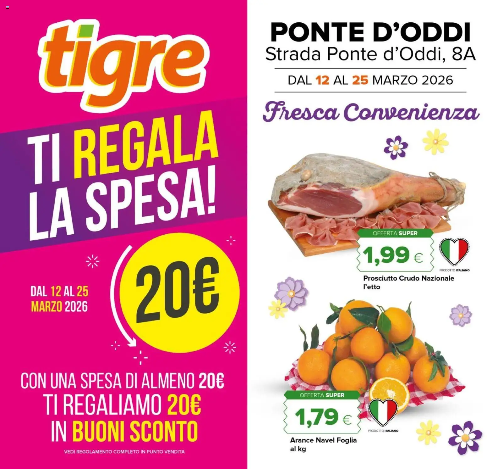 {"145694":[{"boxes":[{"content":"tigre","coord":[[52,28],[322,25],[333,169],[61,185]]},{"content":"PONTE D'ODDI","coord":[[426,32],[750,32],[750,68],[426,69]]},{"content":"Strada Ponte d'Oddi, 8A","coord":[[420,70],[757,70],[757,99],[420,100]]},{"content":"Fresca Convenienza","coord":[[418,157],[764,159],[764,196],[418,195]]},{"content":"TI REGALA","coord":[[29,212],[344,170],[352,254],[41,298]]},{"content":"LA SPESA","coord":[[38,301],[342,259],[354,342],[44,385]]},{"content":"OFFERTA SUPER","coord":[[594,365],[665,365],[665,375],[594,374]]},{"content":"PRODOTTO ITALIANO","coord":[[695,424],[749,425],[749,434],[695,433]]},{"content":"Prosciutto Crudo Nazionale","coord":[[576,435],[724,435],[724,447],[576,447]]},{"content":"DAL 12 AL 25","coord":[[47,451],[140,452],[140,472],[47,471]]},{"content":"l'etto","coord":[[578,451],[605,451],[605,461],[578,461]]},{"content":"CON UNA SPESA DI ALMENO 20\u20ac","coord":[[29,590],[358,589],[358,619],[29,620]]},{"content":"TI REGALIAMO 20\u20ac","coord":[[68,624],[319,624],[319,661],[68,661]]},{"content":"OFFERTA SUPER","coord":[[476,623],[548,624],[548,631],[476,631]]},{"content":"IN BUONI SCONTO","coord":[[76,666],[319,665],[319,703],[76,704]]},{"content":"PRODOTTO ITALIANO","coord":[[584,681],[634,681],[634,688],[584,687]]},{"content":"Arance Navel Foglia","coord":[[460,694],[569,693],[569,705],[460,705]]},{"content":"VEDI REGOLAMENTO COMPLETO IN PUNTO VENDITA","coord":[[100,712],[293,712],[293,722],[100,722]]},{"content":"al kg","coord":[[462,708],[485,708],[485,718],[462,718]]}]}]}Le offerte sono valide dal 12/03/2026 - 25/03/2026, ma attenzione: gli sconti sono disponibili solo per un periodo limitato! Sfoglia subito il volantino e scopri prezzi straordinari su frutta e verdura, carne e pesce, latticini e prodotti da forno. Ogni settimana, Tigre ti garantisce la massima qualità a prezzi imbattibili.