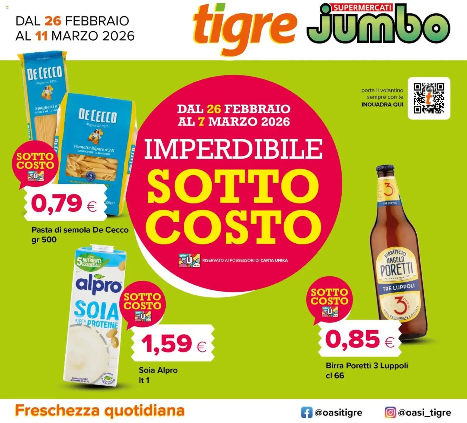 {"143885":[{"boxes":[{"content":"tigre Jumbo","coord":[[317,1],[739,0],[740,87],[317,99]]},{"content":"DAL 26 FEBBRAIO","coord":[[24,24],[215,23],[215,43],[24,44]]},{"content":"DE CECCO","coord":[[44,113],[102,106],[104,127],[45,134]]},{"content":"porta il volantino","coord":[[598,145],[669,144],[669,154],[599,155]]},{"content":"sempre con te","coord":[[608,157],[669,157],[669,165],[608,165]]},{"content":"Spaghettin","coord":[[57,177],[95,173],[95,180],[58,184]]},{"content":"DE CECCO","coord":[[131,177],[196,186],[193,206],[128,198]]},{"content":"DAL 26 FEBBRAIO","coord":[[291,170],[485,170],[485,190],[291,190]]},{"content":"INQUADRA QUI","coord":[[599,168],[670,168],[670,178],[599,178]]},{"content":"IMPERDIBILE","coord":[[236,227],[538,227],[537,266],[236,266]]},{"content":"SOTTO","coord":[[28,251],[90,252],[90,267],[28,267]]},{"content":"COTTURA IO MOS AL DENTE E NON","coord":[[127,247],[184,253],[183,259],[127,252]]},{"content":"COSTO","coord":[[28,266],[89,264],[89,280],[28,282]]},{"content":"SOTTO","coord":[[242,278],[529,278],[529,342],[242,342]]},{"content":"TRE LUPPOU","coord":[[635,335],[660,333],[661,340],[635,342]]},{"content":"COSTO","coord":[[245,344],[535,347],[534,410],[245,410]]},{"content":"Pasta di semola De Cecco","coord":[[51,374],[213,374],[213,388],[51,388]]},{"content":"NUTRIENTI","coord":[[132,426],[167,428],[167,437],[132,436]]},{"content":"ESSENZIALI","coord":[[135,434],[166,436],[166,444],[134,442]]},{"content":"RISERVATO AI POSSESSORI DI CARTA UNIKA","coord":[[336,426],[478,426],[478,436],[336,436]]},{"content":"BIRRIFICIO","coord":[[636,417],[674,414],[675,425],[637,428]]},{"content":"ANGELO","coord":[[641,428],[670,424],[671,434],[642,438]]},{"content":"alpro","coord":[[124,453],[203,458],[202,494],[122,489]]},{"content":"PORETTI","coord":[[630,438],[687,432],[687,454],[632,459]]},{"content":"VALGANNA DAL SETT","coord":[[637,460],[683,455],[683,460],[637,465]]},{"content":"SOTTO","coord":[[515,476],[578,475],[578,492],[515,492]]},{"content":"TRE LUPPOLI","coord":[[634,475],[688,469],[689,478],[635,484]]},{"content":"SOIA","coord":[[122,495],[201,502],[199,532],[119,526]]},{"content":"SOTTO","coord":[[204,483],[267,482],[268,500],[204,501]]},{"content":"COSTO","coord":[[202,499],[267,498],[267,514],[202,516]]},{"content":"COSTO","coord":[[513,490],[579,484],[580,503],[513,508]]},{"content":"RISCA PROTEINE","coord":[[123,528],[198,534],[197,547],[122,539]]},{"content":"LA EQUILIBRATA E MALTO","coord":[[637,517],[694,510],[695,525],[639,530]]},{"content":"Soia Alpro","coord":[[230,607],[295,607],[295,621],[230,621]]},{"content":"It 1","coord":[[229,625],[247,625],[246,635],[229,635]]},{"content":"cl 66","coord":[[539,617],[570,617],[570,629],[539,629]]},{"content":"Freschezza quotidiana","coord":[[23,668],[307,668],[307,694],[23,694]]},{"content":"@oasitigre","coord":[[521,677],[602,677],[602,694],[521,694]]},{"content":"@oasitigre","coord":[[660,677],[750,677],[750,694],[660,693]]}]}]}Le offerte sono valide dal 26/02/2026 - 11/03/2026, ma attenzione: gli sconti sono disponibili solo per un periodo limitato! Sfoglia subito il volantino e scopri prezzi straordinari su frutta e verdura, carne e pesce, latticini e prodotti da forno. Ogni settimana, Tigre ti garantisce la massima qualità a prezzi imbattibili.