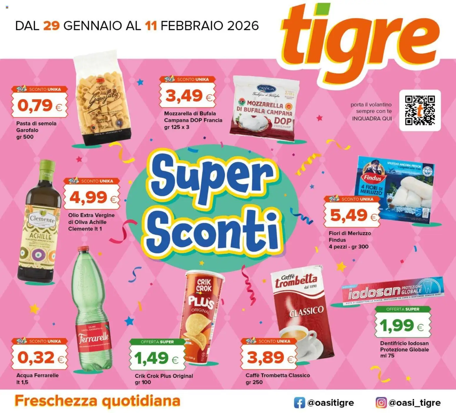 {"140045":[{"boxes":[{"content":"tigre","coord":[[473,0],[753,14],[751,160],[471,140]]},{"content":"EU SCONTO UNIKA","coord":[[280,130],[355,131],[355,139],[280,138]]},{"content":"CU SCONTO UNIKA","coord":[[29,147],[103,147],[103,155],[29,154]]},{"content":"FRANCA","coord":[[437,145],[466,148],[465,154],[436,151]]},{"content":"MOZZARELLA","coord":[[419,169],[482,174],[481,185],[418,179]]},{"content":"DI BUFALA CAMPANA","coord":[[402,179],[496,188],[495,199],[401,189]]},{"content":"porta il volantino","coord":[[595,174],[665,173],[665,181],[595,182]]},{"content":"Mozzarella di Bufala","coord":[[278,188],[367,188],[367,197],[278,197]]},{"content":"sempre con te","coord":[[604,185],[666,184],[666,193],[604,193]]},{"content":"Pasta di semola","coord":[[26,205],[95,205],[95,214],[26,214]]},{"content":"Campana DOP Francia","coord":[[279,199],[377,199],[377,208],[279,209]]},{"content":"INQUADRA QUI","coord":[[597,195],[667,195],[667,206],[597,206]]},{"content":"Garofalo","coord":[[27,217],[65,217],[65,225],[27,225]]},{"content":"PASTA DI SHAGRAKO IST","coord":[[160,225],[206,219],[207,225],[160,231]]},{"content":"Super","coord":[[248,250],[467,262],[469,353],[242,345]]},{"content":"SFILETZATI ANCORA FRESCHE","coord":[[657,274],[716,280],[715,286],[657,280]]},{"content":"CAMIAS","coord":[[615,289],[624,277],[628,279],[619,292]]},{"content":"SU SCONTO UNIKA","coord":[[116,302],[191,303],[191,311],[116,310]]},{"content":"Findus","coord":[[618,296],[648,299],[647,308],[617,305]]},{"content":"4 FIORI DI","coord":[[613,312],[650,317],[649,324],[613,320]]},{"content":"MERLUZZO","coord":[[612,321],[649,324],[649,331],[611,328]]},{"content":"SCONTO UNIKA","coord":[[580,335],[635,335],[635,342],[580,342]]},{"content":"Sconti","coord":[[249,351],[475,352],[475,431],[245,429]]},{"content":"Clemente","coord":[[51,366],[94,371],[92,380],[50,374]]},{"content":"Olio Extra Vergine","coord":[[115,361],[194,361],[194,370],[115,370]]},{"content":"di Oliva Achille","coord":[[115,373],[181,373],[181,382],[115,381]]},{"content":"Clemente It 1","coord":[[115,384],[174,384],[174,393],[115,393]]},{"content":"ACHILLE","coord":[[50,395],[89,399],[88,408],[49,404]]},{"content":"Fiori di Merluzzo","coord":[[558,392],[631,392],[631,400],[558,400]]},{"content":"OLIO EXTRA VERGINE DI OLTRE","coord":[[42,404],[93,409],[92,413],[42,408]]},{"content":"Findus","coord":[[558,403],[588,404],[588,412],[558,411]]},{"content":"CROK","coord":[[334,474],[361,476],[360,498],[332,495]]},{"content":"Caff\u00e8","coord":[[471,469],[503,463],[505,474],[473,480]]},{"content":"Lrombella","coord":[[466,476],[538,462],[540,478],[469,491]]},{"content":"PROTEZIONE","coord":[[680,485],[717,482],[718,492],[681,496]]},{"content":"PLU'S","coord":[[320,501],[368,507],[367,526],[318,519]]},{"content":"iodoson GLOBALEN","coord":[[590,491],[733,486],[734,501],[592,510]]},{"content":"E GENGIVE SANE","coord":[[717,500],[751,497],[751,502],[717,505]]},{"content":"PROTEGGERE BA CABIR E WANT","coord":[[650,507],[710,501],[710,505],[650,511]]},{"content":"AIUTA A COMBATTERE LA PLACEA","coord":[[586,513],[649,507],[649,511],[586,518]]},{"content":"ORIGINAL","coord":[[325,522],[357,527],[355,535],[324,529]]},{"content":"CLASSICO","coord":[[490,527],[549,518],[551,531],[492,541]]},{"content":"OFFERTA SUPER","coord":[[654,522],[712,522],[712,529],[654,529]]},{"content":"USCIA, GASSATA O","coord":[[137,559],[175,555],[175,559],[137,564]]},{"content":"Ferrarelle","coord":[[132,568],[183,563],[184,580],[133,584]]},{"content":"SCONTO UNIKA","coord":[[42,576],[103,576],[103,584],[42,583]]},{"content":"OFFERTA SUPER","coord":[[237,577],[294,577],[294,584],[237,584]]},{"content":"ZU SCONTO UNIKA","coord":[[419,575],[493,576],[492,584],[418,582]]},{"content":"Dentifricio lodosan","coord":[[645,579],[729,579],[729,588],[645,588]]},{"content":"Protezione Globale","coord":[[646,590],[729,590],[729,598],[646,598]]},{"content":"ml 75","coord":[[646,601],[670,601],[670,608],[646,608]]},{"content":"Acqua Ferrarelle","coord":[[27,633],[100,633],[100,642],[27,643]]},{"content":"Crik Crok Plus Original","coord":[[228,633],[328,633],[328,645],[228,645]]},{"content":"Caff\u00e8 Trombetta Classico","coord":[[416,633],[527,633],[527,642],[416,642]]},{"content":"Freschezza quotidiana","coord":[[24,668],[308,669],[307,694],[24,693]]},{"content":"@oasitigre","coord":[[518,677],[601,677],[601,694],[518,693]]},{"content":"@oasitigre","coord":[[660,677],[750,677],[750,694],[660,693]]}]}]}Le offerte sono valide dal 28/01/2026 - 11/02/2026, ma attenzione: gli sconti sono disponibili solo per un periodo limitato! Sfoglia subito il volantino e scopri prezzi straordinari su frutta e verdura, carne e pesce, latticini e prodotti da forno. Ogni settimana, Tigre ti garantisce la massima qualità a prezzi imbattibili.