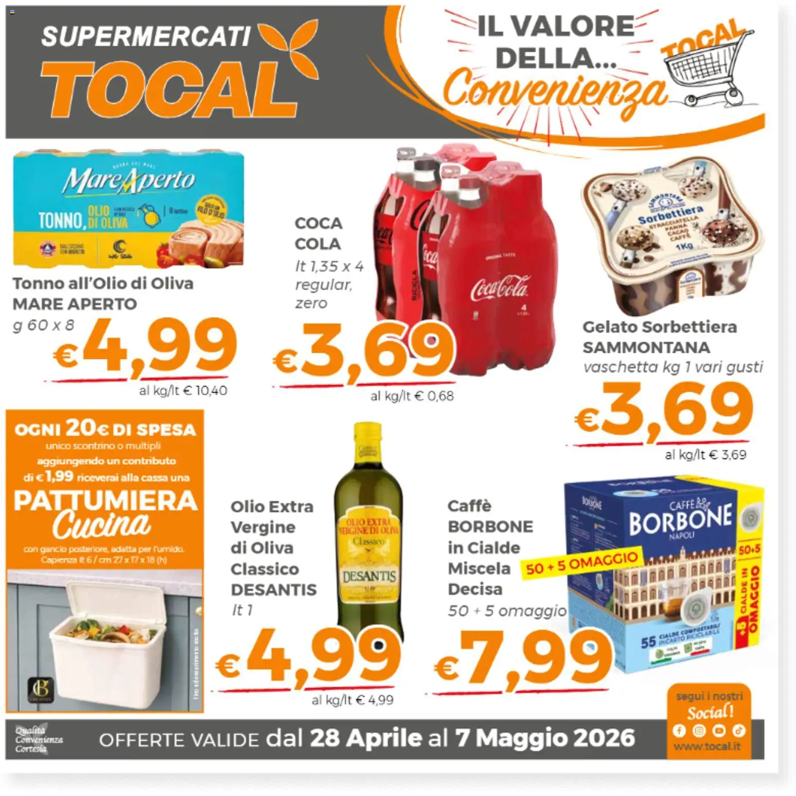 Il nuovo volantino Tocal è sfogliabile online comodamente da casa o dal tuo smartphone, così puoi scoprire in pochi secondi tutte le offerte attive. All’interno troverai informazioni chiare su quali prodotti sono in sconto e fino a quando sono validi (28/04/2026 - 07/05/2026), per aiutarti a cogliere al volo le promozioni prima che finiscano. Ogni settimana sono disponibili sconti su alimentari freschi, prodotti per la casa e articoli stagionali, perfetti per pianificare la spesa senza stress e con il massimo risparmio!