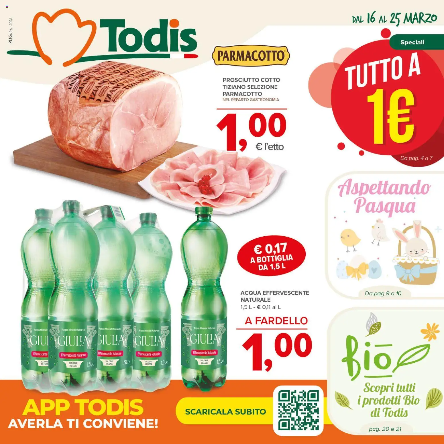 {"146393":[{"boxes":[{"content":"Todis","coord":[[166,26],[349,29],[348,107],[164,103]]},{"content":"DAL 16 AL 25 MARZO","coord":[[612,19],[764,18],[764,45],[612,46]]},{"content":"Speciali","coord":[[697,69],[740,67],[741,78],[698,79]]},{"content":"PARMACOTTO","coord":[[378,86],[496,86],[496,107],[378,107]]},{"content":"TUTTO A","coord":[[597,116],[733,88],[741,131],[603,157]]},{"content":"PROSCIUTTO COTTO","coord":[[387,133],[490,133],[490,144],[387,144]]},{"content":"TIZIANO SELEZIONE","coord":[[386,146],[485,146],[485,156],[387,156]]},{"content":"PARMACOTTO","coord":[[388,159],[458,159],[458,167],[388,167]]},{"content":"NEL REPARTO GASTRONOMIA","coord":[[387,169],[487,169],[487,177],[387,177]]},{"content":"\u20ac l'etto","coord":[[441,246],[494,247],[494,266],[441,264]]},{"content":"Da pag. 4 a 7","coord":[[698,270],[756,269],[756,281],[698,281]]},{"content":"Aspettando","coord":[[589,310],[749,310],[749,344],[589,343]]},{"content":"Pasqua\u00ae","coord":[[618,340],[728,344],[727,377],[616,378]]},{"content":"A BOTTIGLIA","coord":[[436,447],[510,442],[511,454],[436,460]]},{"content":"ACQUA EFFERVESCENTE","coord":[[420,505],[540,505],[540,516],[420,516]]},{"content":"Da pag 8 a 10","coord":[[636,506],[701,506],[701,517],[636,518]]},{"content":"NATURALE","coord":[[419,517],[471,517],[471,528],[419,528]]},{"content":"A FARDELLO","coord":[[425,551],[538,550],[538,567],[425,569]]},{"content":"Acosa Midinerain Naturale","coord":[[107,573],[149,573],[149,578],[107,577]]},{"content":"Acqua Minerale Naturale","coord":[[171,571],[211,571],[211,576],[171,576]]},{"content":"Acqua Minerale Naturale","coord":[[337,570],[376,570],[376,575],[337,575]]},{"content":"GIUL GIULIA","coord":[[42,582],[158,582],[158,605],[42,605]]},{"content":"GIULIA\u00ae","coord":[[170,580],[221,581],[223,601],[170,603]]},{"content":"GIULIA GIULIA","coord":[[101,584],[228,583],[228,603],[101,606]]},{"content":"GIULIA","coord":[[229,583],[285,582],[286,603],[229,604]]},{"content":"GIULIA\u00ae","coord":[[331,578],[391,581],[392,599],[332,601]]},{"content":"Effervescante","coord":[[57,614],[82,615],[82,621],[57,620]]},{"content":"Effervescente Naturale","coord":[[105,617],[149,617],[149,624],[105,624]]},{"content":"Effervescente Naturale","coord":[[170,613],[212,613],[212,620],[170,619]]},{"content":"Eltervescente Naturale","coord":[[239,614],[279,614],[279,621],[239,621]]},{"content":"Effervescente Naturale","coord":[[336,611],[377,612],[377,618],[336,618]]},{"content":"DAL CUORE","coord":[[119,631],[135,631],[135,636],[119,636]]},{"content":"DASCUOLE","coord":[[252,629],[266,629],[266,633],[252,633]]},{"content":"DIE LANEO","coord":[[252,633],[265,633],[266,637],[253,637]]},{"content":"DELLAZO","coord":[[349,631],[363,631],[363,635],[350,635]]},{"content":"Scopri tutti","coord":[[633,666],[727,665],[727,687],[633,687]]},{"content":"APP TODIS","coord":[[36,693],[251,693],[251,728],[36,727]]},{"content":"i prodotti Bio","coord":[[622,688],[733,687],[733,709],[622,710]]},{"content":"SCARICALA SUBITO","coord":[[322,711],[464,711],[464,725],[322,724]]},{"content":"AVERLA TI CONVIENE","coord":[[11,728],[278,727],[278,749],[11,749]]},{"content":"di Todis","coord":[[644,710],[712,710],[712,729],[644,729]]},{"content":"pag. 20 e 21","coord":[[641,743],[701,742],[701,755],[641,756]]}]}]}Le offerte sono valide dal 16/03/2026 - 25/03/2026, ma attenzione: gli sconti sono disponibili solo per un periodo limitato! Sfoglia subito il volantino e scopri prezzi straordinari su frutta e verdura, carne e pesce, latticini e prodotti da forno. Ogni settimana, Todis ti garantisce la massima qualità a prezzi imbattibili.