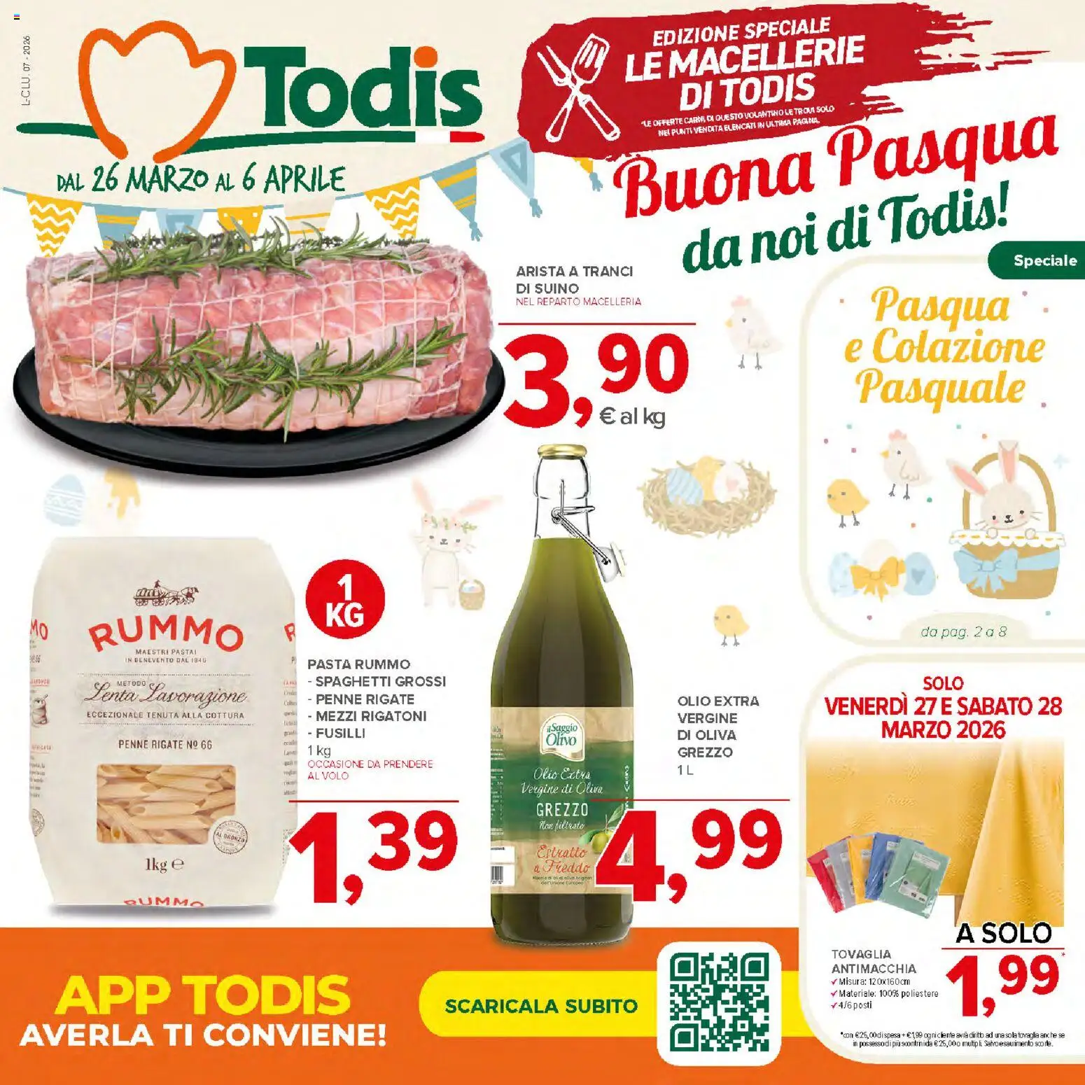 {"148294":[{"boxes":[{"content":"Todis","coord":[[172,31],[348,28],[349,102],[172,102]]},{"content":"EDIZIONE SPECIALE","coord":[[463,19],[592,9],[593,23],[463,33]]},{"content":"LE MACELLERIE","coord":[[446,36],[619,24],[621,45],[447,59]]},{"content":"DI TODIS","coord":[[483,57],[582,49],[584,73],[485,81]]},{"content":"LE OFFERTE CARNI DI QUE STO VOLANTINO LE TROVI SOLO","coord":[[457,85],[596,73],[596,80],[457,91]]},{"content":"NEI PUNTI VENDITA ELENCATI IN ULTIMA PAGINA.","coord":[[469,92],[586,82],[586,88],[469,98]]},{"content":"DAL 26 MARZO AL 6 APRILE","coord":[[37,115],[249,115],[249,138],[37,139]]},{"content":"Buona Pasqua","coord":[[437,110],[751,68],[758,121],[444,161]]},{"content":"da noi di Todis","coord":[[482,160],[722,124],[728,164],[488,201]]},{"content":"ARISTA A TRANCI","coord":[[367,187],[455,186],[455,199],[367,199]]},{"content":"Speciale","coord":[[723,180],[769,180],[769,192],[723,192]]},{"content":"DI SUINO","coord":[[368,201],[413,201],[413,210],[368,210]]},{"content":"Pasqua`.","coord":[[619,202],[751,202],[751,234],[619,234]]},{"content":"NEL REPARTO MACELLERIA","coord":[[367,211],[459,211],[459,218],[367,218]]},{"content":"e Colazione","coord":[[601,233],[747,234],[747,262],[601,261]]},{"content":"Pasquale .","coord":[[609,262],[749,263],[748,295],[609,294]]},{"content":"\u20ac al kg","coord":[[425,287],[478,288],[477,308],[424,306]]},{"content":"RUMMO","coord":[[63,438],[178,438],[178,467],[64,467]]},{"content":"da pag. 2 a 8","coord":[[656,446],[721,445],[721,456],[656,457]]},{"content":"MAESTRI PASTAI","coord":[[90,459],[147,459],[147,469],[90,469]]},{"content":"PASTA RUMMO","coord":[[219,469],[293,470],[293,478],[219,478]]},{"content":"Lenta Lavorazione","coord":[[62,487],[176,490],[176,504],[62,502]]},{"content":"SPAGHETTI GROSSI","coord":[[219,482],[319,482],[319,491],[219,490]]},{"content":"SOLO","coord":[[657,481],[687,480],[686,493],[656,492]]},{"content":"PENNE RIGATE","coord":[[218,495],[296,495],[296,503],[218,503]]},{"content":"OLIO EXTRA","coord":[[484,494],[544,494],[544,506],[484,505]]},{"content":"VERGINE","coord":[[482,507],[525,506],[525,517],[482,518]]},{"content":"VENERD\u00cc 27 E SABATO 28","coord":[[588,495],[759,496],[759,512],[588,511]]},{"content":"ECCEZIONALE TENUTA ALLA COTTURA","coord":[[60,507],[175,507],[175,513],[60,513]]},{"content":"MEZZI RIGATONI","coord":[[219,507],[305,506],[305,515],[219,515]]},{"content":"iSaggio","coord":[[389,516],[412,516],[412,522],[389,523]]},{"content":"PENNE RIGATE N\u00ba 66","coord":[[84,527],[152,528],[152,535],[84,535]]},{"content":"FUSILLI","coord":[[218,519],[261,519],[261,527],[218,527]]},{"content":"DI OLIVA","coord":[[483,519],[527,519],[527,530],[483,530]]},{"content":"Olivo","coord":[[389,523],[412,523],[412,532],[389,532]]},{"content":"GREZZO","coord":[[483,532],[523,532],[523,541],[483,541]]},{"content":"OCCASIONE DA PRENDERE","coord":[[218,541],[309,541],[309,549],[218,549]]},{"content":"AL VOLO","coord":[[219,550],[249,550],[249,557],[219,557]]},{"content":"Olio Extra","coord":[[379,547],[422,548],[422,557],[379,557]]},{"content":"Vergine di Oliva","coord":[[371,557],[431,557],[430,568],[371,568]]},{"content":"GREZZO","coord":[[383,571],[421,572],[421,584],[383,583]]},{"content":"Non filtrato","coord":[[384,586],[419,587],[419,594],[384,593]]},{"content":"BRONZO","coord":[[158,594],[175,597],[174,603],[158,599]]},{"content":"Ertratto","coord":[[381,602],[420,602],[420,615],[381,614]]},{"content":"a Freddo","coord":[[380,614],[423,613],[423,624],[380,624]]},{"content":"QUMMO","coord":[[87,639],[146,641],[146,650],[87,647]]},{"content":"A SOLO","coord":[[680,656],[751,656],[751,675],[680,674]]},{"content":"TOVAGLIA","coord":[[593,677],[638,677],[638,685],[593,684]]},{"content":"APP TODIS","coord":[[37,693],[251,693],[251,726],[37,727]]},{"content":"ANTIMACCHIA","coord":[[593,687],[655,687],[655,695],[593,695]]},{"content":"SCARICALA SUBITO","coord":[[316,711],[456,711],[456,724],[316,724]]},{"content":"\u00a54\/6 posti","coord":[[592,714],[623,714],[623,721],[592,721]]},{"content":"AVERLA TI CONVIENE","coord":[[11,728],[278,728],[278,749],[11,749]]}]}]}Le offerte sono valide dal 26/03/2026 - 06/04/2026, ma attenzione: gli sconti sono disponibili solo per un periodo limitato! Sfoglia subito il volantino e scopri prezzi straordinari su frutta e verdura, carne e pesce, latticini e prodotti da forno. Ogni settimana, Todis ti garantisce la massima qualità a prezzi imbattibili.