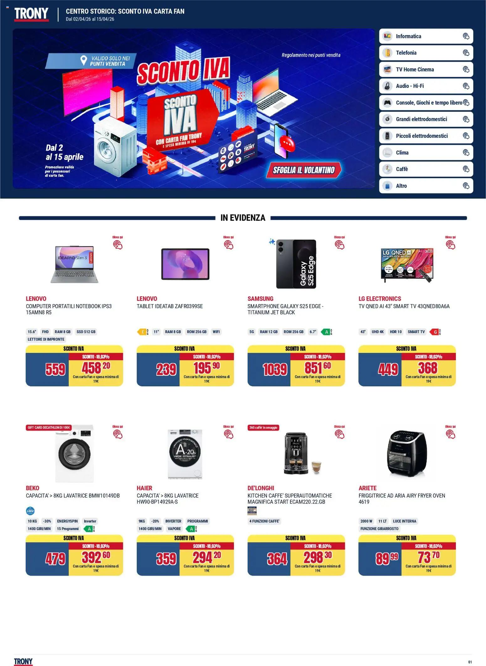 Le promozioni sono valide dal 02/04/2026 - 15/04/2026, ma fai attenzione: gli sconti sono limitati nel tempo e i prodotti più richiesti potrebbero terminare presto. Non perdere l’occasione di scoprire cosa Trony ha preparato per te questa settimana: prezzi imbattibili e qualità garantita!