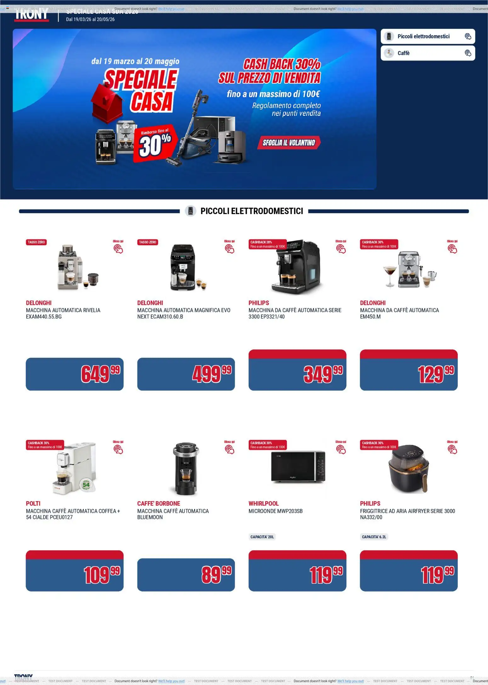 {"147116":[{"boxes":[{"content":"EST DOCUMENT 32","coord":[[26,11],[97,12],[97,20],[26,18]]},{"content":"Document doesn't look right We'll help you out","coord":[[181,11],[294,11],[294,16],[181,16]]},{"content":"FEST DOCUMENTS","coord":[[410,11],[455,11],[455,16],[410,16]]},{"content":"Document doesn't look right We'll help you out 31 BOCUM PorFIMEN ESEPPESKEM","coord":[[464,10],[742,11],[742,19],[464,18]]},{"content":"Docume","coord":[[748,11],[769,11],[769,17],[748,17]]},{"content":"TRONT","coord":[[25,18],[77,18],[77,31],[25,31]]},{"content":"Piccoli elettrodomestici","coord":[[627,51],[716,51],[716,62],[627,62]]},{"content":"Caff\u00e8","coord":[[630,78],[653,79],[653,89],[630,88]]},{"content":"dal 19 marzo al 20 maggio","coord":[[144,91],[285,91],[285,103],[144,102]]},{"content":"SPECIALE","coord":[[162,108],[284,108],[284,144],[162,144]]},{"content":"SUL PREZZO DI VENDITA","coord":[[343,112],[508,113],[508,133],[343,133]]},{"content":"CASA","coord":[[209,145],[276,145],[276,176],[208,176]]},{"content":"Regolamento completo","coord":[[400,162],[511,160],[512,172],[400,174]]},{"content":"nei punti vendita","coord":[[432,174],[509,175],[509,185],[432,184]]},{"content":"Rimborso fino al","coord":[[221,207],[270,203],[271,210],[221,213]]},{"content":"SFOGLIA IL VOLANTINO","coord":[[416,219],[500,219],[500,231],[416,231]]},{"content":"PICCOLI ELETTRODOMESTICI","coord":[[298,327],[483,327],[483,341],[298,341]]},{"content":"TASSO ZERO","coord":[[44,381],[70,381],[70,388],[44,387]]},{"content":"Clicca qui","coord":[[179,380],[196,380],[196,385],[179,385]]},{"content":"TASSO ZERO","coord":[[219,381],[247,381],[247,388],[219,388]]},{"content":"Clicca qui","coord":[[532,380],[550,380],[550,385],[532,385]]},{"content":"Clicca qu","coord":[[709,380],[726,381],[726,387],[710,386]]},{"content":"DELONGHI","coord":[[41,476],[82,476],[82,485],[41,484]]},{"content":"DELONGHI","coord":[[217,476],[259,476],[259,485],[217,484]]},{"content":"PHILIPS","coord":[[393,475],[427,475],[427,485],[393,485]]},{"content":"DELONGHI","coord":[[571,476],[612,476],[612,484],[571,484]]},{"content":"MACCHINA AUTOMATICA RIVELIA","coord":[[40,488],[159,488],[159,496],[40,496]]},{"content":"MACCHINA AUTOMATICA MAGNIFICA EVO","coord":[[217,488],[365,488],[365,496],[217,496]]},{"content":"MACCHINA DA CAFF\u00c8 AUTOMATICA SERIE","coord":[[394,487],[542,487],[542,496],[394,496]]},{"content":"MACCHINA DA CAFF\u00c8 AUTOMATICA","coord":[[571,488],[697,487],[697,496],[571,496]]},{"content":"Clicca Ou","coord":[[178,699],[195,700],[196,705],[179,704]]},{"content":"Clicca qui","coord":[[356,699],[373,699],[373,704],[356,704]]},{"content":"Clicca qui","coord":[[533,699],[550,699],[550,703],[533,703]]},{"content":"Chicca qu","coord":[[710,699],[725,699],[726,707],[711,707]]},{"content":"POLTI","coord":[[40,795],[65,795],[65,803],[40,803]]},{"content":"CAFFE' BORBONE","coord":[[217,794],[287,794],[287,805],[216,805]]},{"content":"WHIRLPOOL","coord":[[394,795],[443,795],[443,803],[394,803]]},{"content":"PHILIPS","coord":[[570,793],[604,793],[604,804],[570,804]]},{"content":"MACCHINA CAFF\u00c8 AUTOMATICA COFFEA","coord":[[40,807],[191,806],[191,815],[40,815]]},{"content":"MACCHINA CAFF\u00c8 AUTOMATICA","coord":[[217,806],[331,806],[331,815],[217,815]]},{"content":"BLUEMOON","coord":[[217,817],[258,817],[258,825],[217,825]]},{"content":"TRALIV","coord":[[21,1070],[52,1069],[52,1075],[21,1076]]},{"content":"TEST DOCUMENT TEST DOCUMENT TEST DOCUMENT","coord":[[18,1079],[177,1079],[177,1084],[18,1084]]},{"content":"Document doesn't look right We'll help you out TEST DOCUMENT TEST DOCUMENT TEST DOCUMENT Document doesn't look right We'll help you out TEST DOCUMENT TEST DOCUMENT TEST DOCUMENT Documer","coord":[[180,1079],[771,1079],[771,1084],[180,1084]]}]}]}Le promozioni sono valide dal 19/03/2026 - 20/05/2026, ma fai attenzione: gli sconti sono limitati nel tempo e i prodotti più richiesti potrebbero terminare presto. Non perdere l’occasione di scoprire cosa Trony ha preparato per te questa settimana: prezzi imbattibili e qualità garantita!