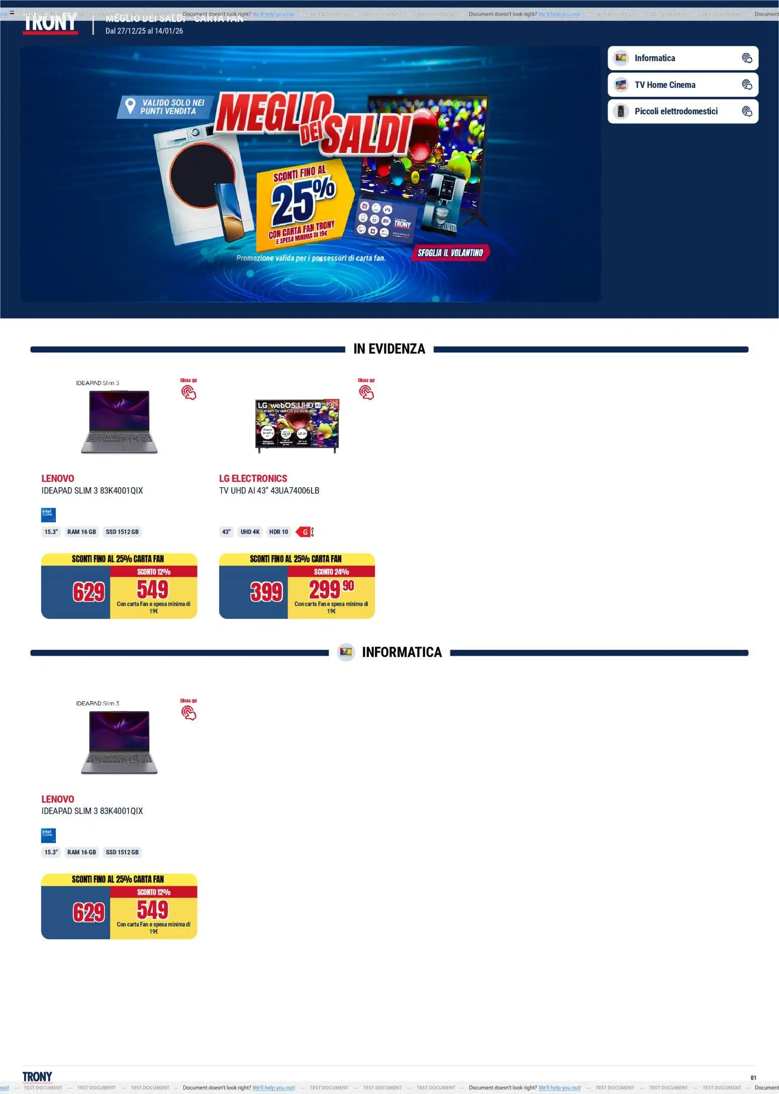 Le promozioni sono valide dal 27/12/2025 - 14/01/2026, ma fai attenzione: gli sconti sono limitati nel tempo e i prodotti più richiesti potrebbero terminare presto. Non perdere l’occasione di scoprire cosa Trony ha preparato per te questa settimana: prezzi imbattibili e qualità garantita!