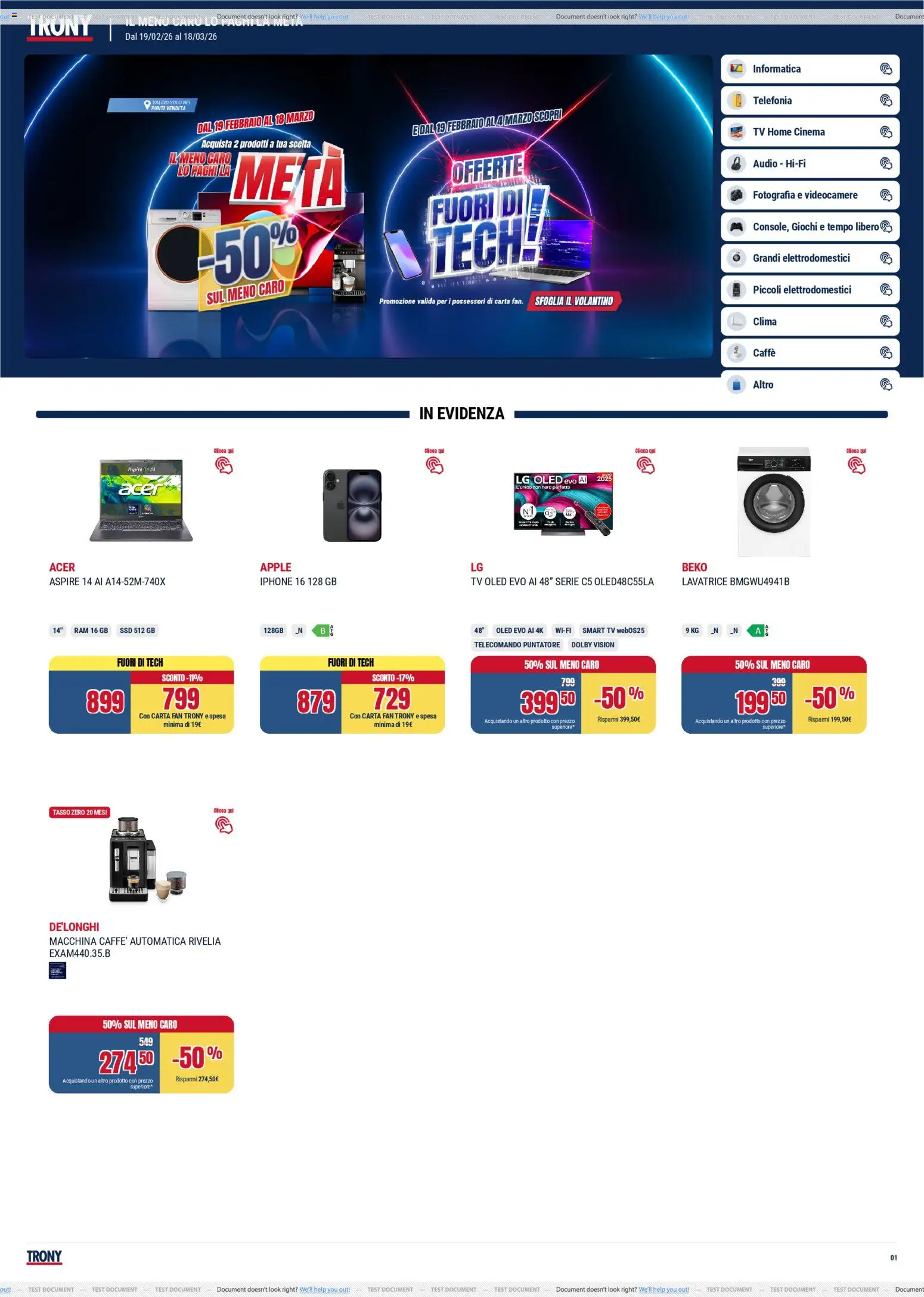 {"142691":[{"boxes":[{"content":"EST DOCUMENTI YES ROCEMEN","coord":[[24,10],[112,10],[112,18],[24,18]]},{"content":"L MENU CARU LO","coord":[[108,13],[180,14],[180,23],[108,22]]},{"content":"Document doesn't look right We'll help you out","coord":[[182,11],[293,11],[293,16],[182,16]]},{"content":"STEST DOCUMENT","coord":[[306,11],[357,11],[357,16],[306,16]]},{"content":"Document doesn't look right Well help you out","coord":[[464,10],[583,10],[583,16],[464,16]]},{"content":"Documen","coord":[[750,11],[773,11],[772,16],[750,16]]},{"content":"TRONT","coord":[[25,18],[81,19],[81,32],[24,31]]},{"content":"Informatica","coord":[[611,52],[672,52],[672,62],[611,62]]},{"content":"Telefonia","coord":[[612,77],[663,78],[663,90],[612,89]]},{"content":"PUNTI VENDITA","coord":[[121,86],[159,86],[159,93],[121,93]]},{"content":"DAL 19 FEBBRAIO AL 18 MARZO","coord":[[165,101],[263,91],[263,102],[165,113]]},{"content":"E DAL 19 FEBBRAIO AL 4 MARZO SCOPRI","coord":[[344,103],[473,89],[474,101],[344,115]]},{"content":"TV Home Cinema","coord":[[630,105],[693,105],[693,115],[630,115]]},{"content":"Acquista 2 prodotti a tua scelta","coord":[[167,116],[261,116],[261,124],[167,124]]},{"content":"IL MENO CARO","coord":[[141,127],[194,127],[194,137],[141,138]]},{"content":"LO PAGHI LA","coord":[[147,135],[195,135],[195,150],[147,150]]},{"content":"MET\u00c0","coord":[[196,123],[292,121],[291,174],[196,172]]},{"content":"OFFERTE","coord":[[377,133],[440,127],[442,148],[379,154]]},{"content":"Audio HiFi","coord":[[615,130],[677,131],[677,142],[615,142]]},{"content":"Fotografia e videocamere","coord":[[629,158],[721,158],[721,168],[629,168]]},{"content":"FUORI DIE","coord":[[359,163],[455,159],[456,182],[361,189]]},{"content":"TECH","coord":[[359,191],[454,179],[461,218],[364,231]]},{"content":"Console, Giochi e tempo libero","coord":[[627,184],[747,184],[747,195],[627,195]]},{"content":"O Grandi elettrodomestici","coord":[[612,211],[714,211],[714,221],[612,221]]},{"content":"SUL MENO CARO","coord":[[172,243],[238,233],[240,245],[173,256]]},{"content":"Piccoli elettrodomestici","coord":[[612,236],[714,236],[714,248],[612,248]]},{"content":"Promozione valida per i possessori di carta fan.","coord":[[316,248],[439,248],[439,256],[316,256]]},{"content":"SFOGLIA IL VOLANTINO","coord":[[449,247],[514,247],[514,256],[449,256]]},{"content":"Clima","coord":[[630,265],[651,265],[651,274],[629,274]]},{"content":"Caff\u00e8","coord":[[631,290],[653,291],[652,301],[630,300]]},{"content":"Altro","coord":[[630,317],[651,317],[651,326],[631,326]]},{"content":"IN EVIDENZA","coord":[[350,339],[423,339],[423,353],[350,353]]},{"content":"Clicca qui","coord":[[179,375],[196,376],[196,381],[180,381]]},{"content":"Cacca aul","coord":[[355,375],[373,375],[373,383],[356,383]]},{"content":"Aspire 14 AI","coord":[[91,389],[130,390],[130,396],[91,396]]},{"content":"acer","coord":[[99,405],[140,405],[140,415],[99,415]]},{"content":"LG OLED evo Al","coord":[[431,398],[491,398],[491,406],[431,405]]},{"content":"L'unico con nero perfetto","coord":[[432,406],[478,406],[478,410],[432,410]]},{"content":"ACER","coord":[[41,471],[63,471],[63,479],[41,479]]},{"content":"APPLE","coord":[[218,471],[245,471],[245,479],[218,479]]},{"content":"BEKO","coord":[[571,471],[593,471],[594,479],[571,479]]},{"content":"OLED EVO AI 4K","coord":[[414,525],[456,525],[456,531],[414,531]]},{"content":"WIFI","coord":[[464,525],[480,525],[480,531],[464,531]]},{"content":"SMART TV webOS25","coord":[[487,525],[541,525],[541,531],[487,531]]},{"content":"TELECOMANDO PUNTATORE","coord":[[396,537],[472,537],[472,544],[396,544]]},{"content":"DOLBY VISION","coord":[[477,537],[515,537],[515,543],[477,543]]},{"content":"FUORI DI TECH","coord":[[97,551],[137,551],[137,559],[97,559]]},{"content":"FUORI DI TECH","coord":[[274,551],[314,551],[314,559],[274,559]]},{"content":"Con CARTA FAN TRONY e spesa","coord":[[116,597],[189,597],[189,604],[116,603]]},{"content":"Con CARTA FAN TRONY e spesa","coord":[[292,597],[366,597],[366,604],[292,603]]},{"content":"minima di 19\u20ac","coord":[[136,604],[169,604],[169,610],[136,610]]},{"content":"minima di 19\u20ac","coord":[[312,605],[346,604],[346,610],[312,610]]},{"content":"Acquistando un altro prodotto con prezzo","coord":[[405,602],[482,602],[482,607],[405,607]]},{"content":"Acquistando un altro prodotto con prezzo","coord":[[582,602],[659,602],[659,607],[582,607]]},{"content":"Superiore*","coord":[[461,607],[481,607],[482,612],[461,612]]},{"content":"superiore*","coord":[[638,607],[658,607],[658,612],[638,612]]},{"content":"TASSO ZERO 20 MESI","coord":[[43,677],[91,677],[91,685],[43,685]]},{"content":"Cacca que","coord":[[179,677],[196,677],[196,682],[179,682]]},{"content":"DELONGHI","coord":[[41,772],[83,772],[83,781],[41,781]]},{"content":"MACCHINA CAFFE' AUTOMATICA RIVELIA","coord":[[41,784],[185,785],[185,793],[41,793]]},{"content":"Acquistandoun altro prosons einerone","coord":[[51,903],[130,907],[130,912],[51,908]]},{"content":"TRONY","coord":[[20,1048],[53,1048],[53,1060],[20,1061]]},{"content":"TEST DOCUMENT TEST DOCUMENT TEST DOCUMENT Document doesn't look right We'll help you out TEST DOCUMENT TEST DOCUMENT TEST DOCUMENTDocument doesn't look right We'll help you out TEST DOCUMENT TEST DOCUMENT TEST DOCUMENT","coord":[[19,1076],[744,1076],[744,1085],[19,1085]]},{"content":"Docum","coord":[[748,1076],[766,1077],[767,1084],[749,1084]]}]}]}Le promozioni sono valide dal 19/02/2026 - 18/03/2026, ma fai attenzione: gli sconti sono limitati nel tempo e i prodotti più richiesti potrebbero terminare presto. Non perdere l’occasione di scoprire cosa Trony ha preparato per te questa settimana: prezzi imbattibili e qualità garantita!