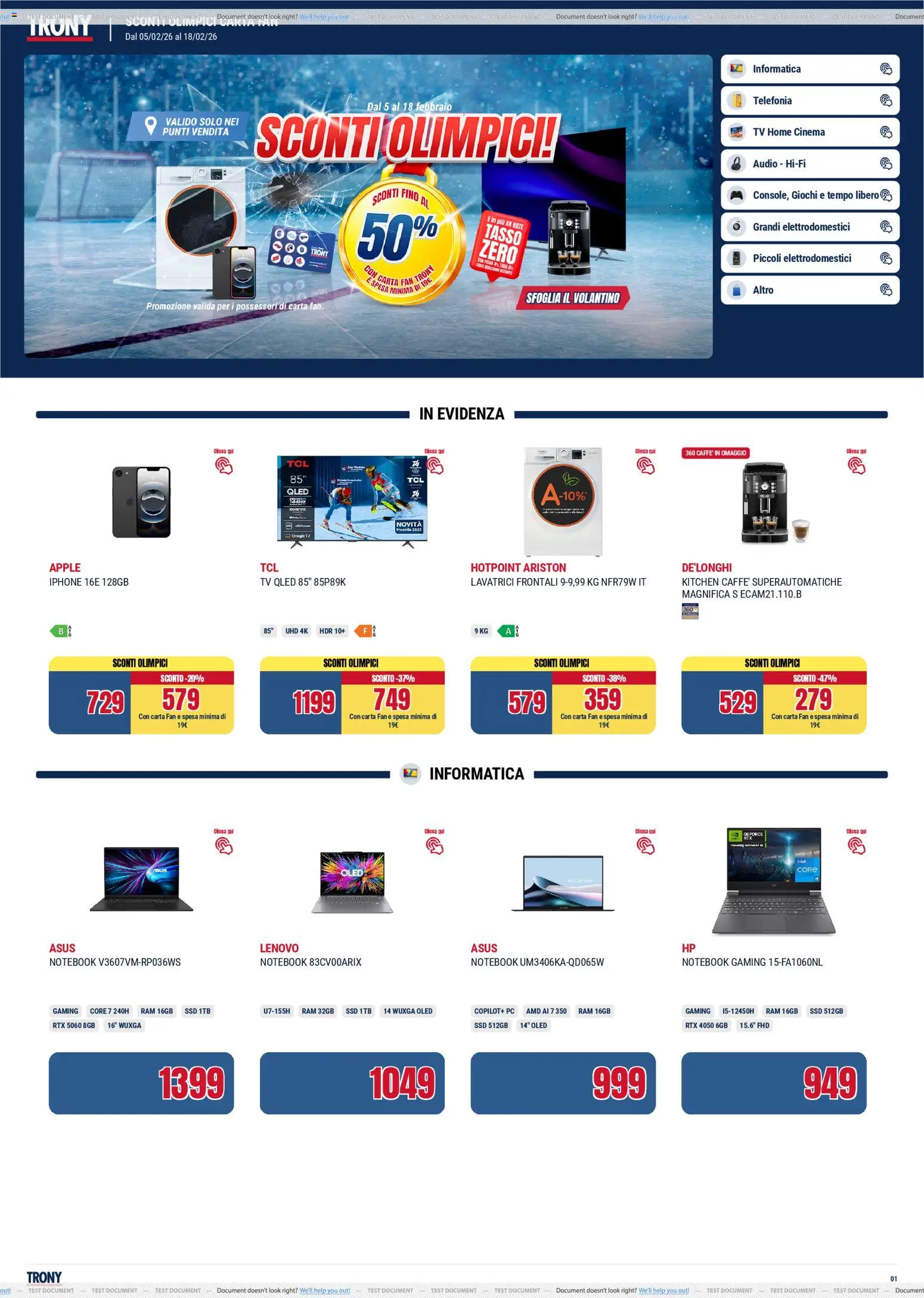 Le promozioni sono valide dal 05/02/2026 - 18/02/2026, ma fai attenzione: gli sconti sono limitati nel tempo e i prodotti più richiesti potrebbero terminare presto. Non perdere l’occasione di scoprire cosa Trony ha preparato per te questa settimana: prezzi imbattibili e qualità garantita!
